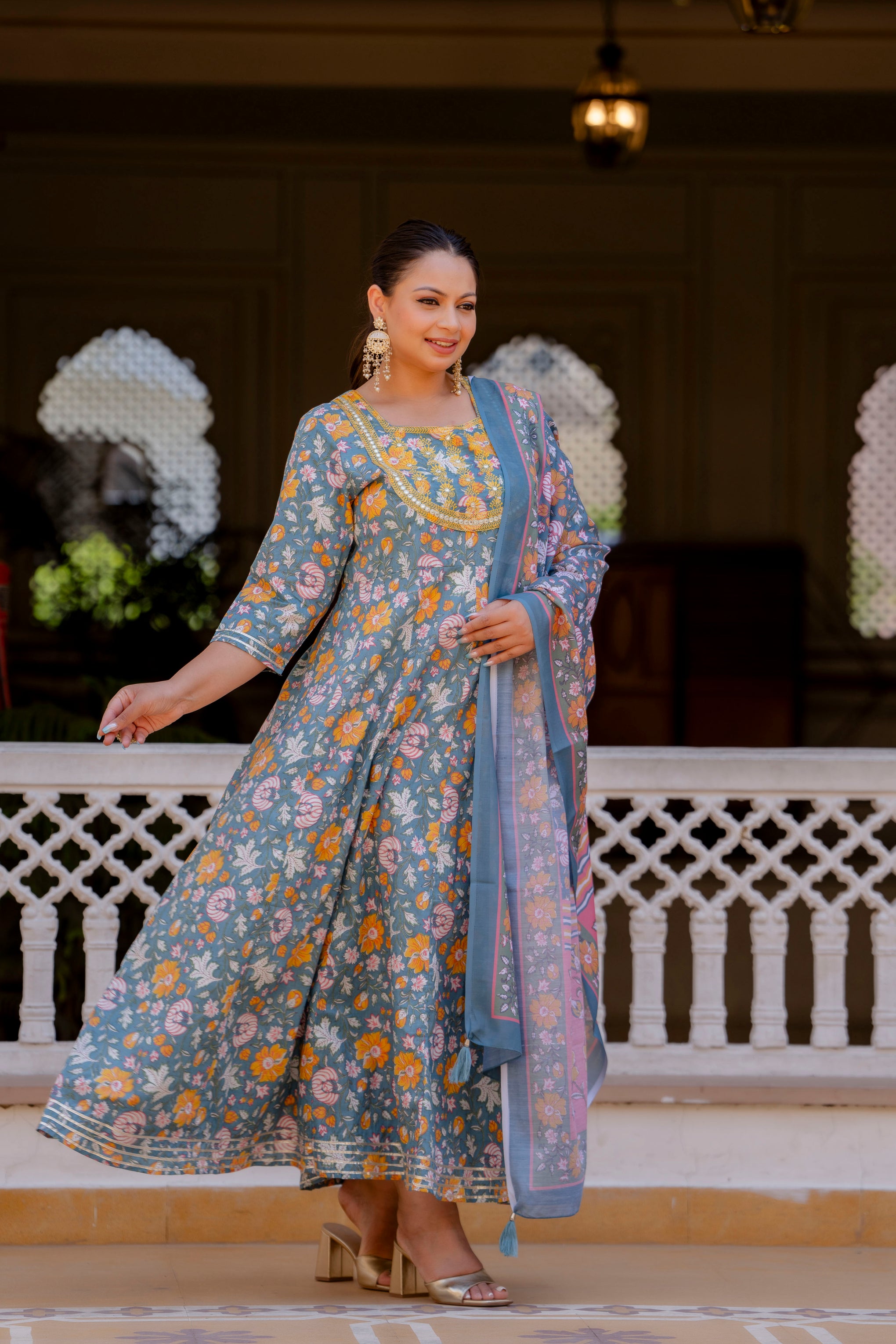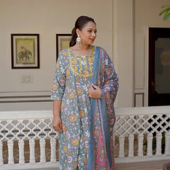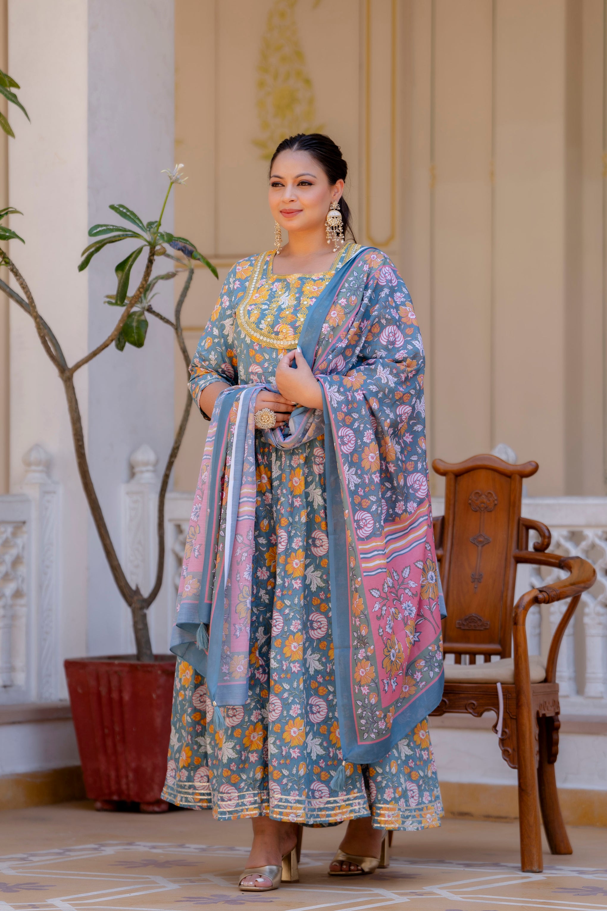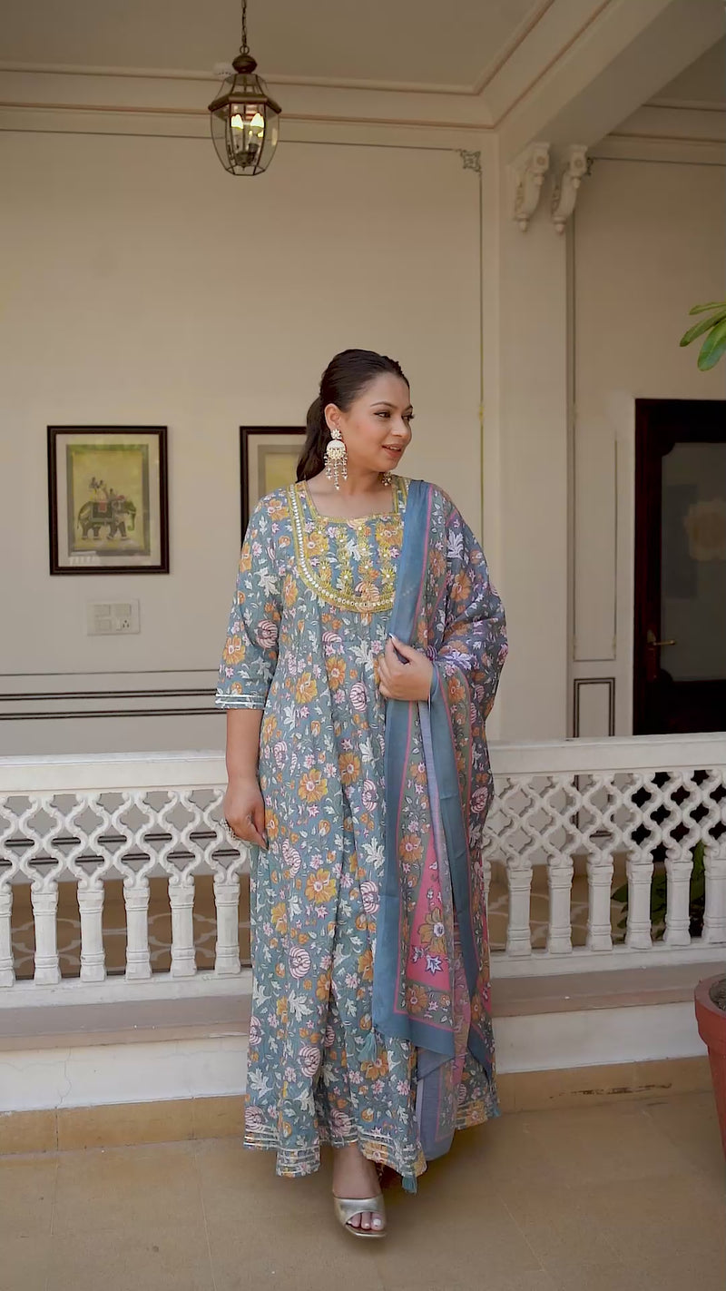 Upgrade your ethnic wardrobe with this Grey Cotton Anarkali With Dupatta Set. Crafted from soft and breathable cotton, this beautifully embroidered Anarkali offers a perfect blend of comfort and refined elegance. The stylish square neckline paired with three-quarter sleeves enhances its graceful silhouette. Completed with a matching dupatta, this set is ideal for festive occasions, pooja ceremonies, family functions, and cultural celebrations.