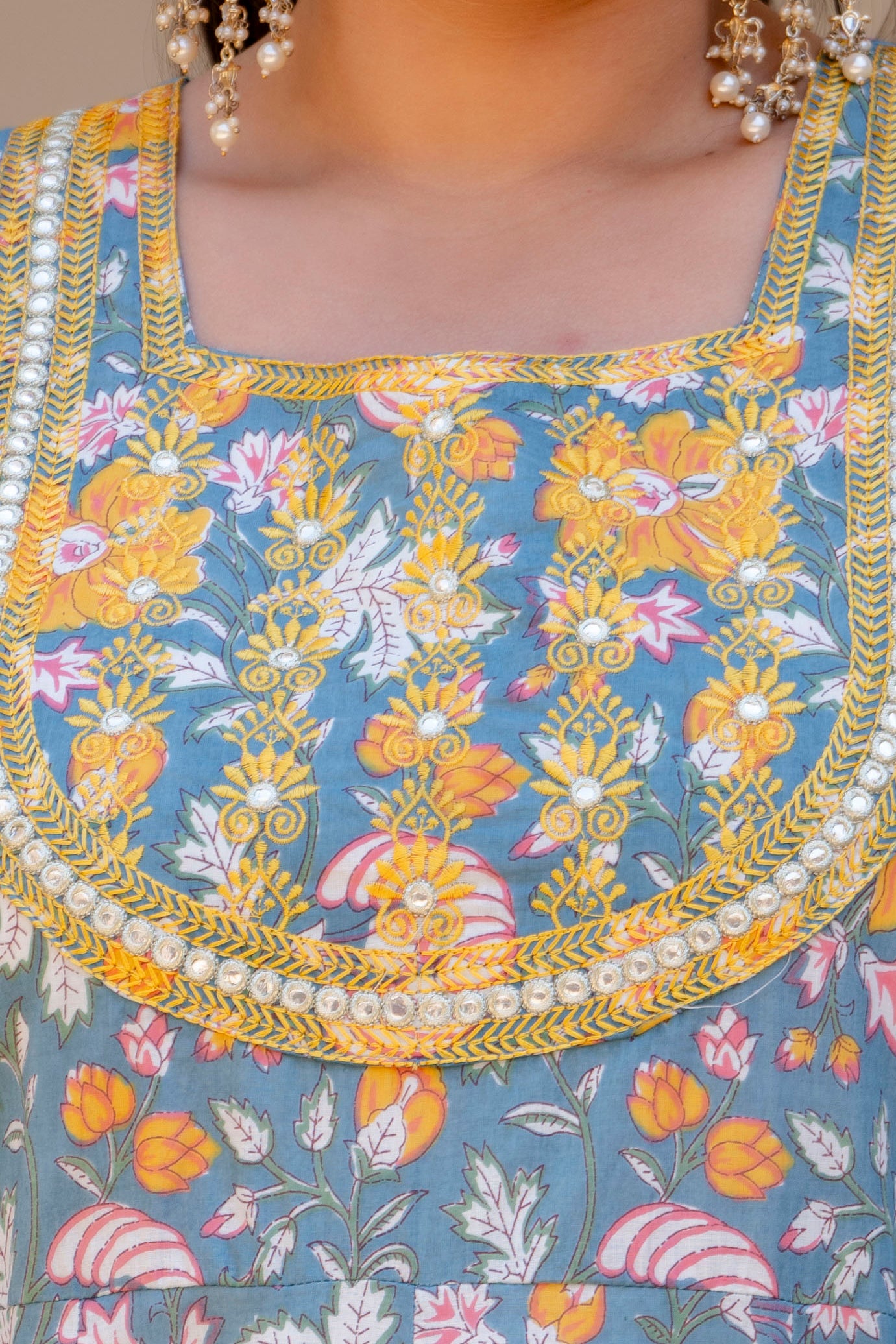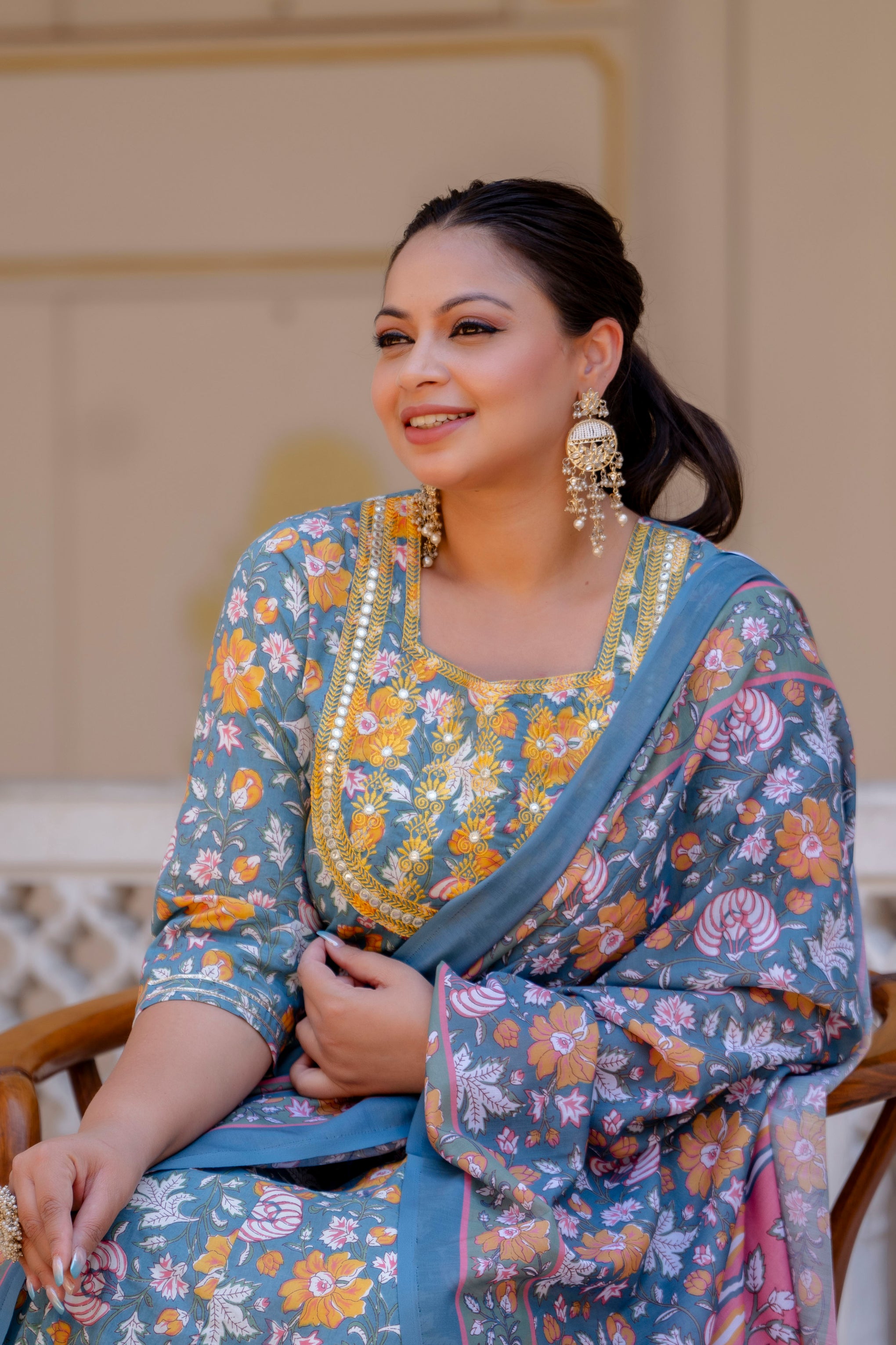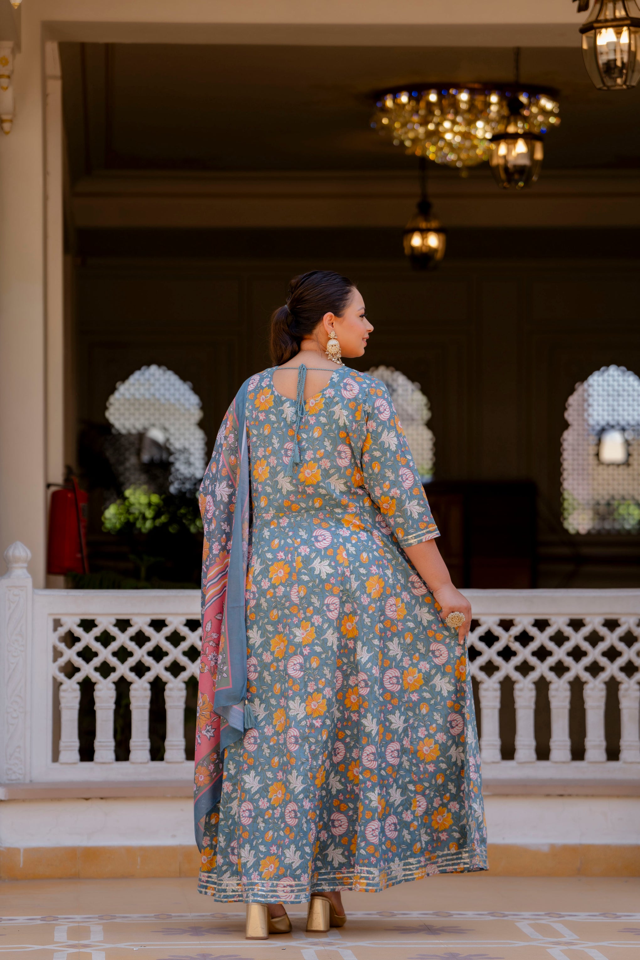 Upgrade your ethnic wardrobe with this Grey Cotton Anarkali With Dupatta Set. Crafted from soft and breathable cotton, this beautifully embroidered Anarkali offers a perfect blend of comfort and refined elegance. The stylish square neckline paired with three-quarter sleeves enhances its graceful silhouette. Completed with a matching dupatta, this set is ideal for festive occasions, pooja ceremonies, family functions, and cultural celebrations.