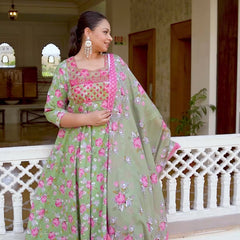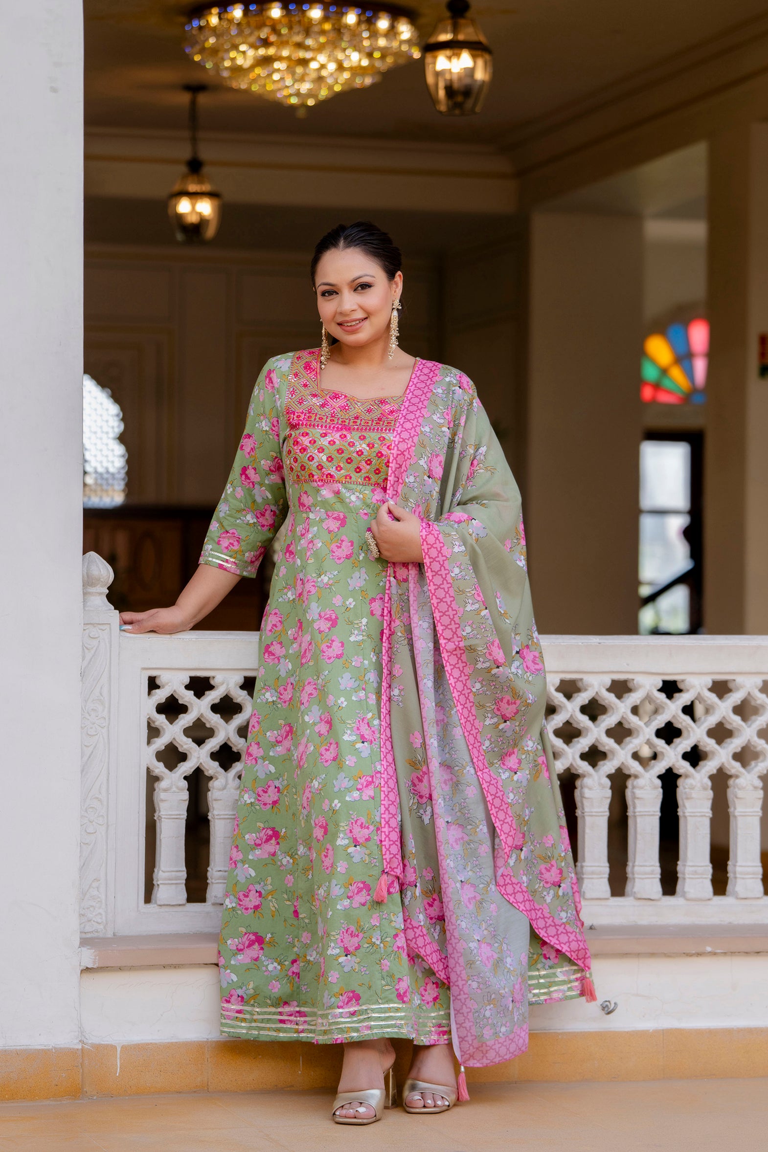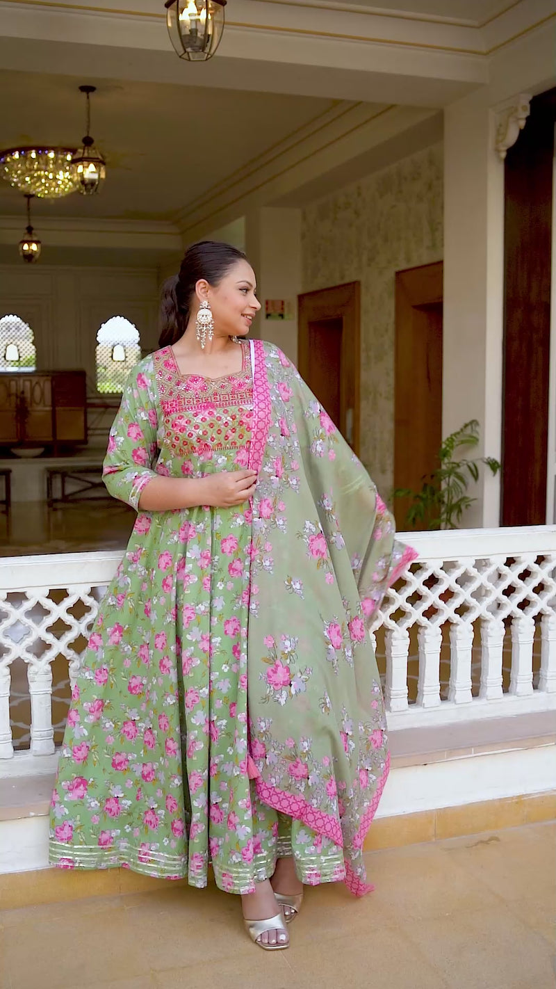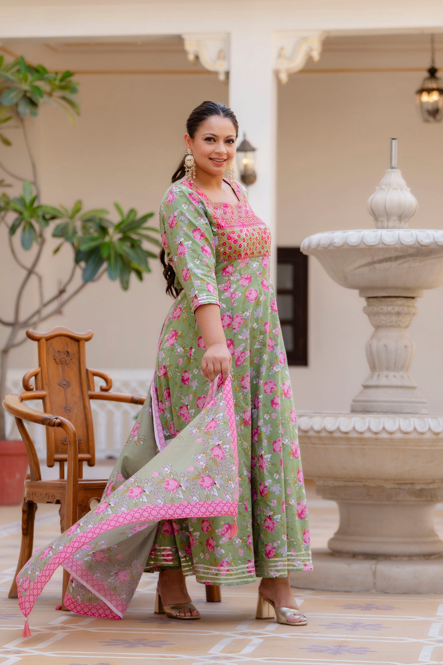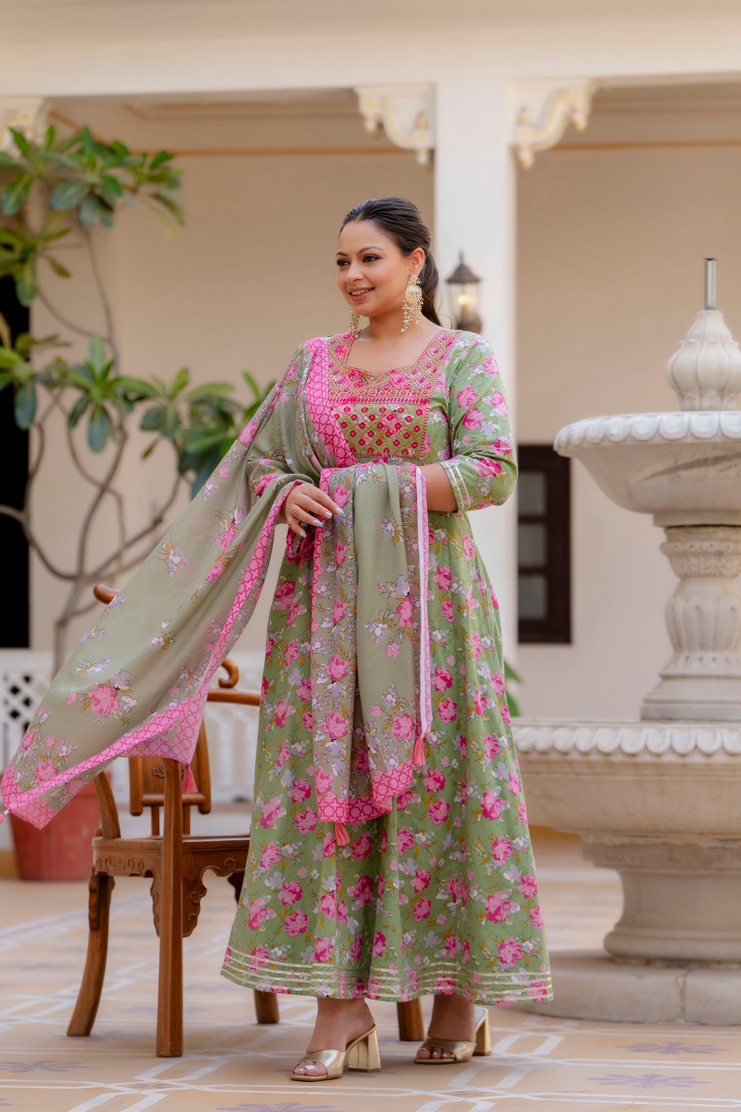 Add a touch of traditional elegance to your wardrobe with this Mehndi Green Cotton Anarkali With Dupatta Set. Crafted from soft, breathable cotton, this beautifully embroidered Anarkali delivers comfort and style in equal measure. The square neckline and three-quarter sleeves enhance its graceful silhouette, making it perfect for festive events, family gatherings, pooja functions, and celebrations. Paired with a matching dupatta, it completes your ethnic look effortlessly.