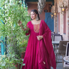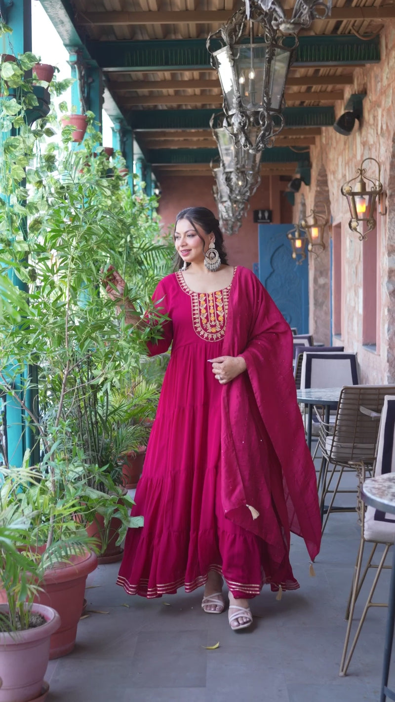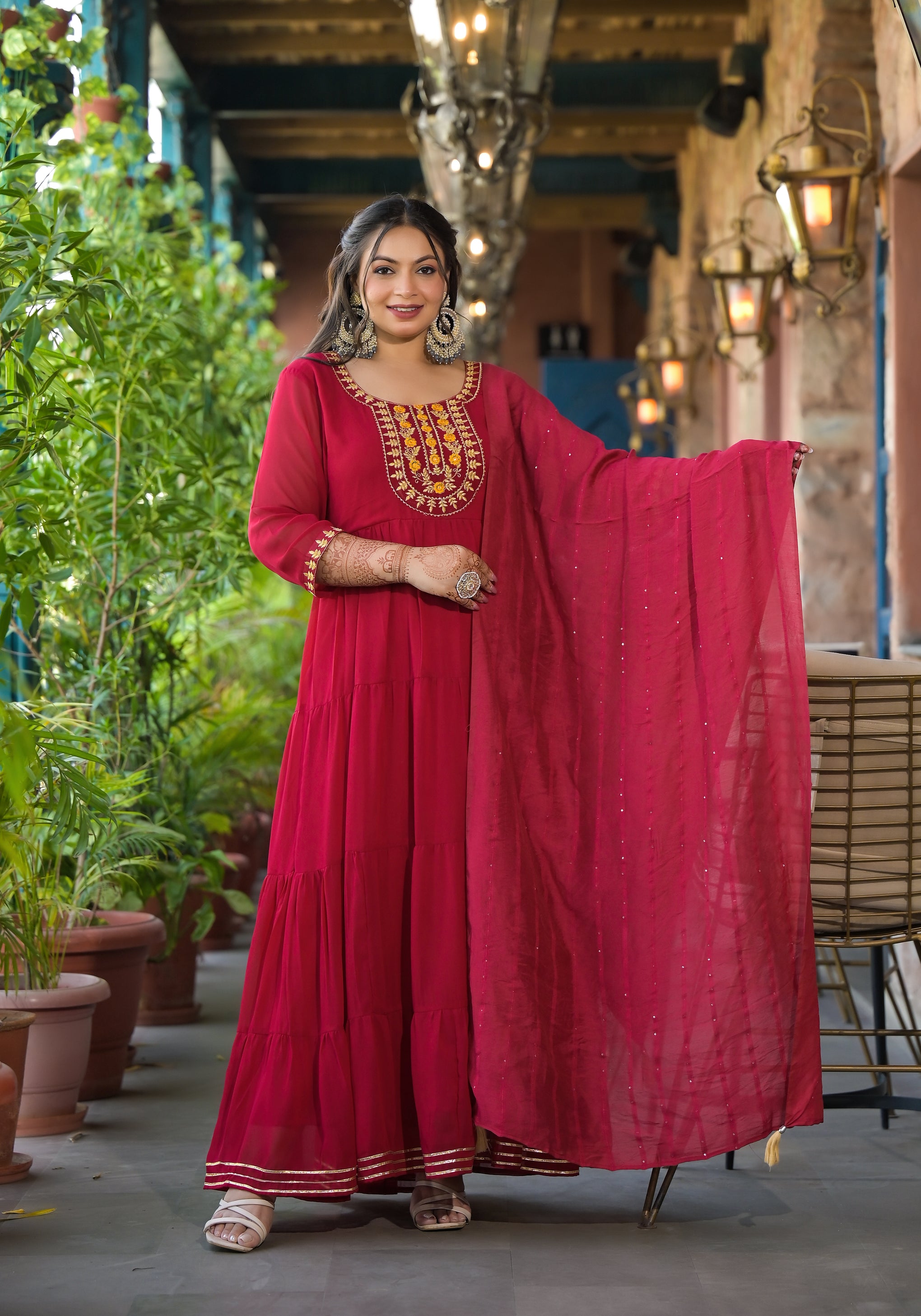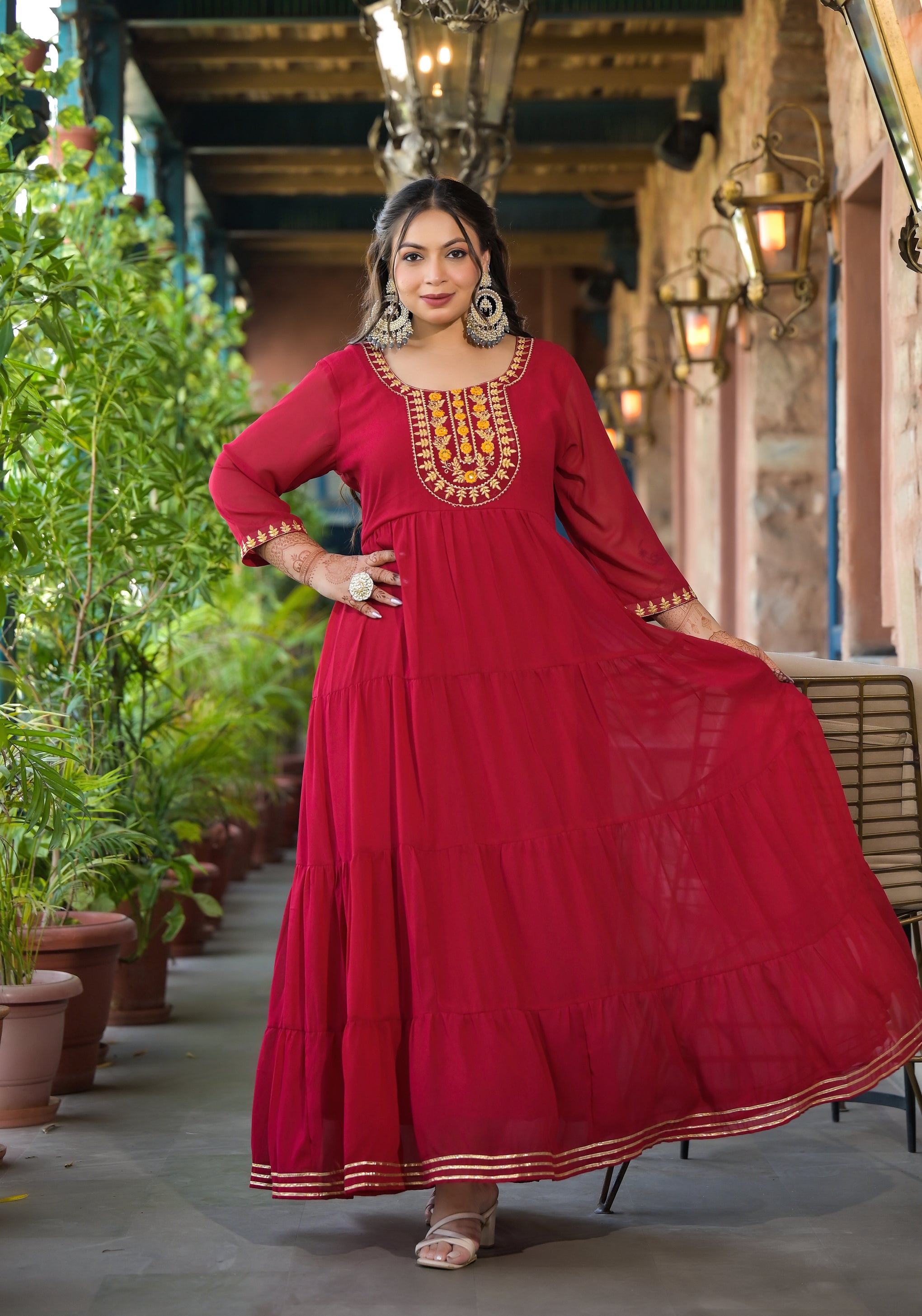 Bring a stunning ethnic charm to your wardrobe with this Red Georgette Anarkali with Dupatta Set. Made from premium georgette, the outfit features beautiful embroidery that enhances its festive elegance. The full-length Anarkali is designed with a classic U-neckline and three-quarter sleeves, offering a graceful and timeless look. Perfect for weddings, festivals, and special events, this set combines comfort with sophisticated style.