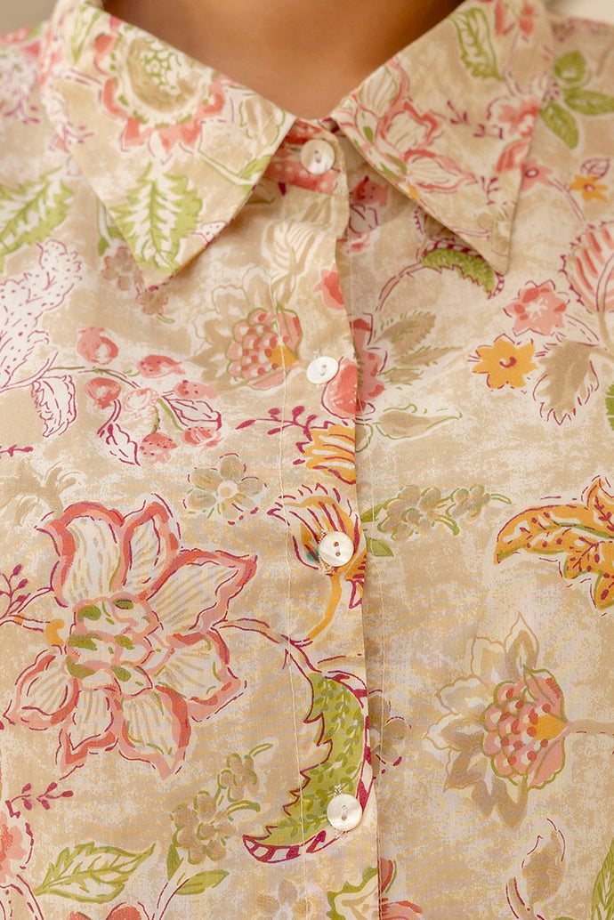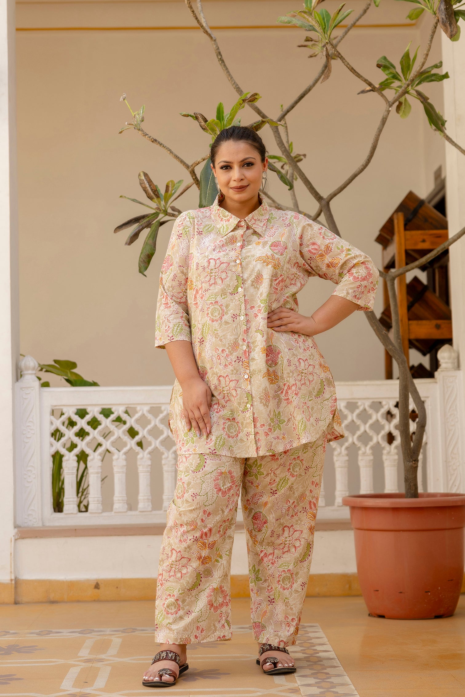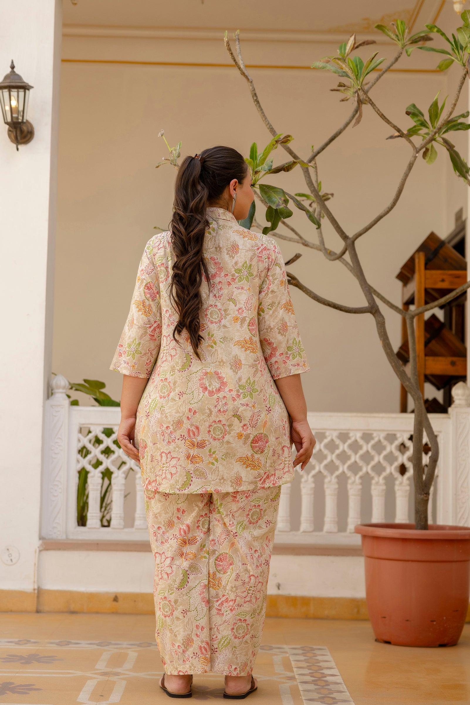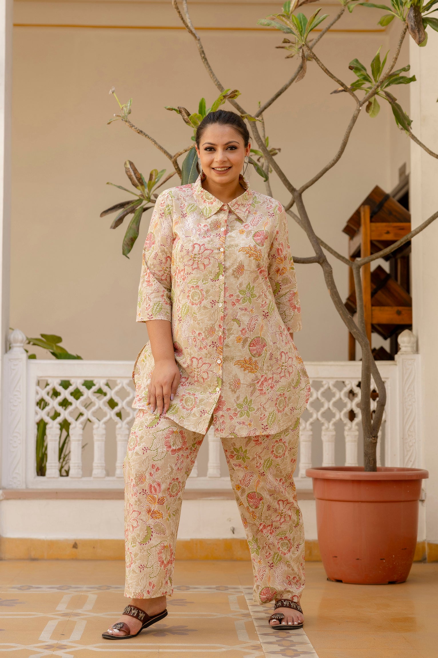 Upgrade your everyday wardrobe with this Beige Cotton Printed Co-Ord Set, thoughtfully designed for comfort and effortless style. Made from breathable cotton fabric, this co-ord set features a printed hip-length top with a smart collar neckline and three-quarter sleeves. Paired with a matching pant, it offers a relaxed yet polished look, making it suitable for office wear, casual outings, and daily use.