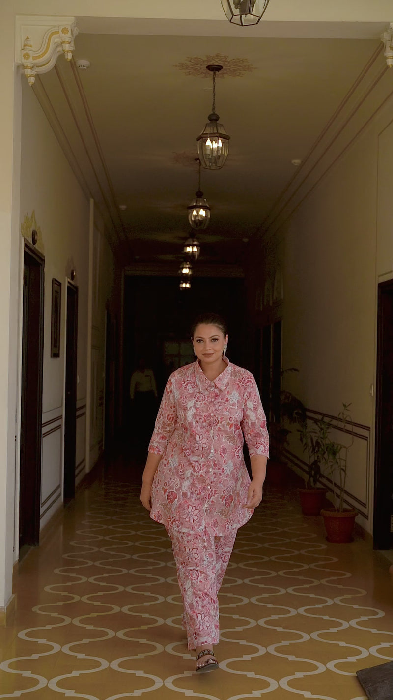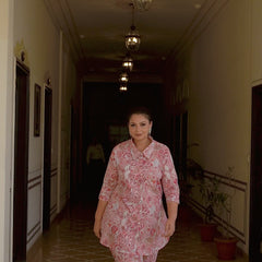 Step out in style with this Peach Cotton Printed Co-Ord Set, designed for comfort and everyday elegance. Made from breathable cotton fabric, the set features a printed hip-length top with a smart collar neckline and three-quarter sleeves. Paired with a matching pant, it offers a relaxed yet polished look, perfect for casual outings, office wear, or daily use.