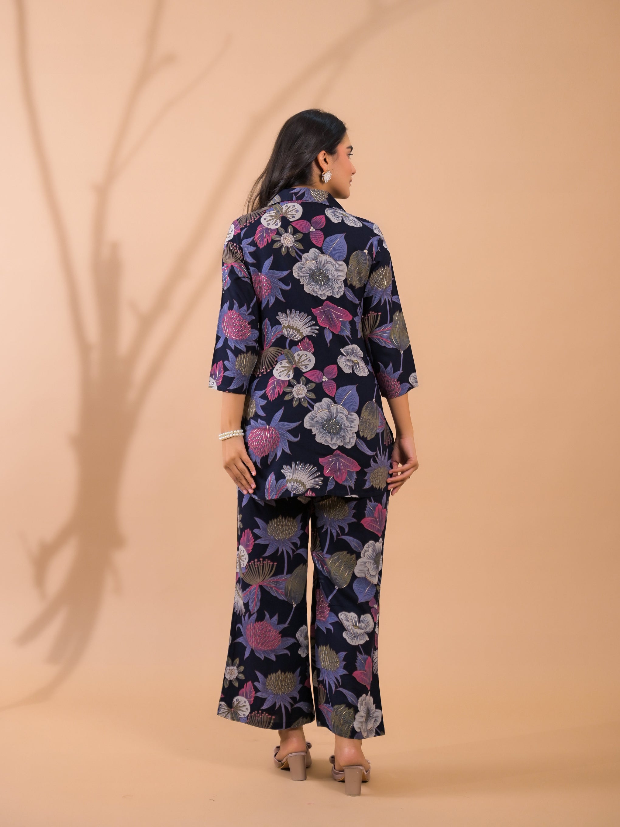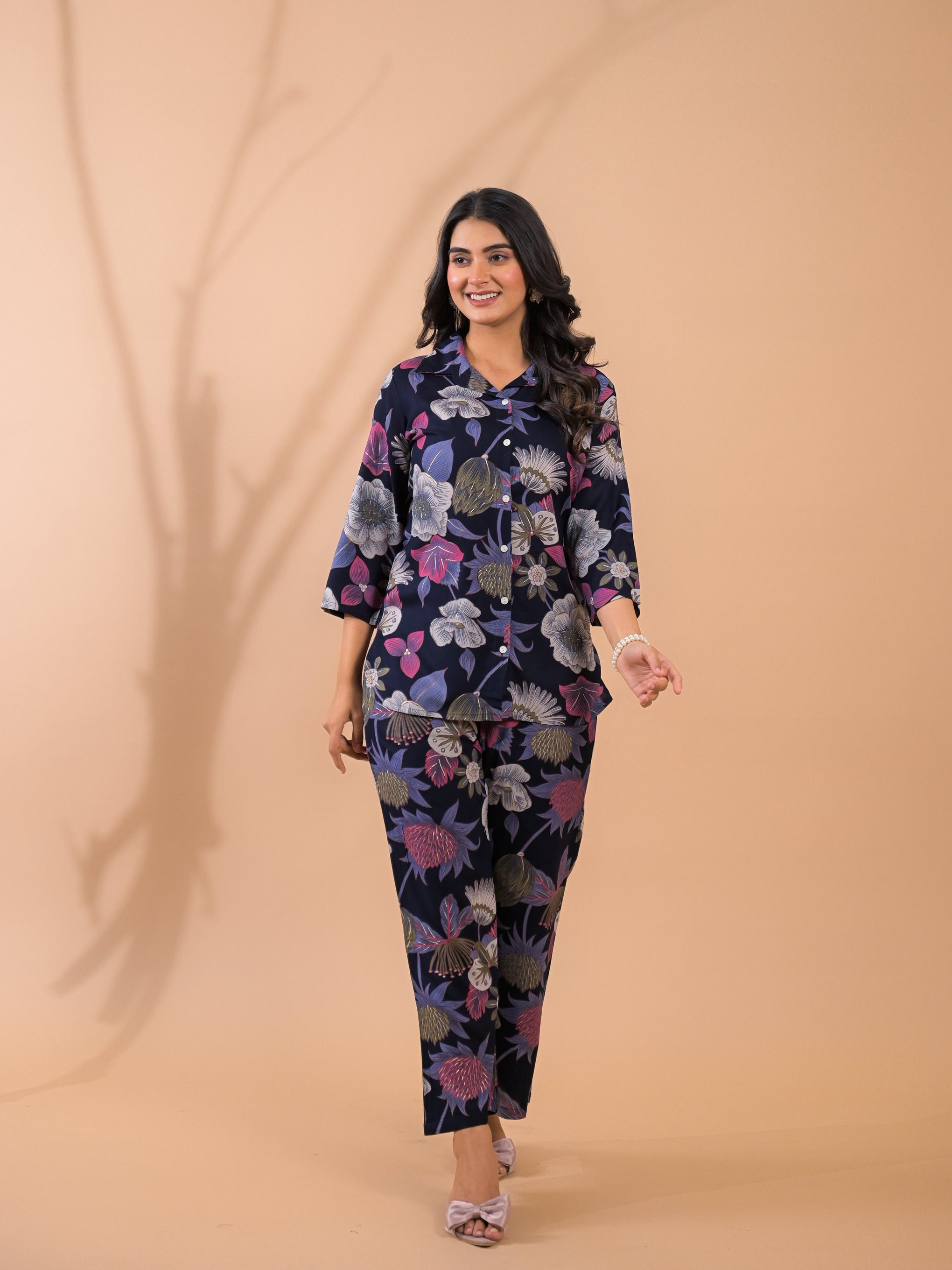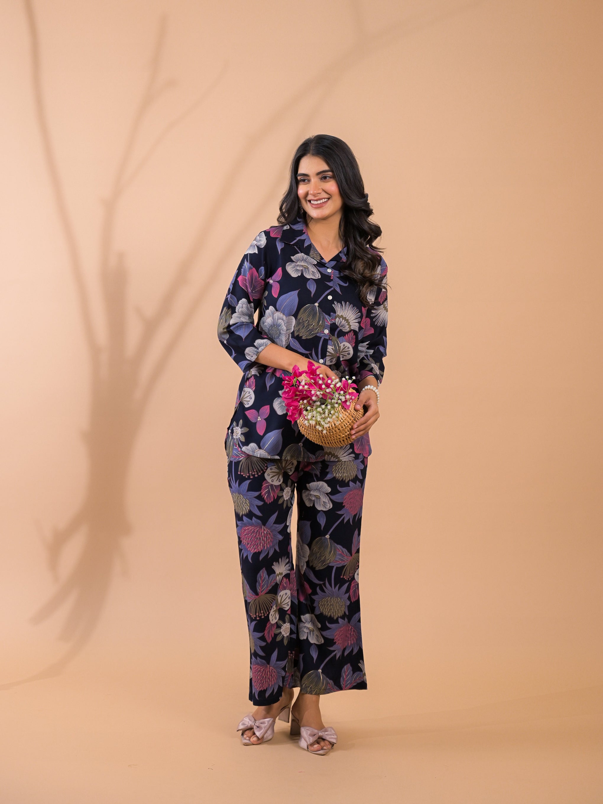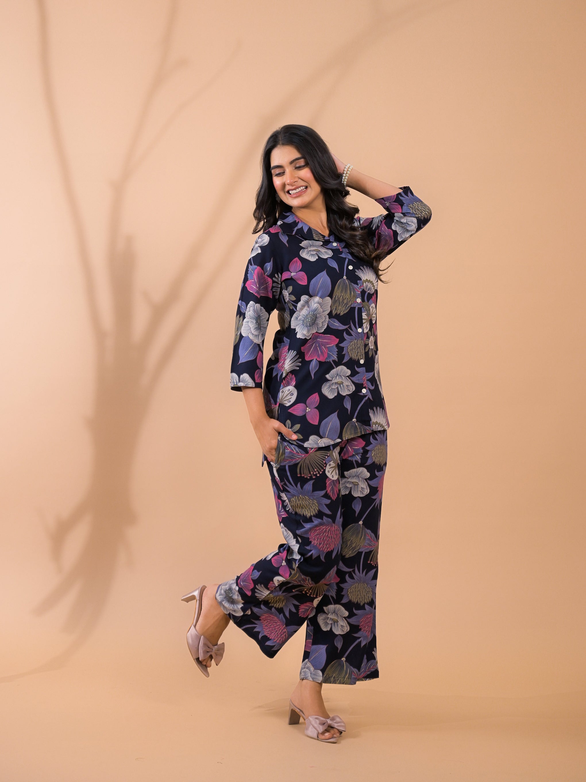 This Blue printed co-ord set in Rayon features a collar neck top with 3/4 sleeves and button closure, paired with wide-leg palazzo pants with pockets.