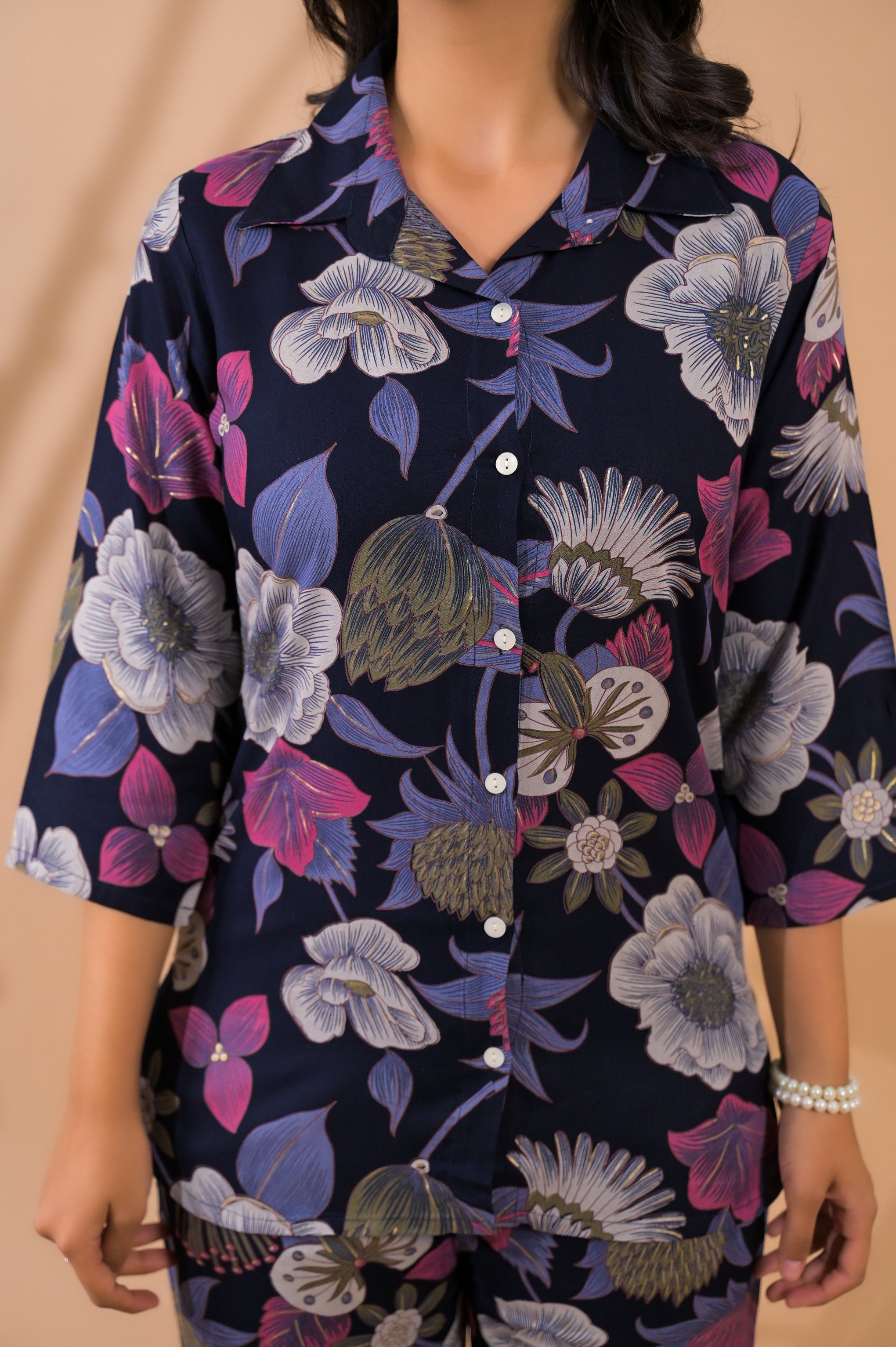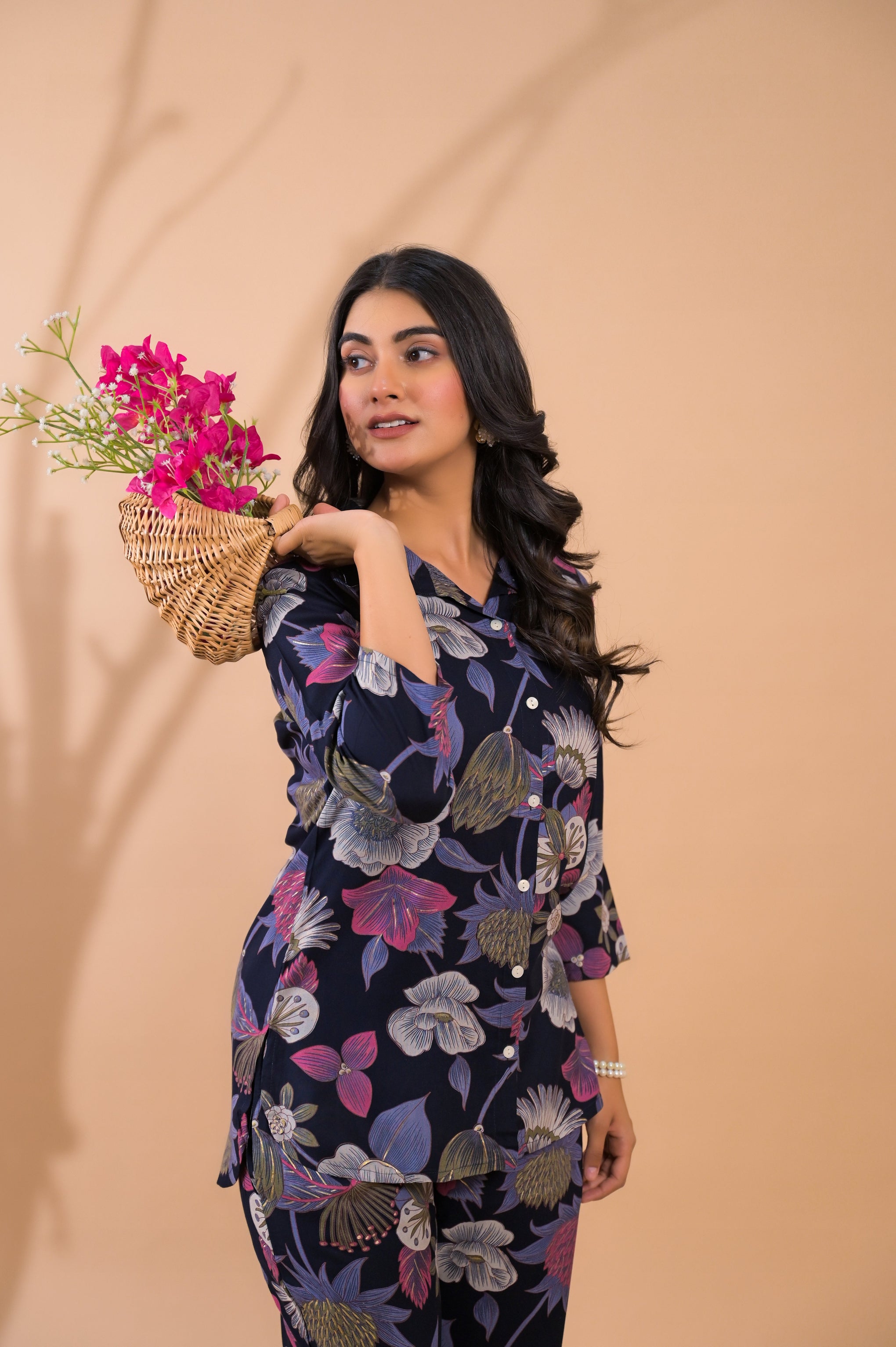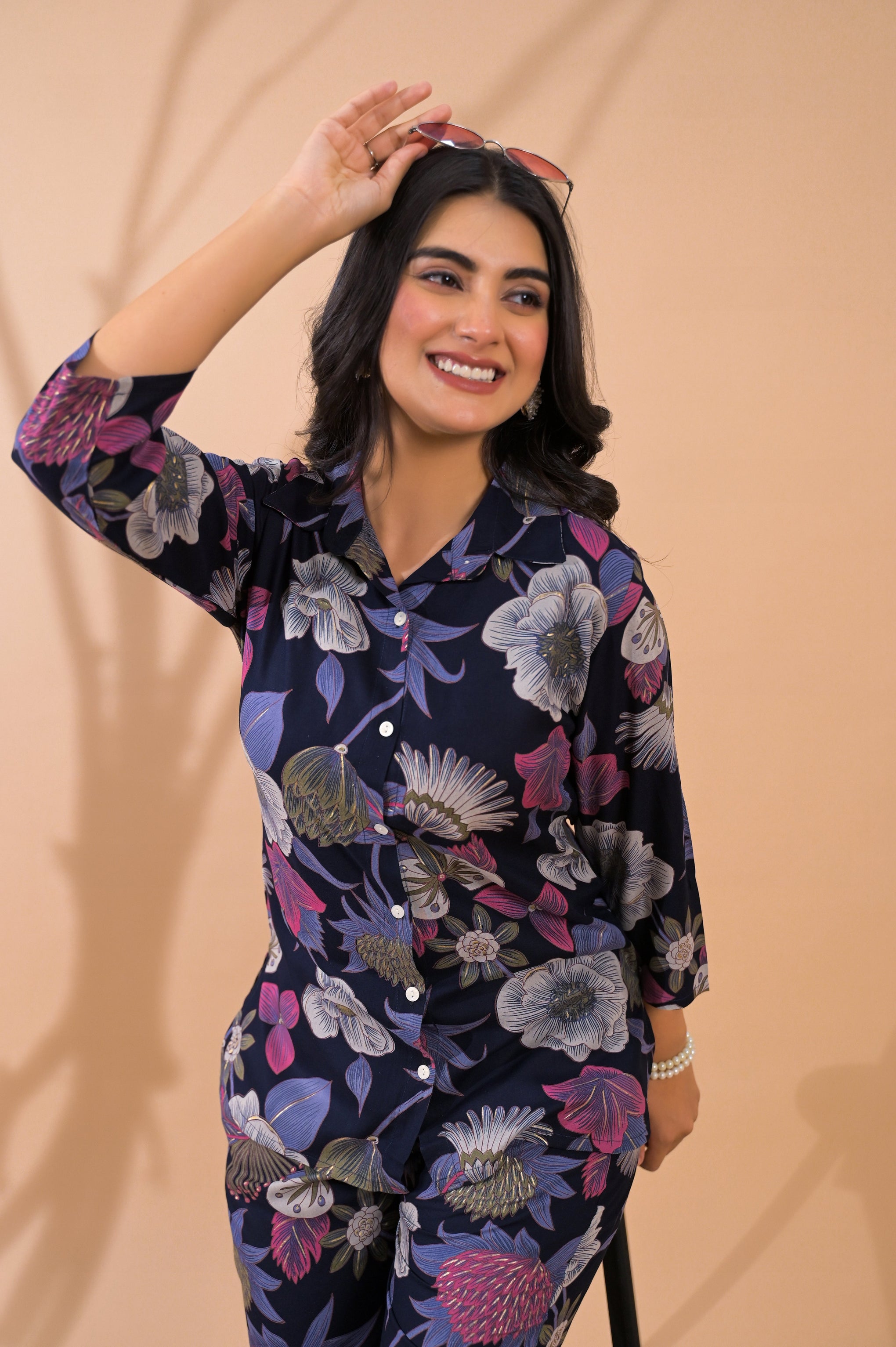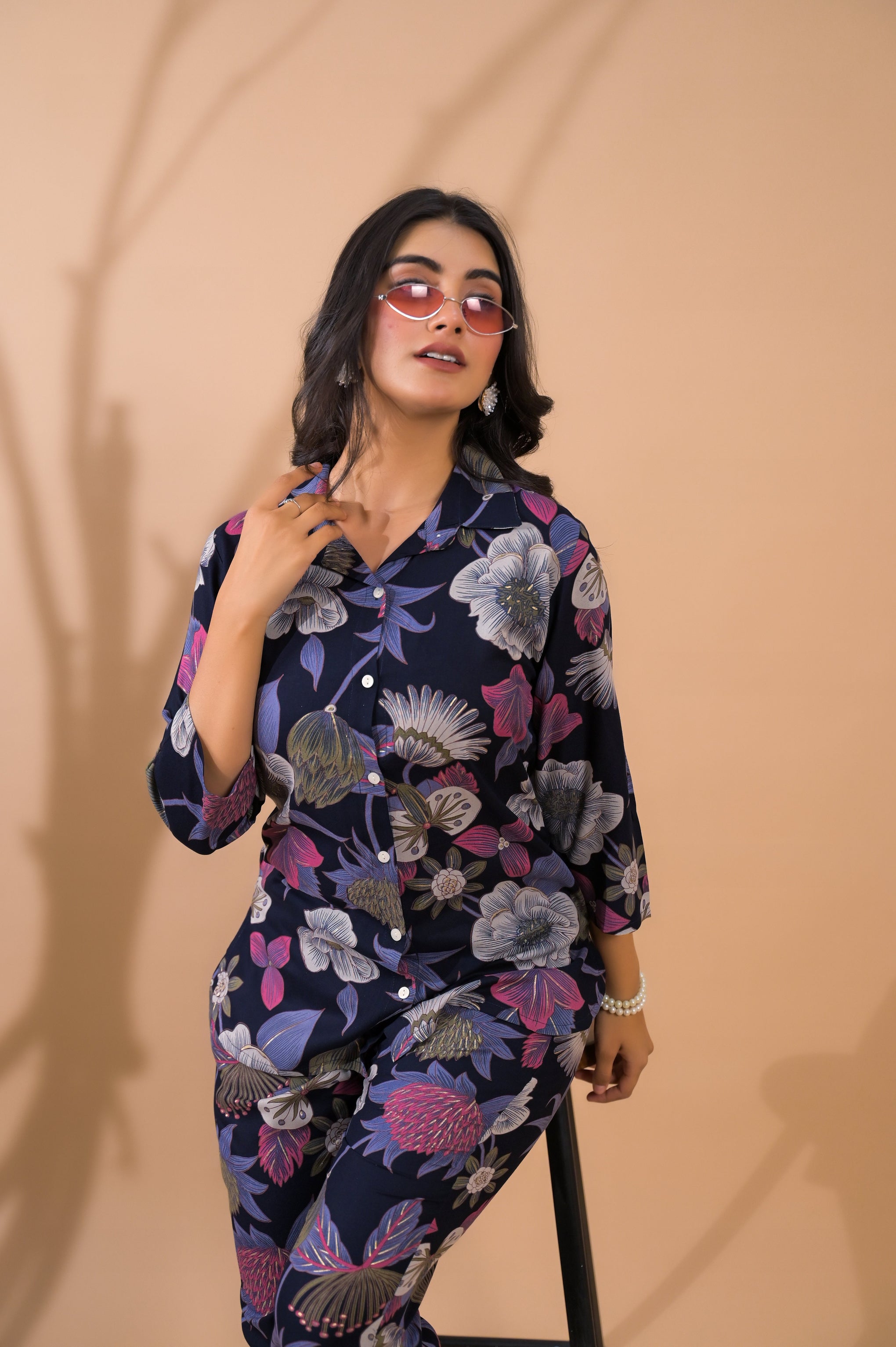 This Blue printed co-ord set in Rayon features a collar neck top with 3/4 sleeves and button closure, paired with wide-leg palazzo pants with pockets.