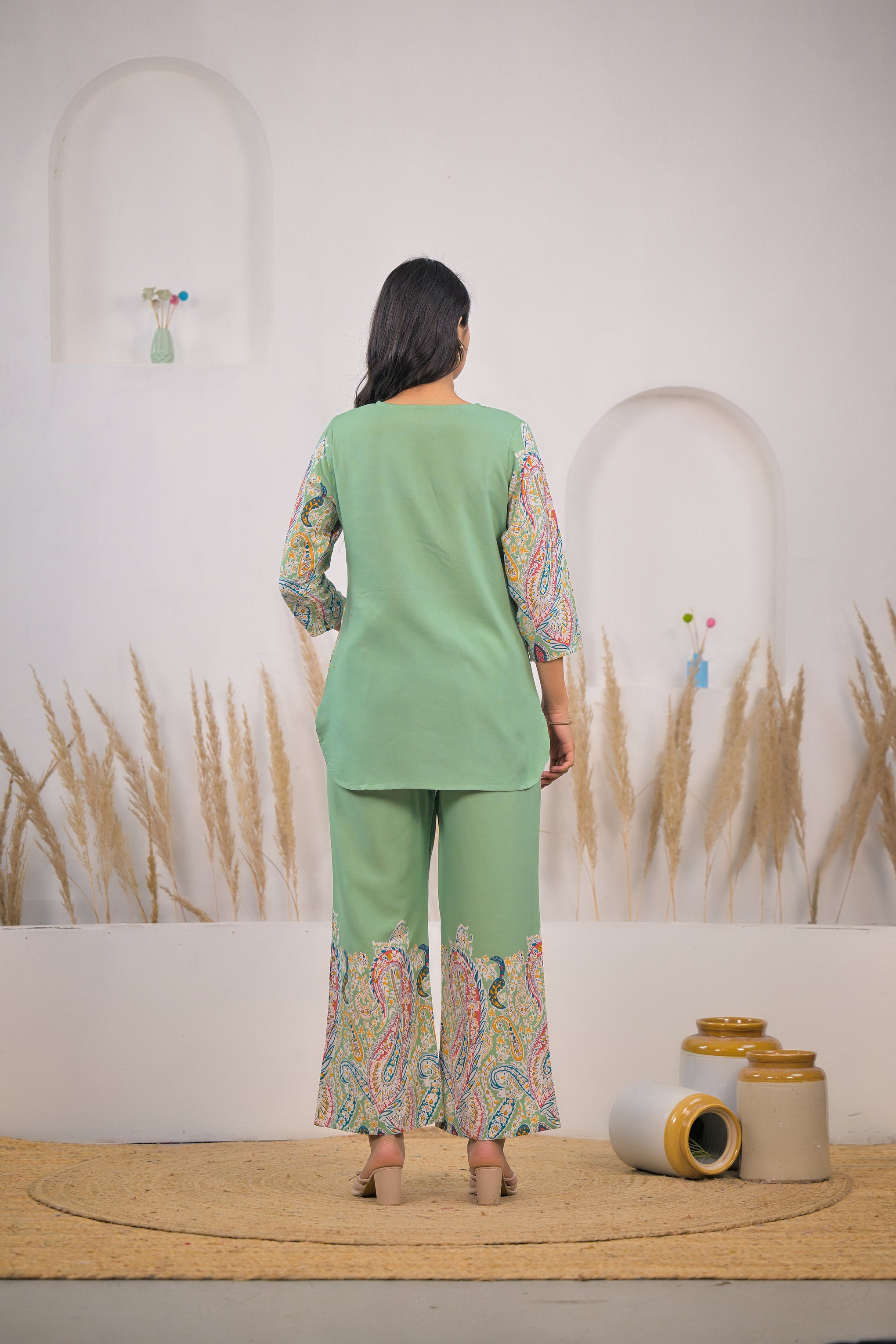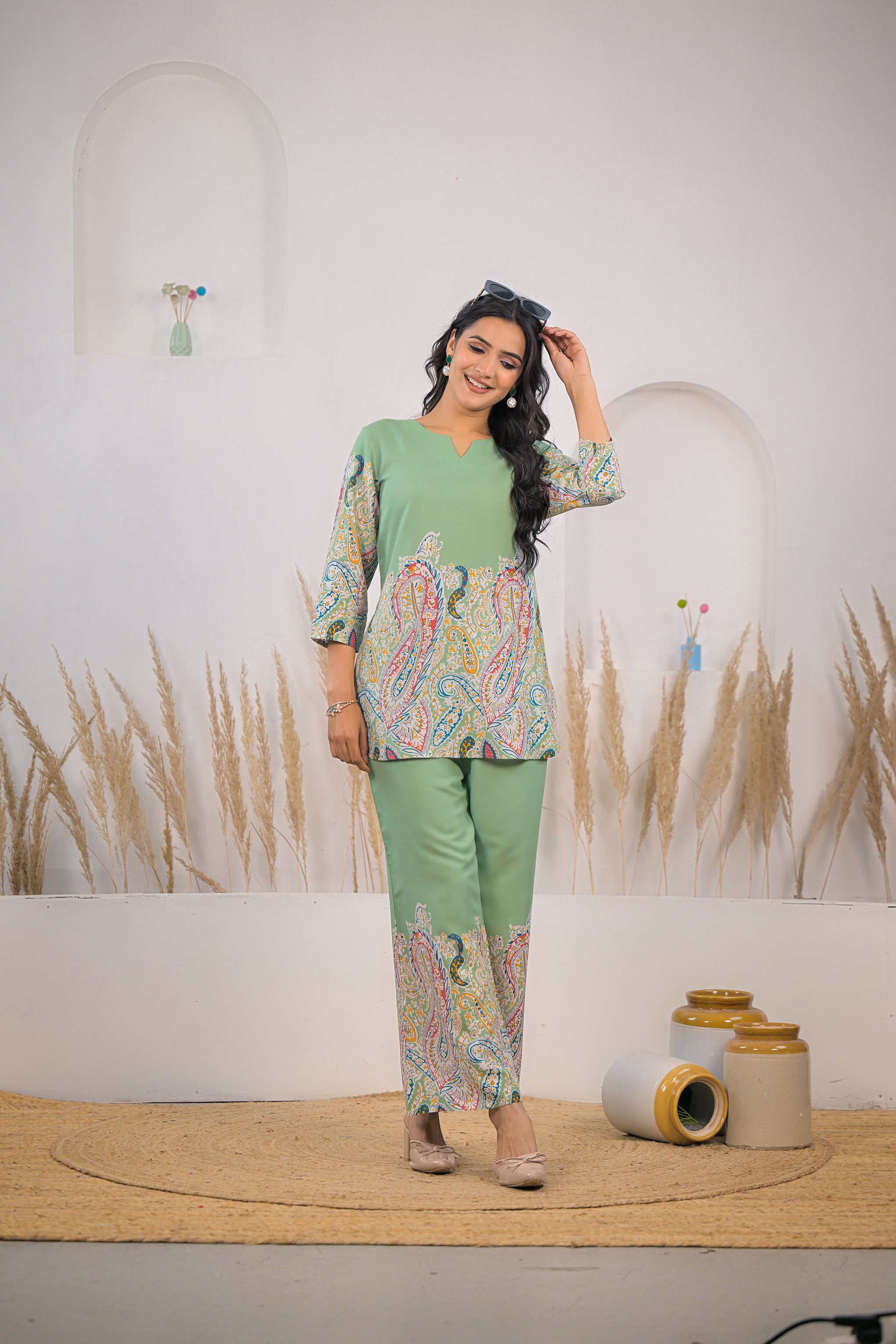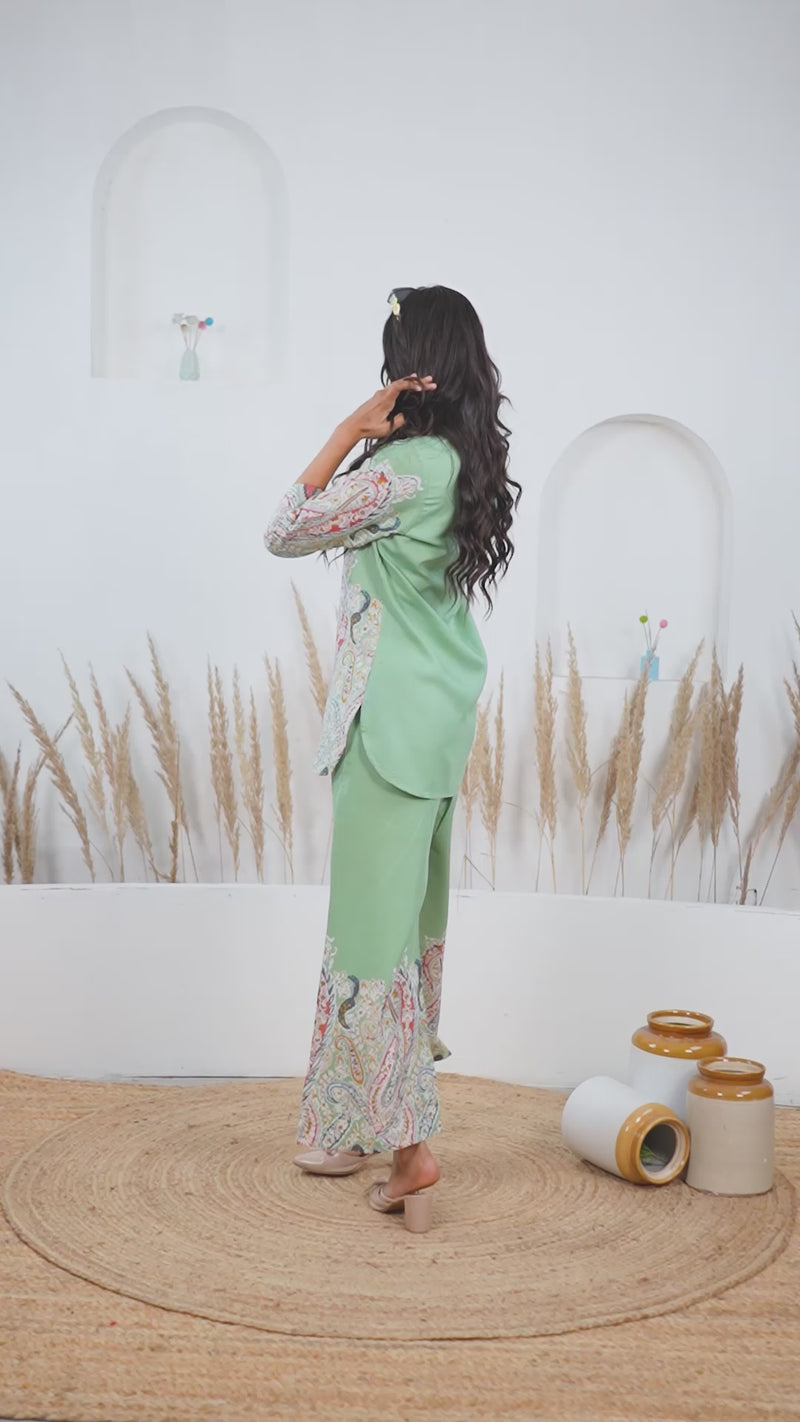 Stylish printed rayon co ord set light green