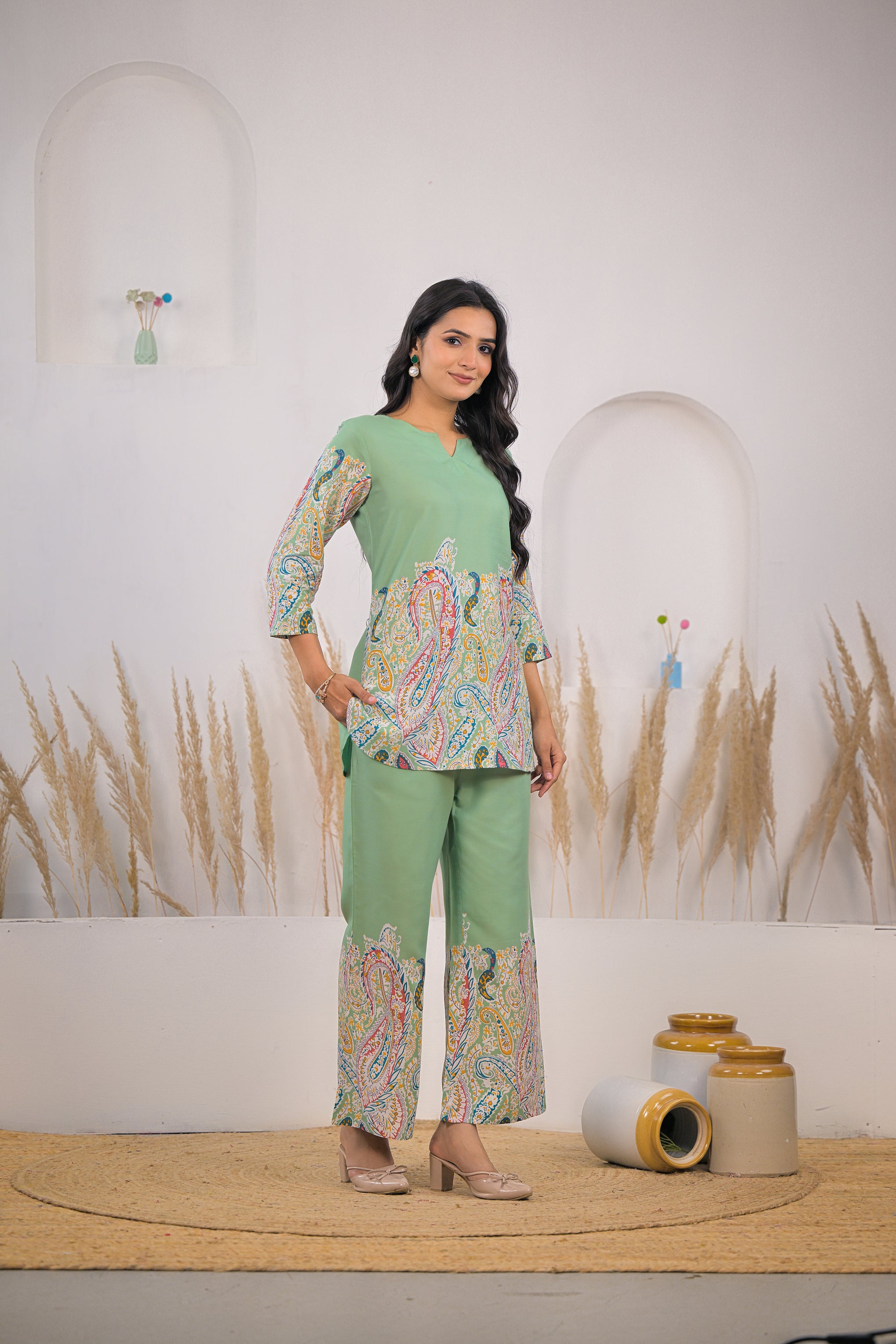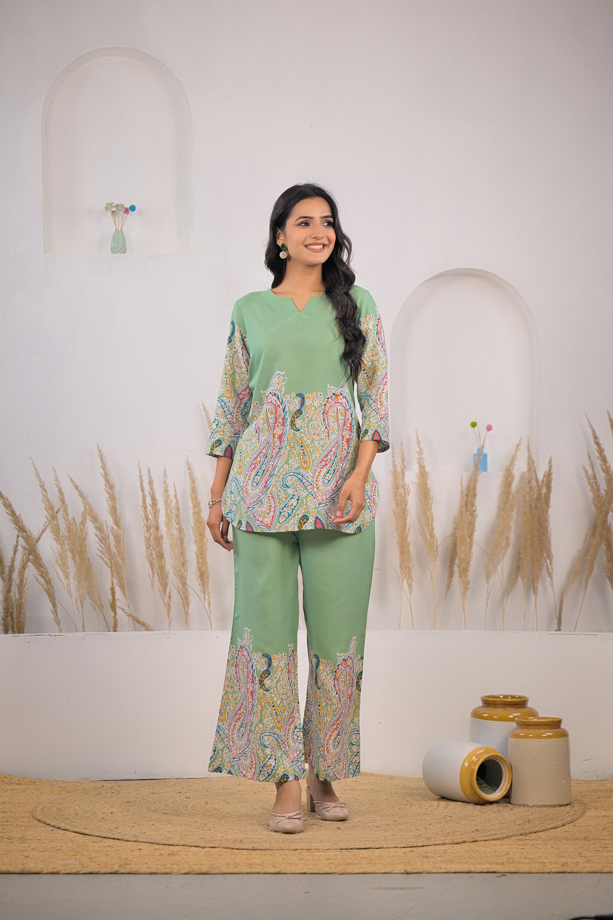 Enhance your everyday style with this light green rayon co-ord set featuring a printed kurti and matching pants. Made from soft, breathable rayon, it offers lasting comfort with a graceful ethnic-modern look, perfect for daily wear and casual occasions.