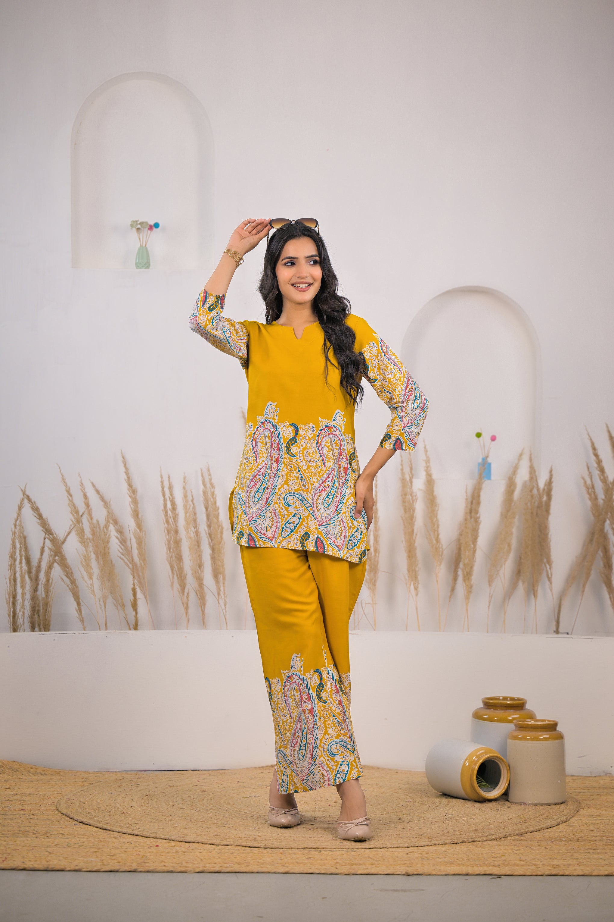 Refresh your everyday wardrobe with this stylish mustard co-ord set crafted in soft rayon fabric. Designed with a solid kurti enhanced by paisley-printed sleeves and hem, paired with matching straight-fit pants, it offers a balanced blend of comfort and modern ethnic style.