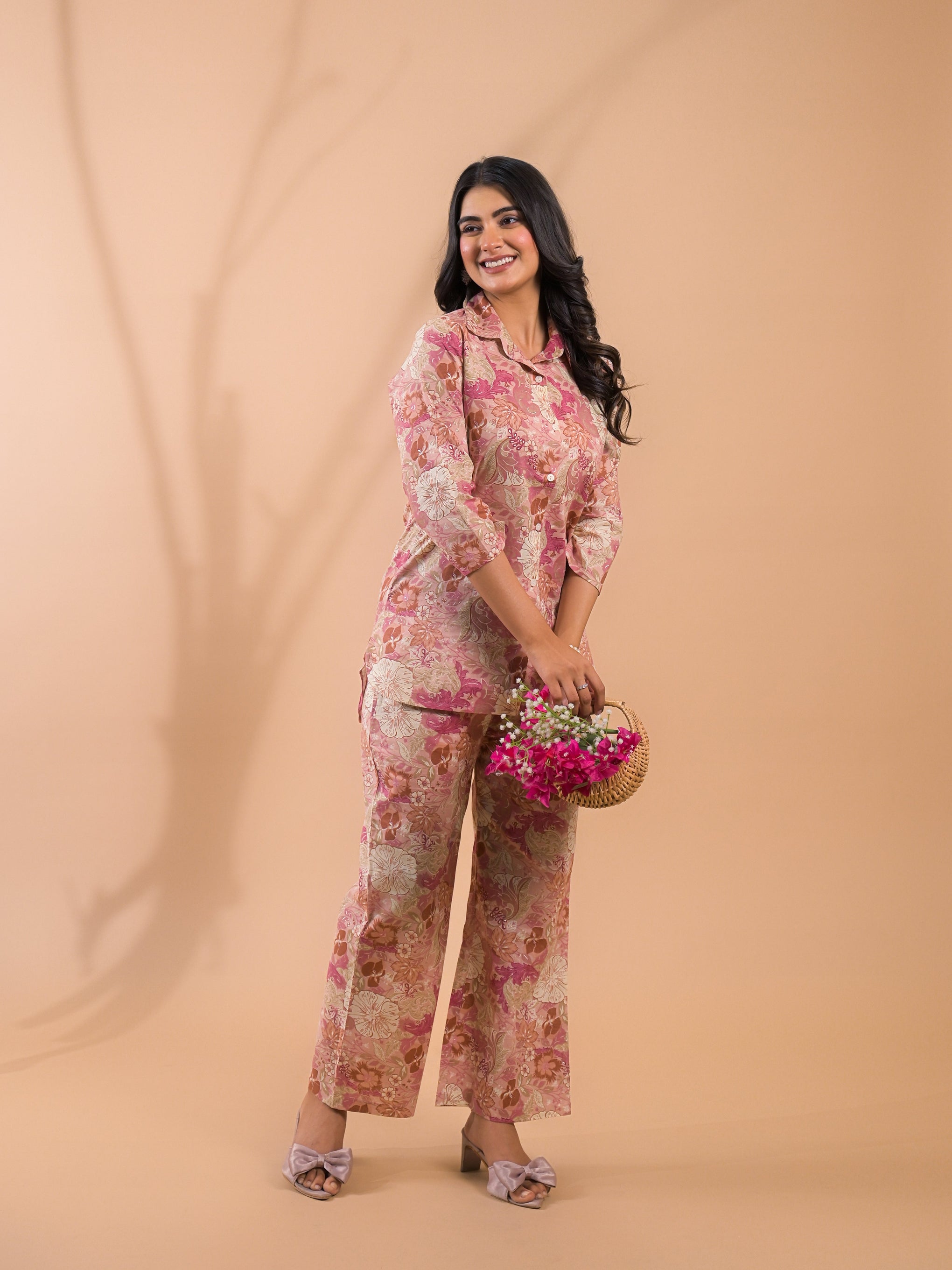 This Beige printed co-ord set in Cotton features a collar neck top with 3/4 sleeves and button closure, paired with wide-leg palazzo pants with pockets.