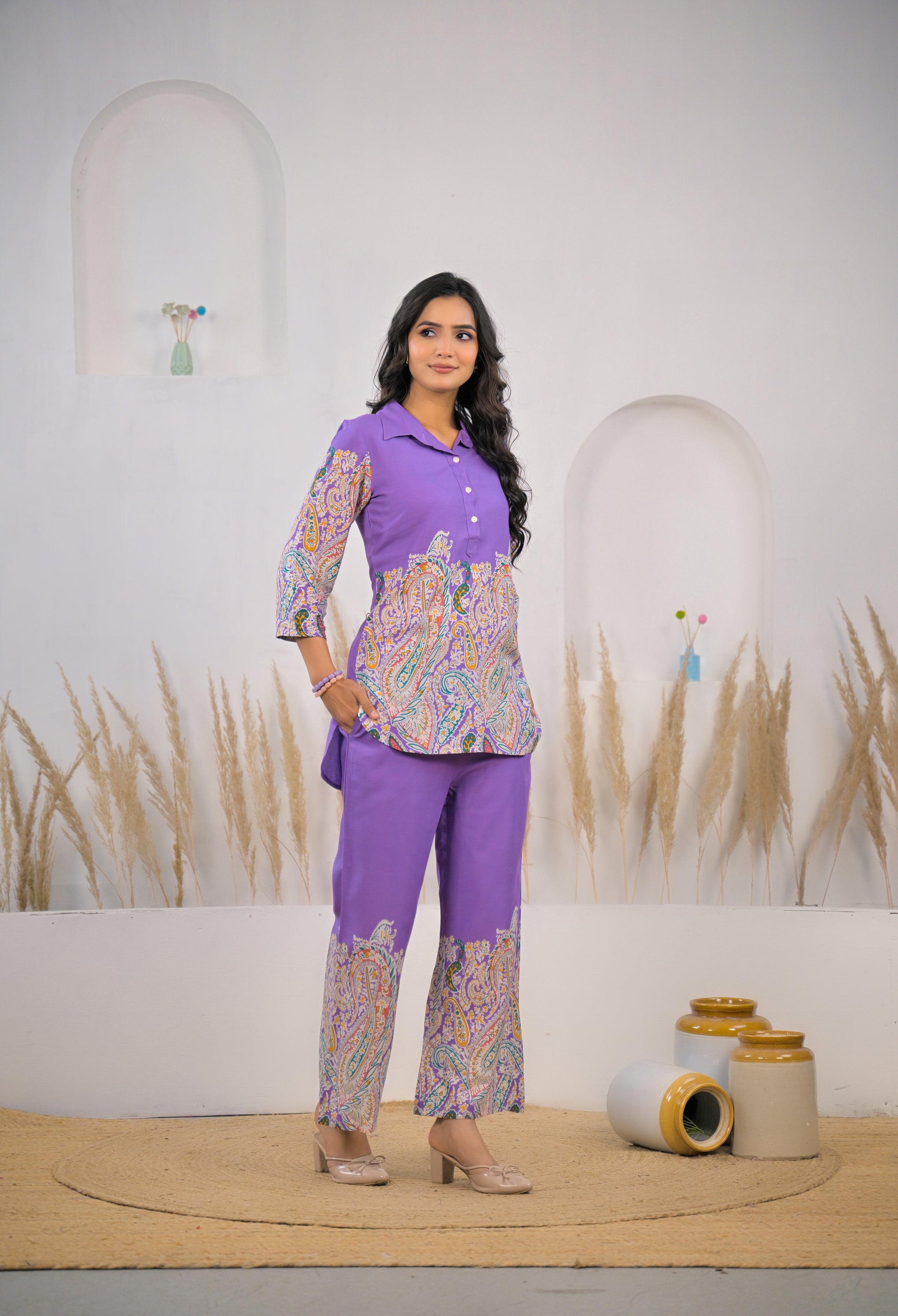 Upgrade your everyday look with this violet rayon co-ord set featuring a printed kurti and matching pants. Crafted from soft, breathable rayon, it offers all-day comfort with a trendy ethnic-modern style, ideal for casual wear and outings.