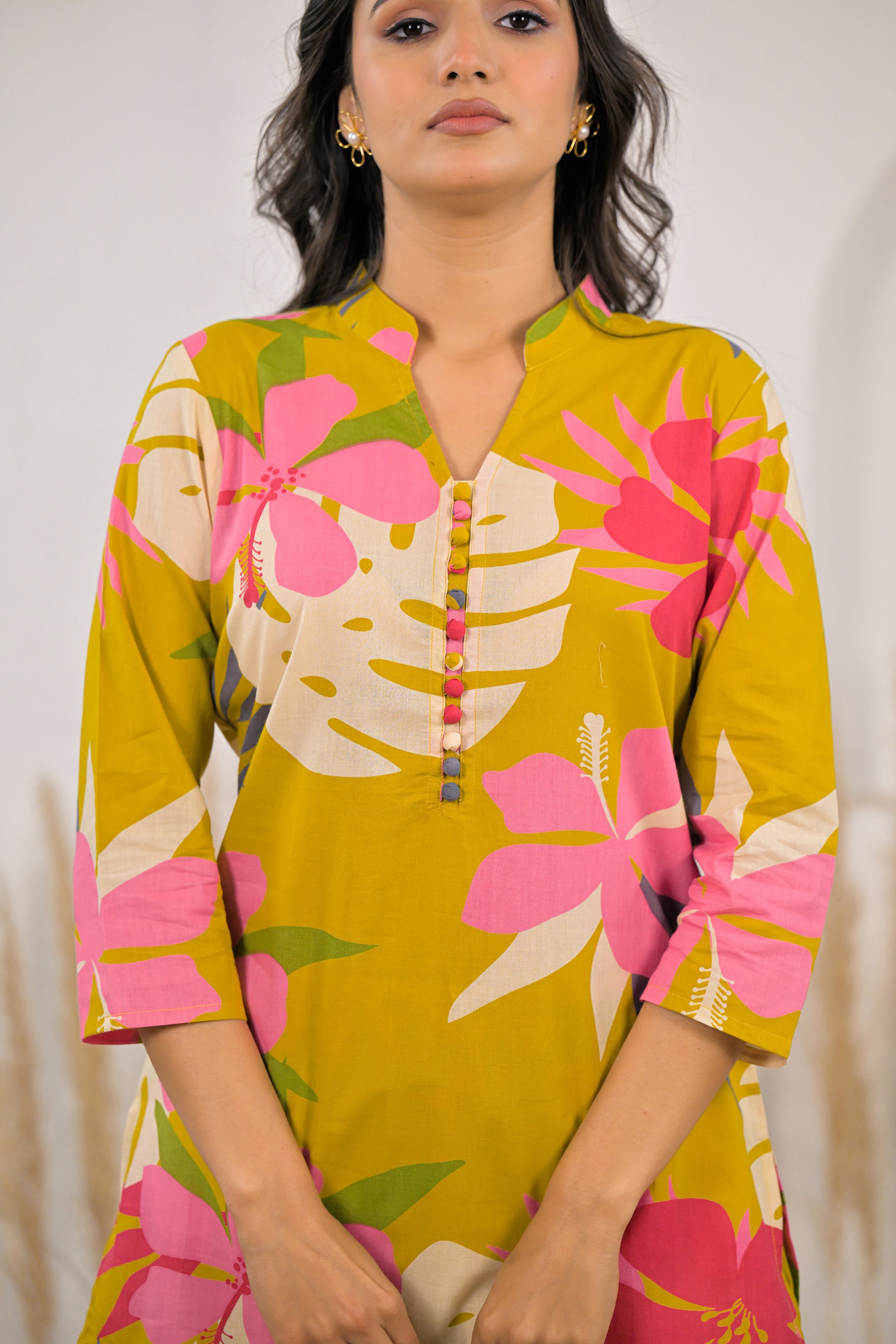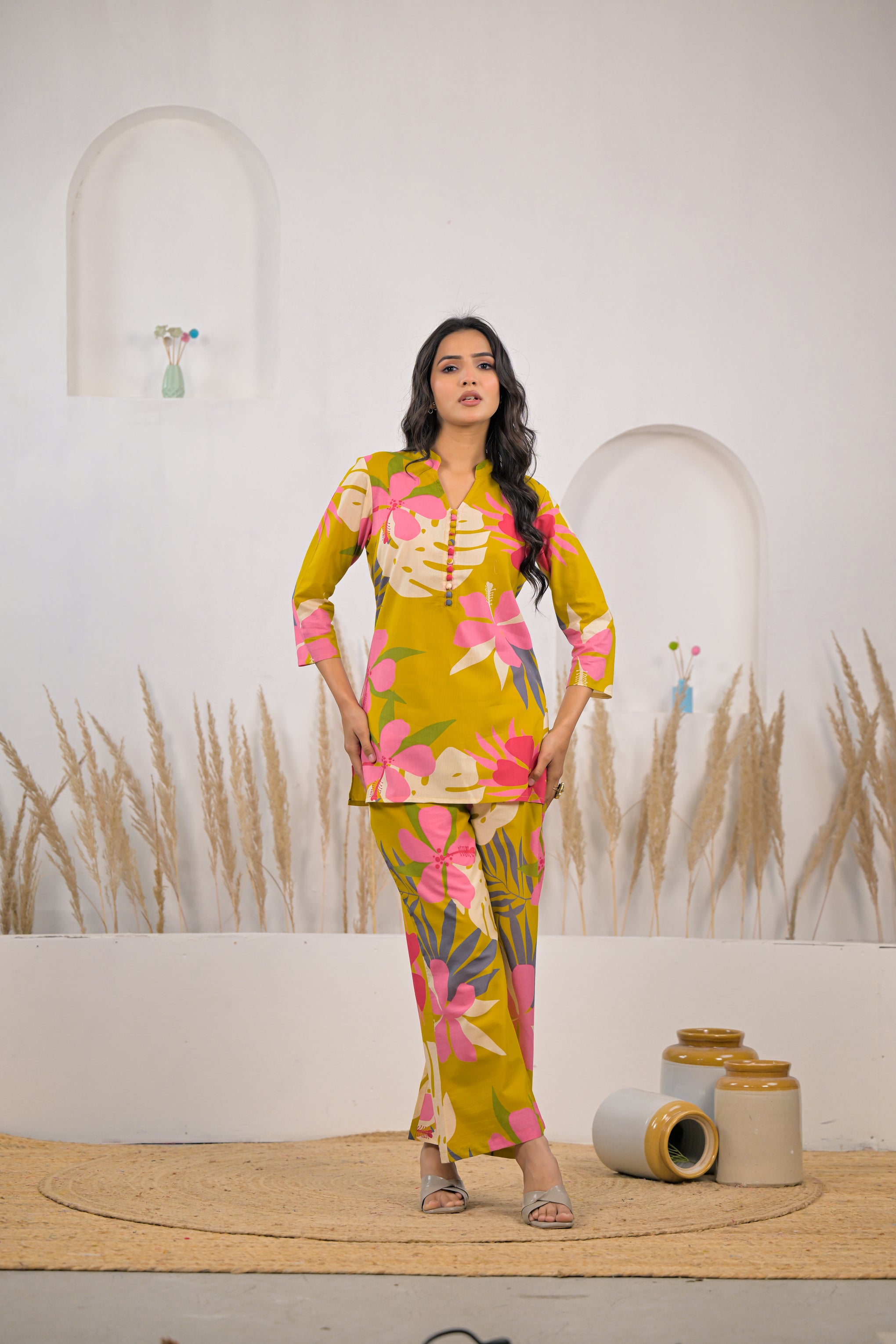 Brighten up your everyday look with this yellow cotton co-ord set featuring a floral printed kurti and matching pants. Crafted from soft, breathable cotton, it offers all-day comfort with a fresh, trendy ethnic-modern style ideal for casual wear and outings.