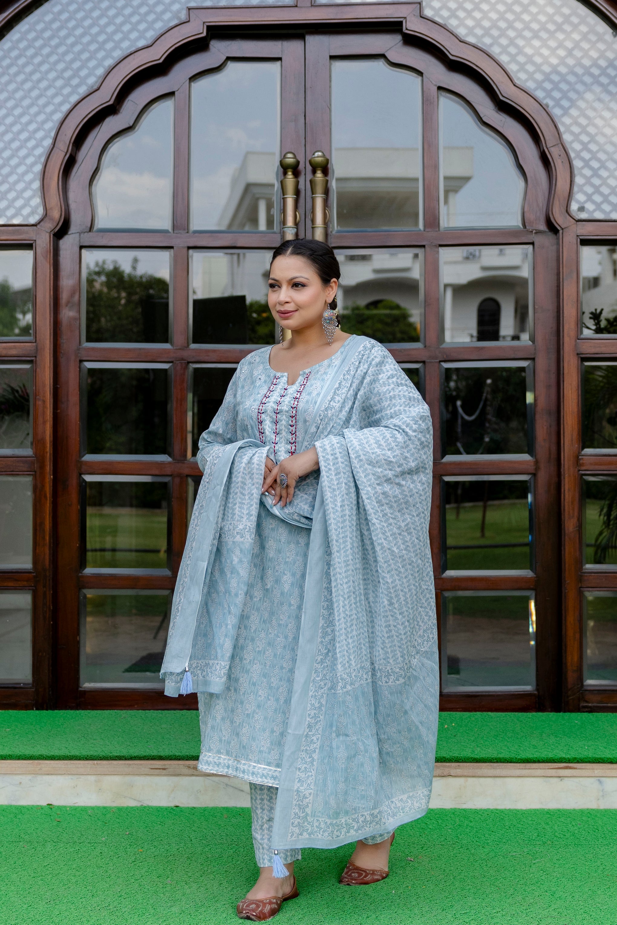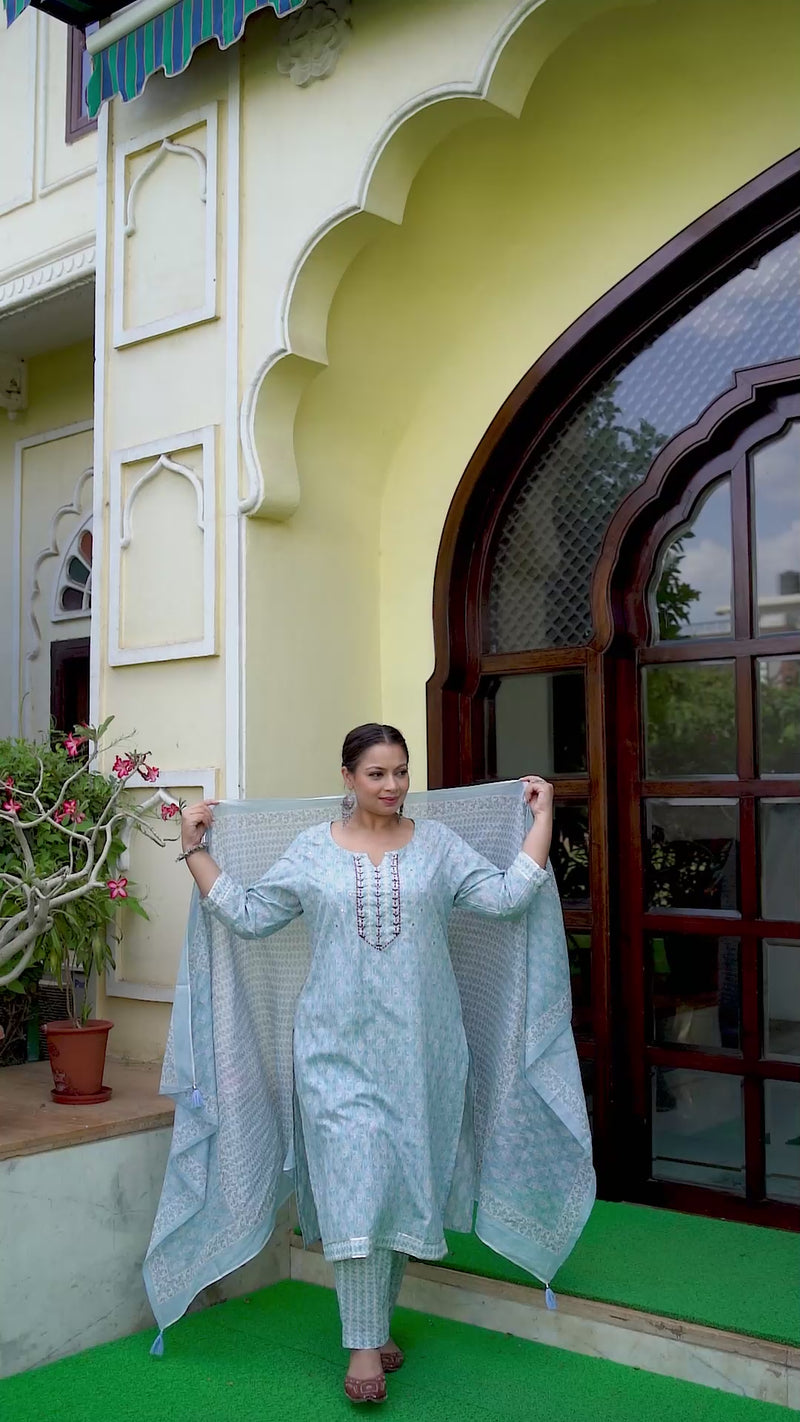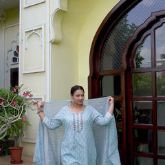 Refresh your ethnic wardrobe with this elegant Light Blue Printed Cotton Kurta Pant Dupatta Set. Made from soft and breathable cotton fabric, this set offers all-day comfort with a graceful look. The kurta is designed with a classic round neckline and three-quarter sleeves, featuring subtle prints that add a touch of charm. Paired with a comfortable pant and a matching dupatta, this set is ideal for daily wear, casual outings, and festive gatherings.