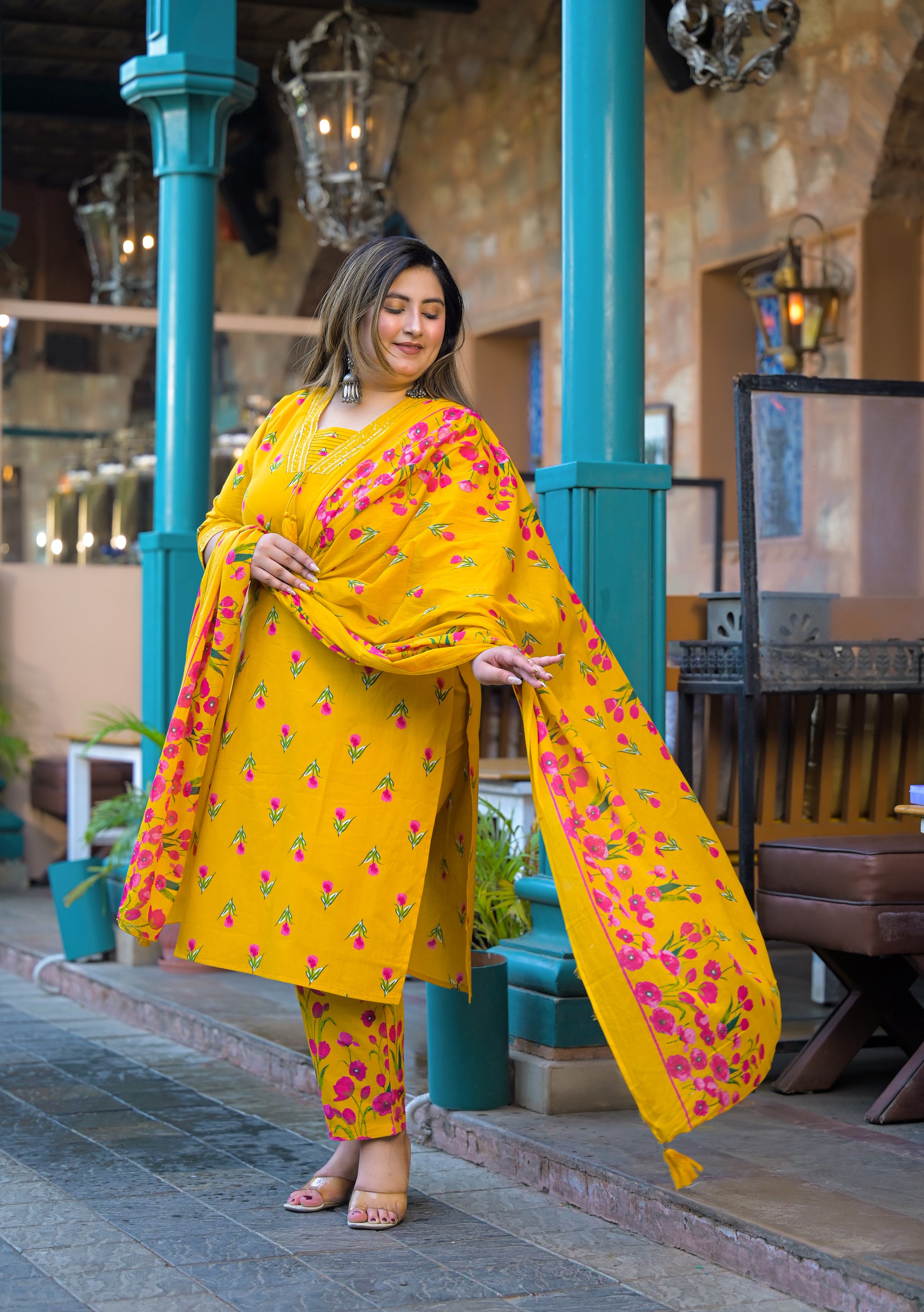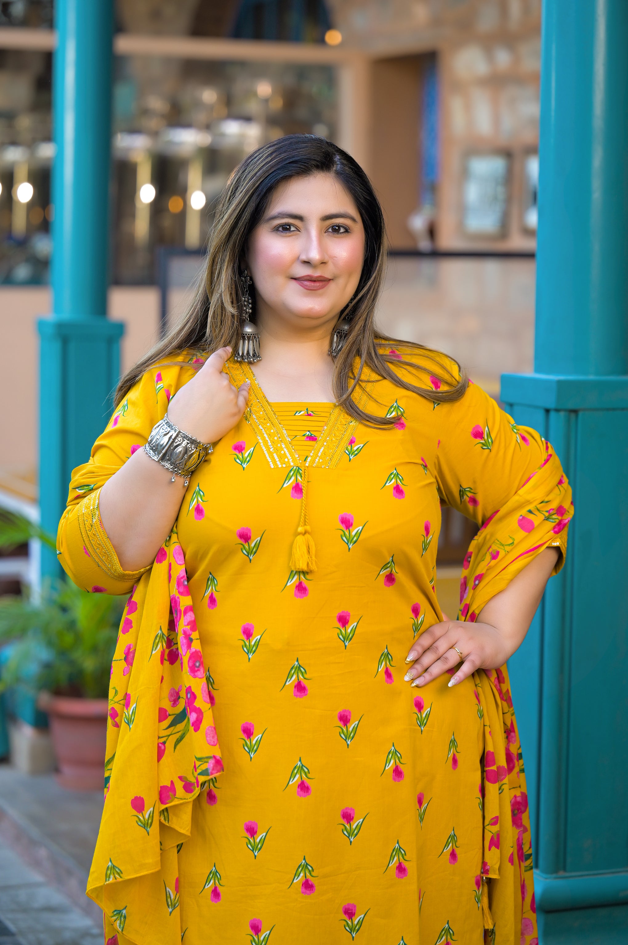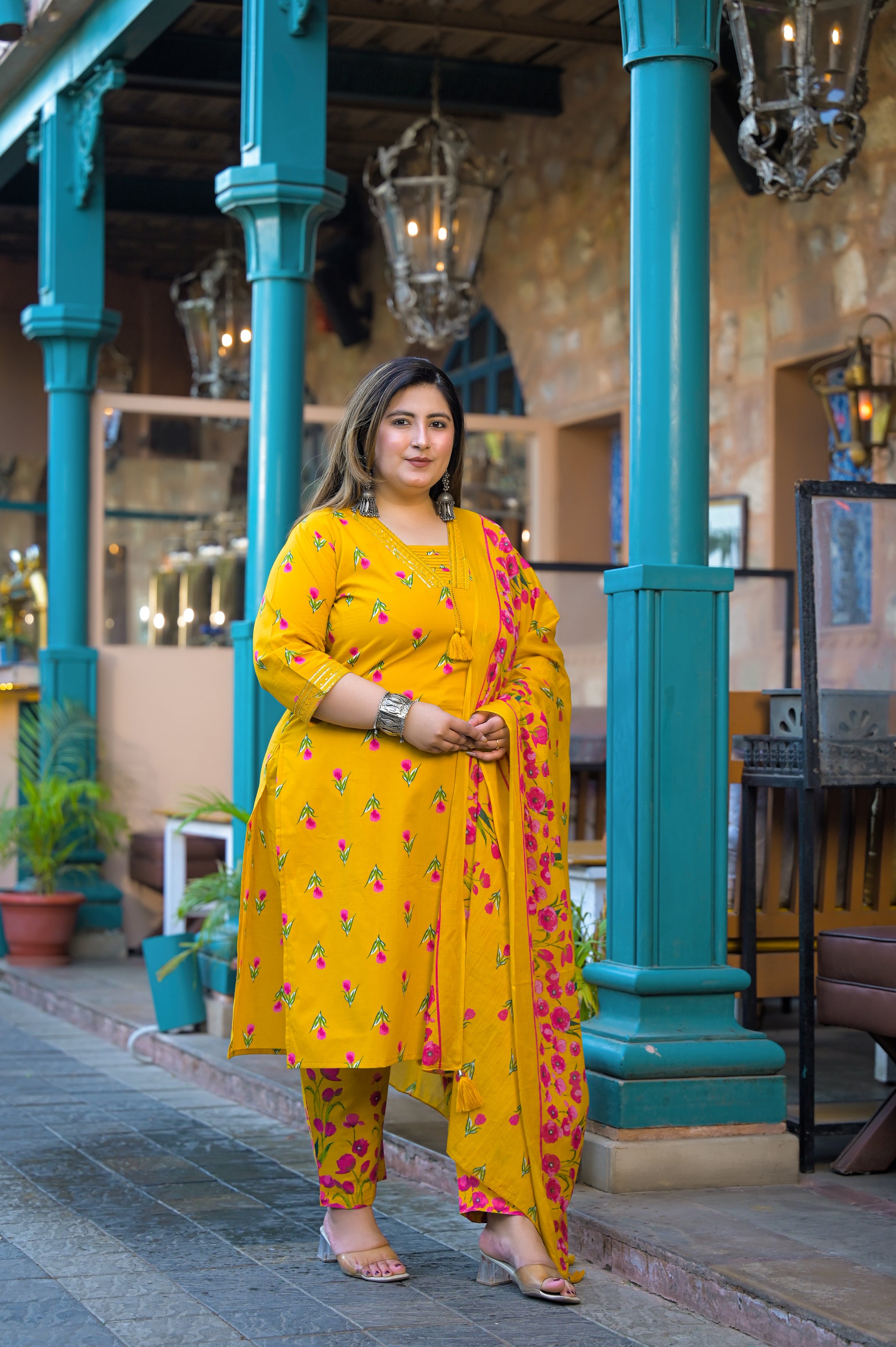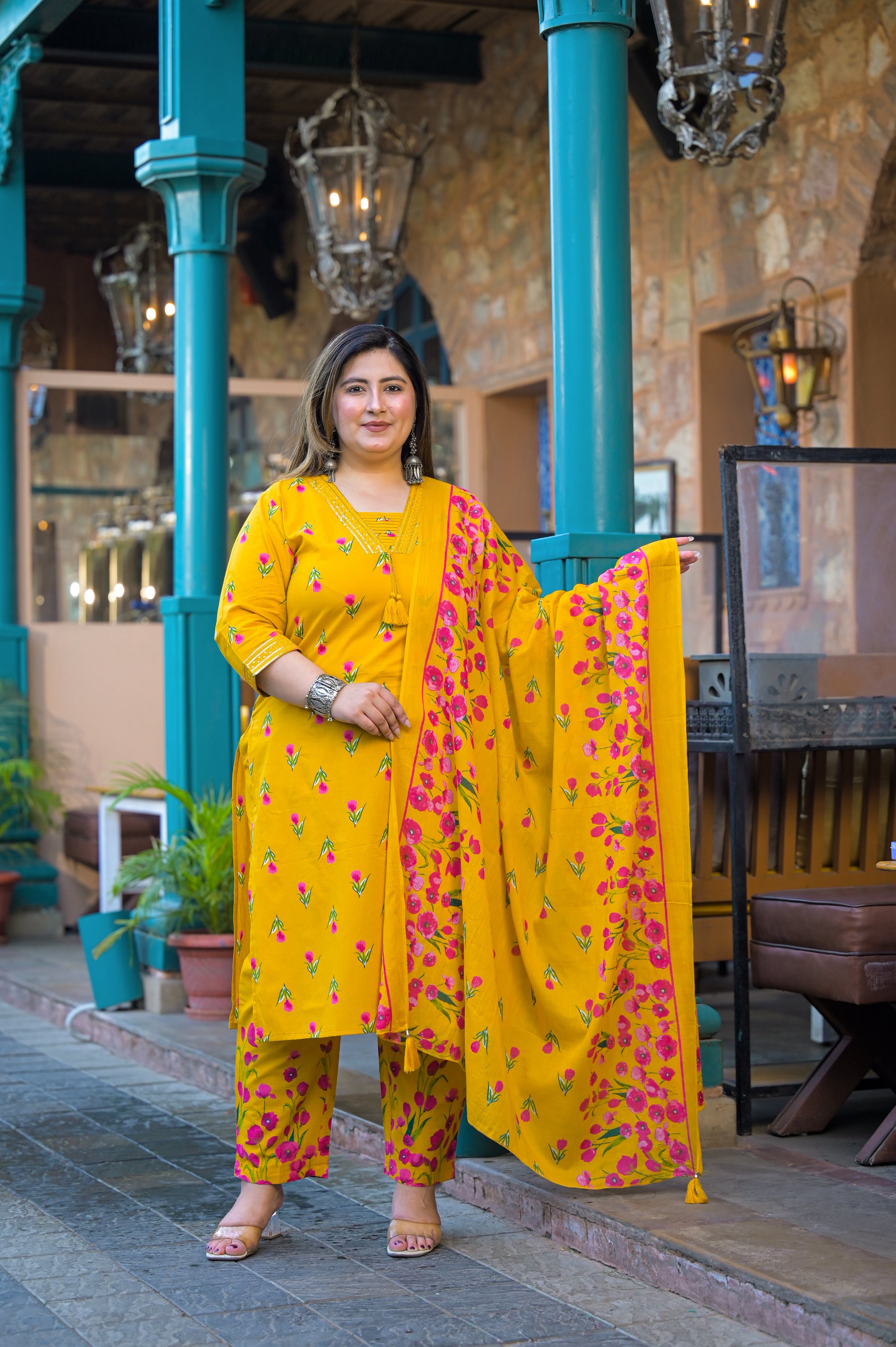 Add a vibrant touch to your ethnic collection with this Mustard Printed Cotton Kurta Pant Dupatta Set. Made from soft and breathable cotton fabric, this set offers all-day comfort and a graceful look. The kurta features a flattering V-neckline and three-quarter sleeves, adorned with elegant prints that enhance its traditional charm. Paired with a comfortable pant and a matching dupatta, this set is perfect for daily wear, casual outings, office wear, and festive occasions.