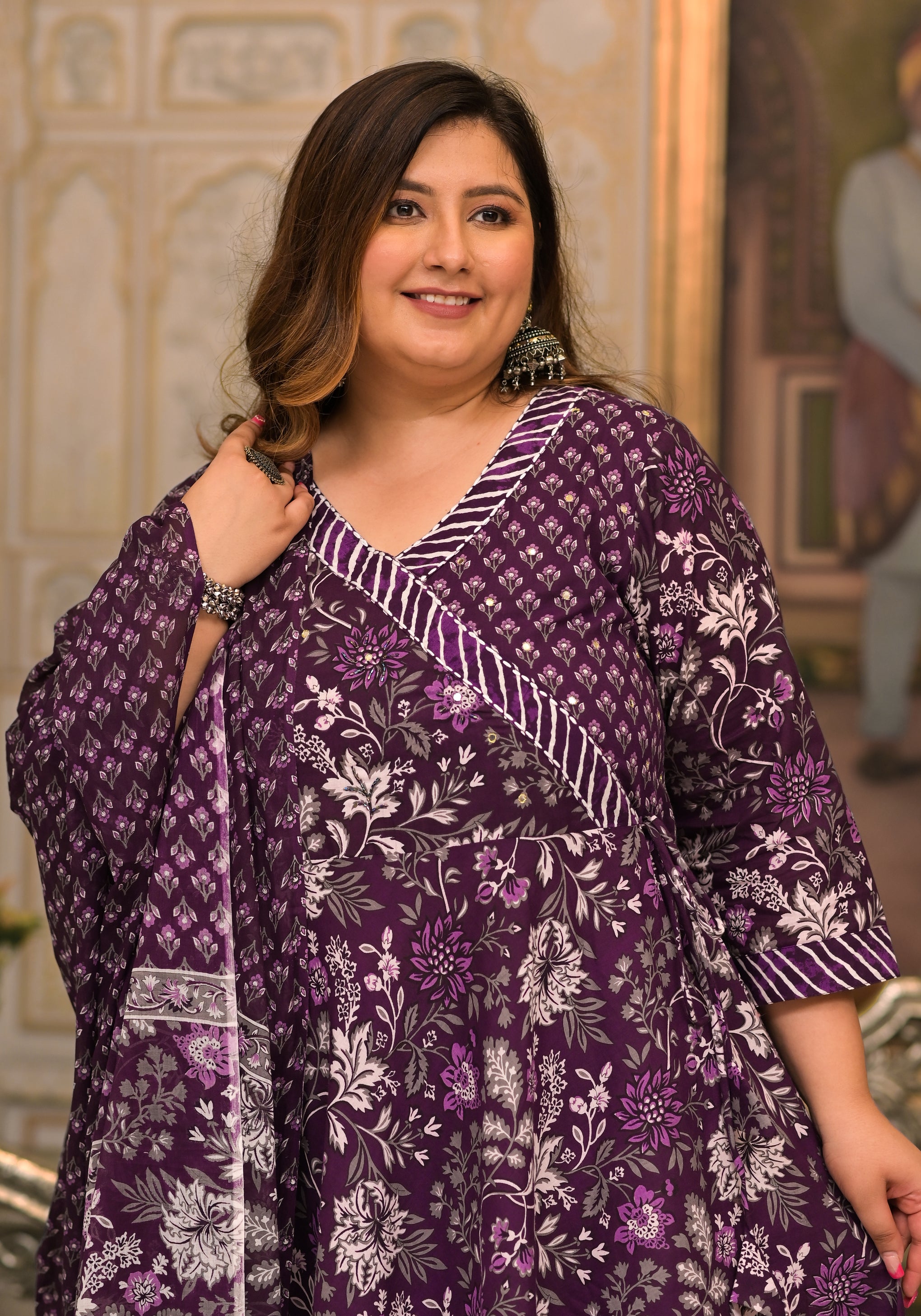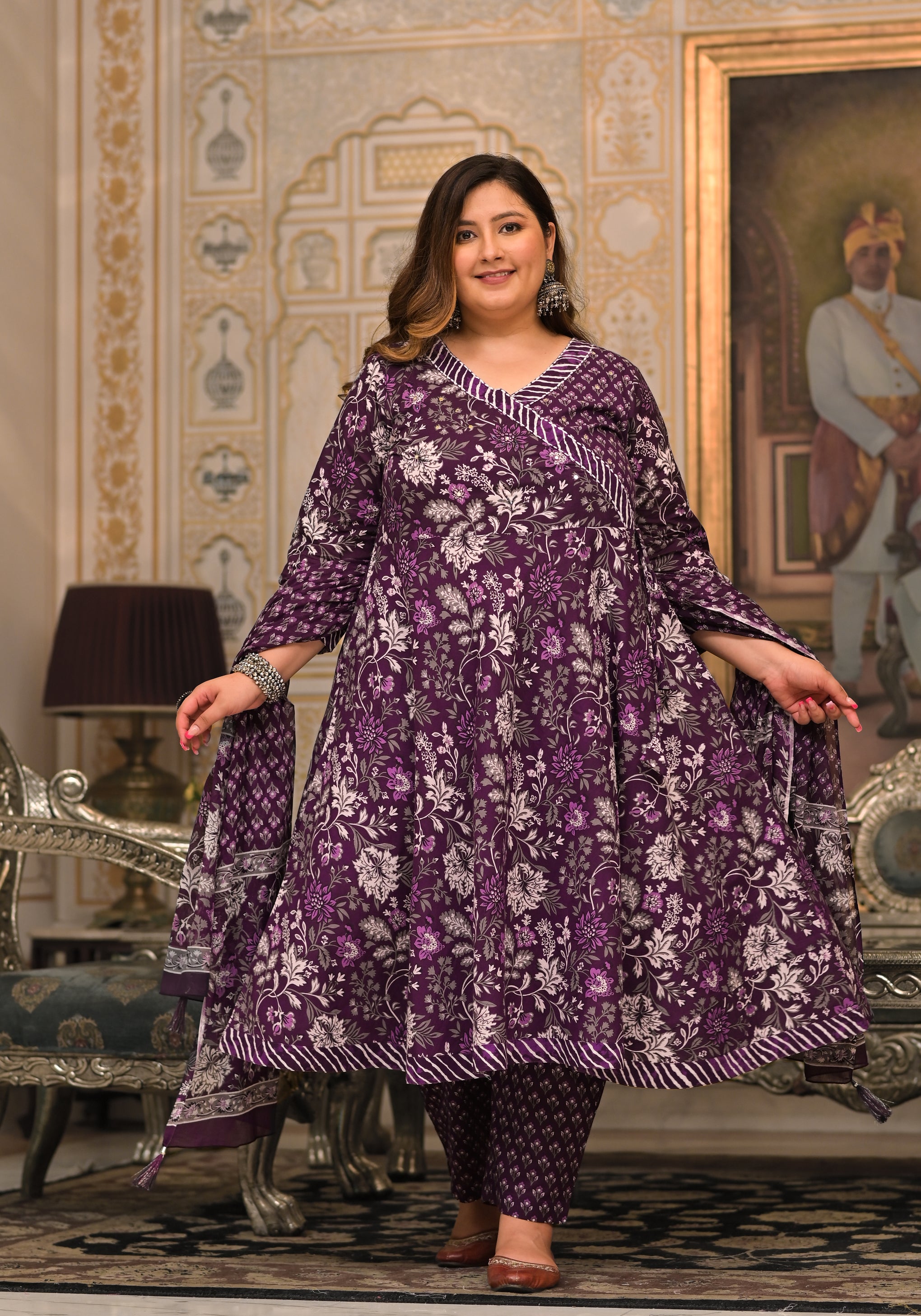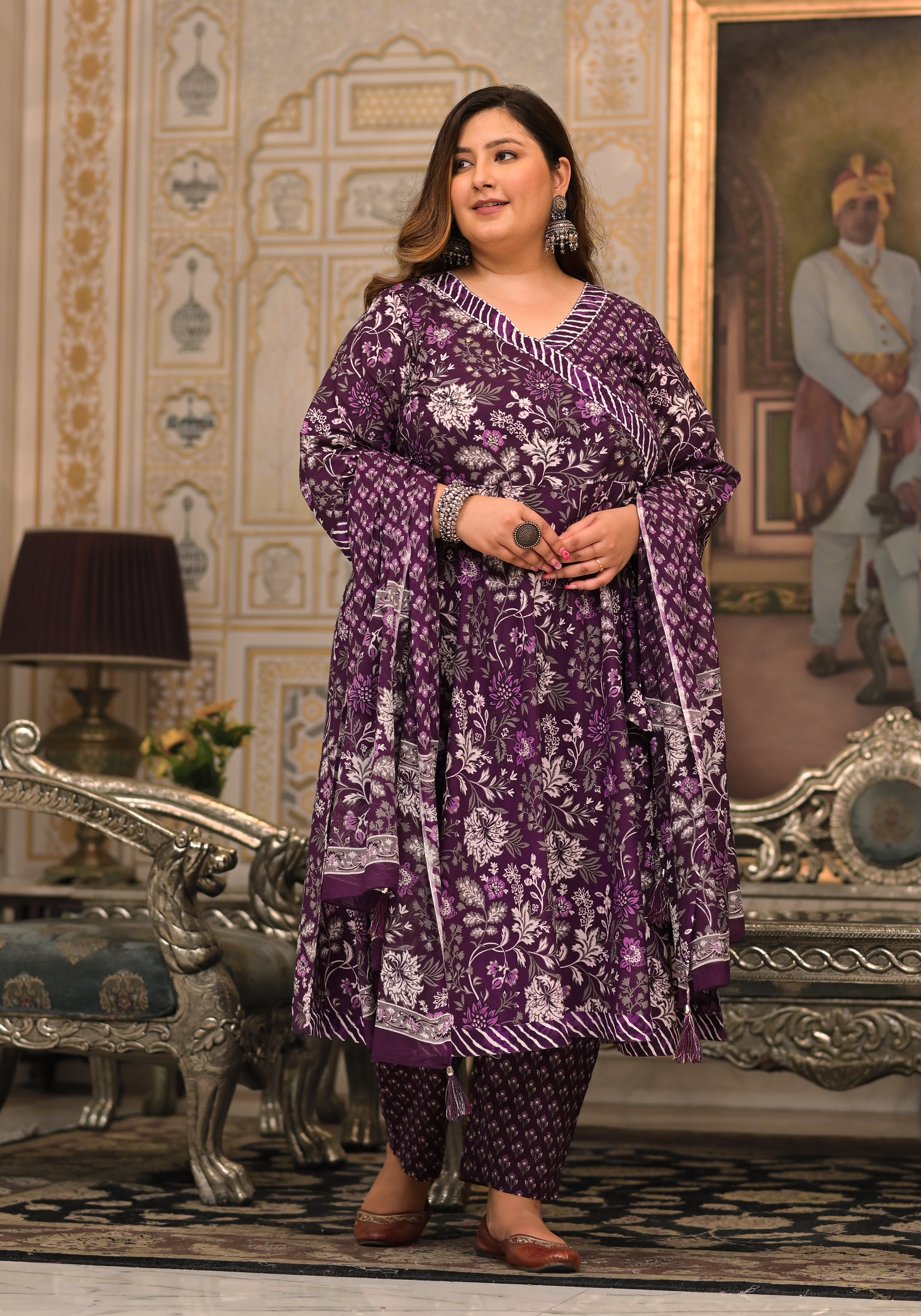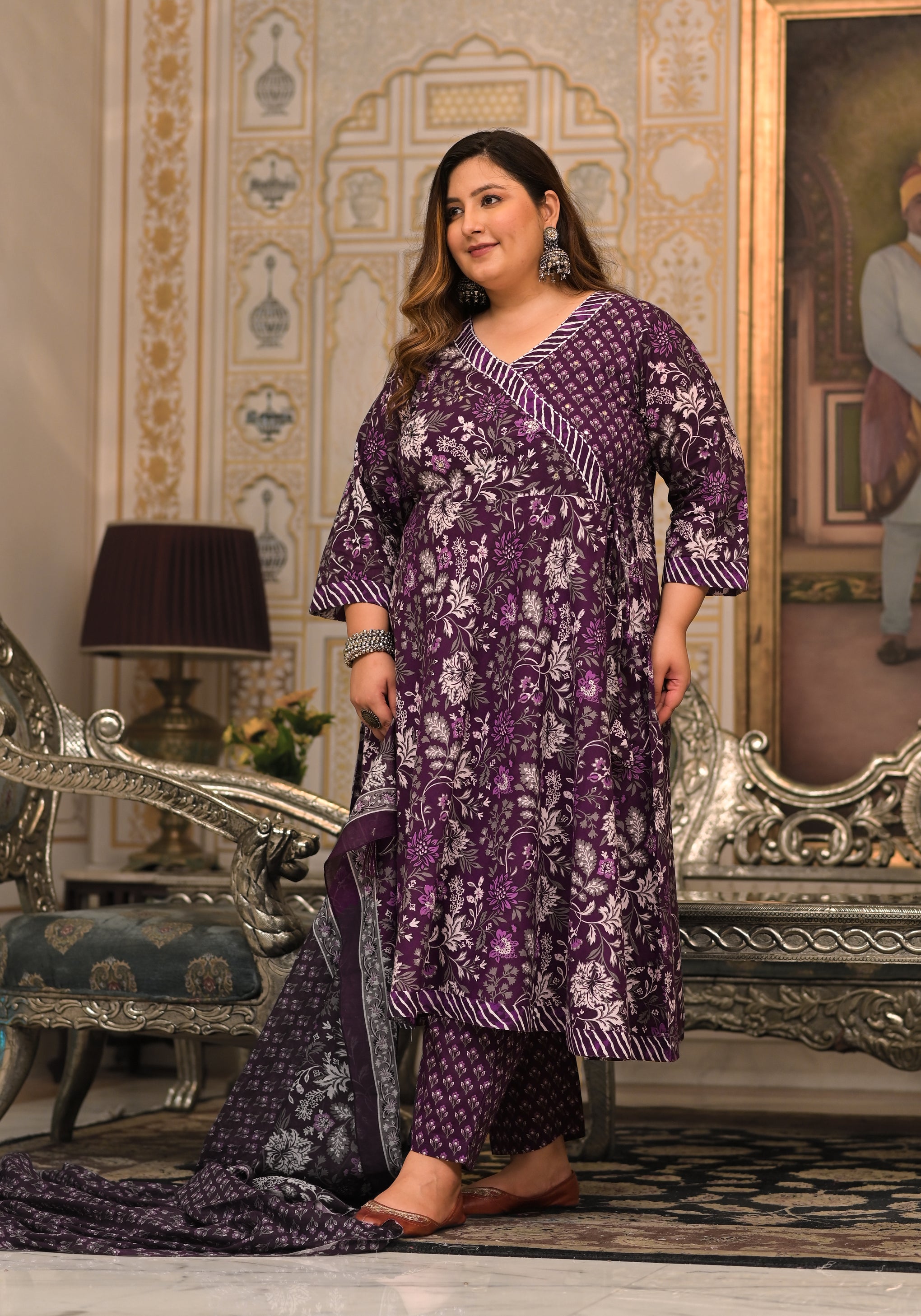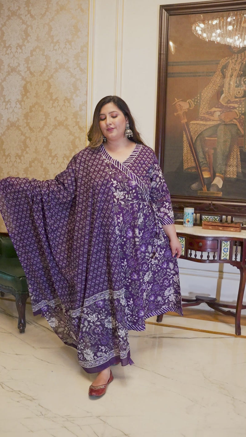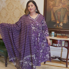 Enhance your ethnic wardrobe with this elegant Purple Printed Cotton Angarkha Kurta Pant Dupatta Set. Made from soft and breathable cotton fabric, this set offers lasting comfort with a graceful drape. The kurta features a traditional Angarkha-style neckline and three-quarter sleeves, adorned with tasteful prints that add a rich ethnic appeal. Paired with a comfortable pant and a matching dupatta, this set is perfect for daily wear, casual outings, festive occasions, and cultural gatherings.