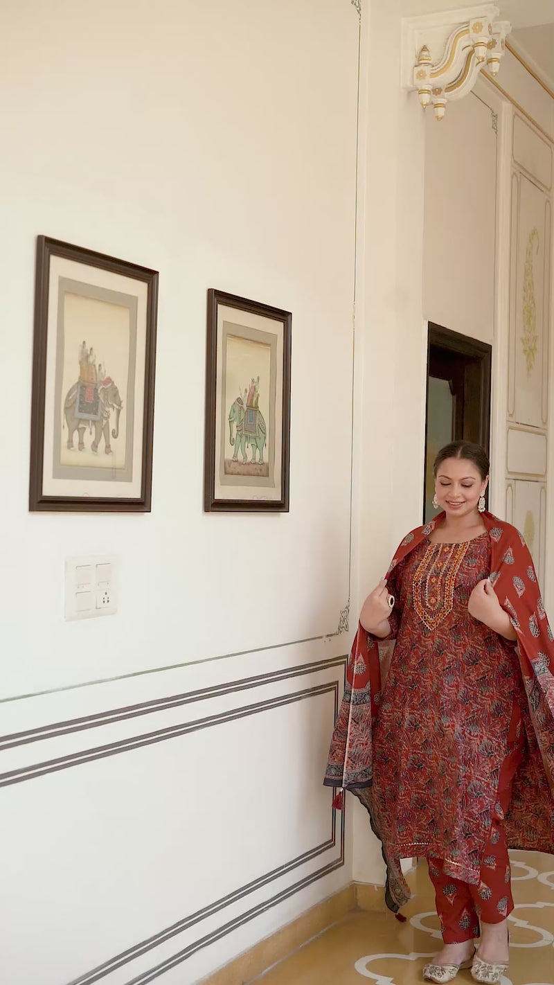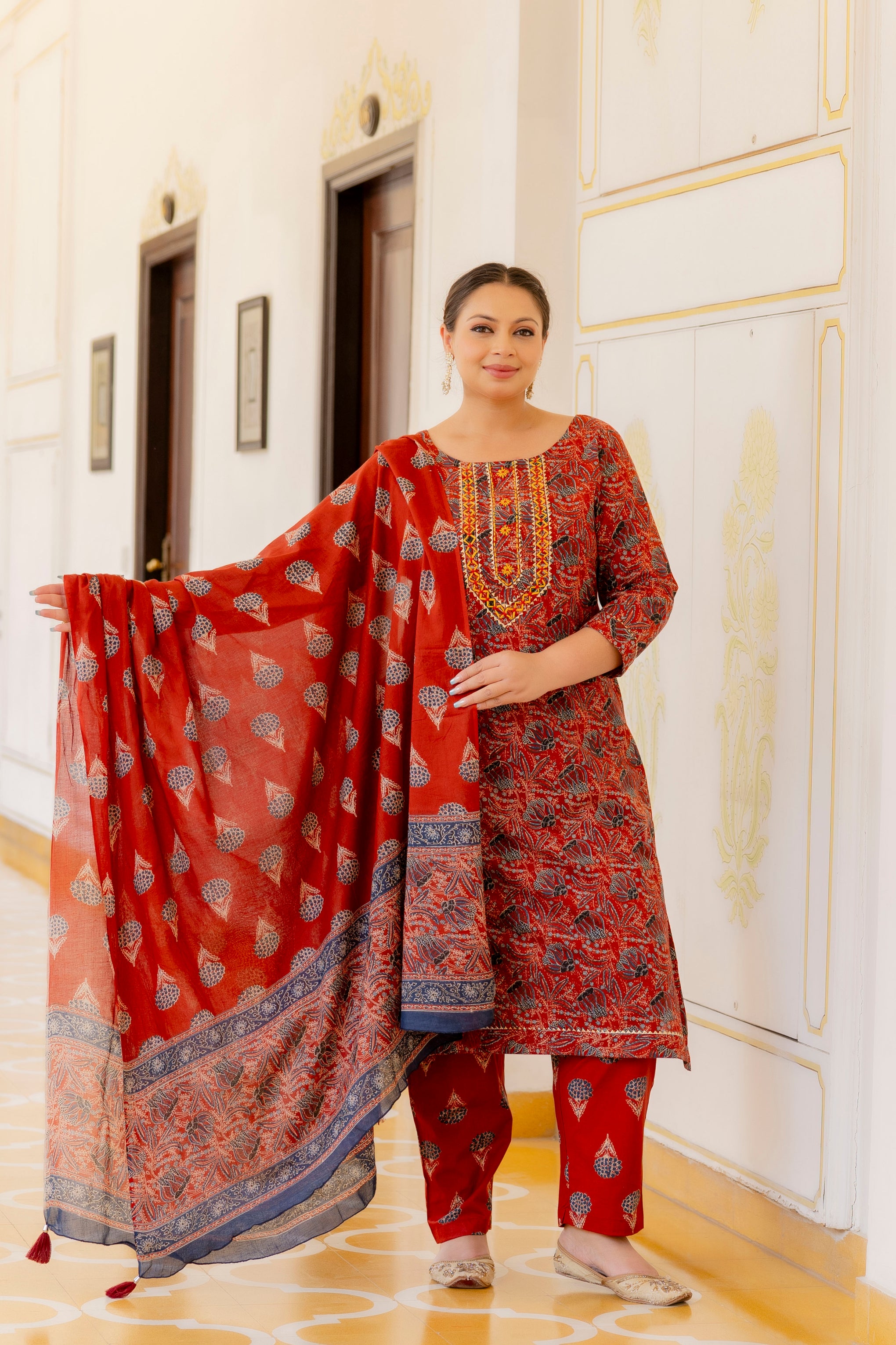 Add timeless elegance to your ethnic wardrobe with this Red Printed Cotton Kurta Pant Dupatta Set. Crafted from soft and breathable cotton fabric, this set ensures all-day comfort while keeping your style effortlessly graceful. The kurta features a classic round neckline and three-quarter sleeves, enhanced with beautiful prints that add a traditional yet modern appeal. Paired with a comfortable pant and a matching dupatta, this set is perfect for daily wear, festive gatherings, and casual occasions.