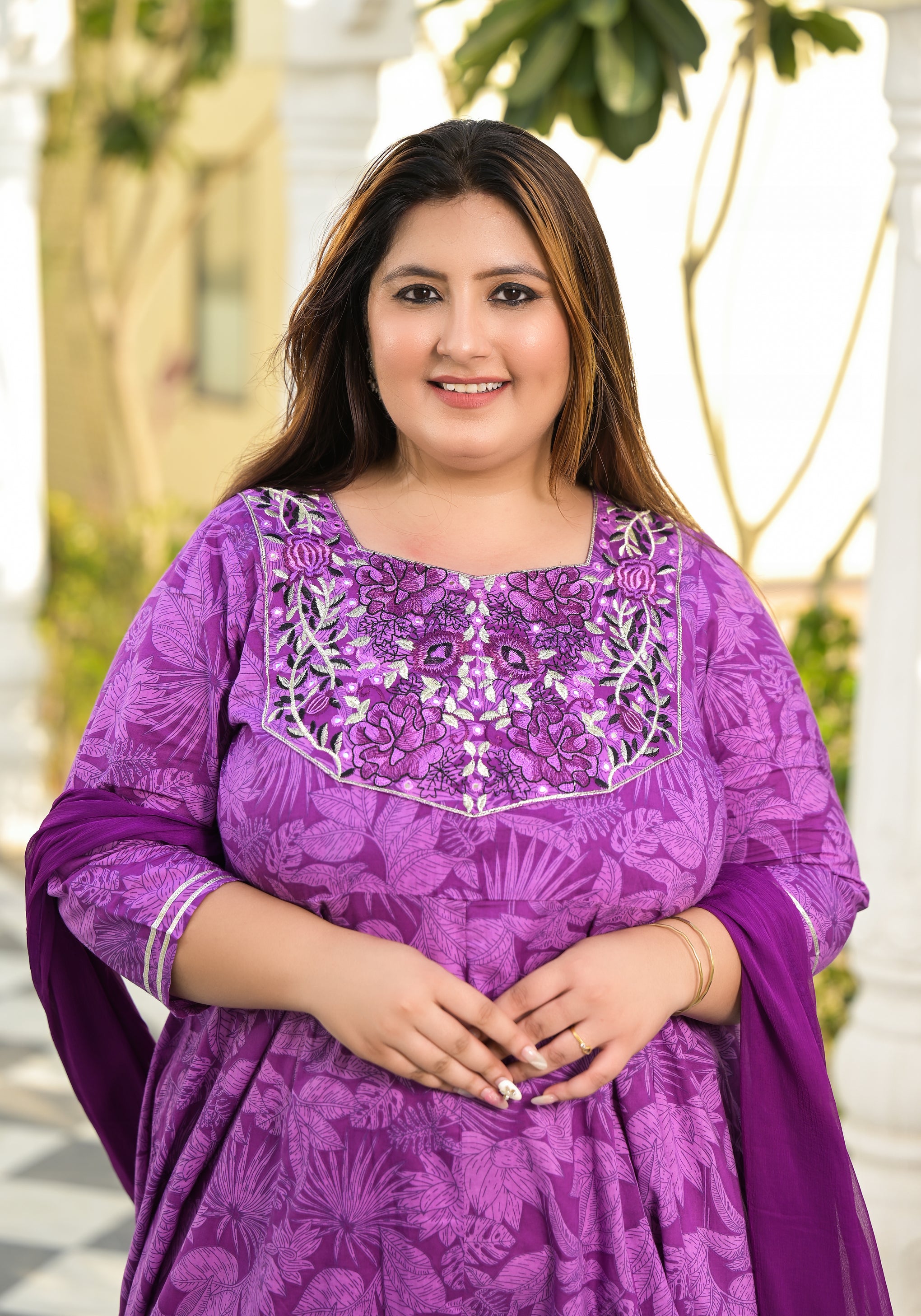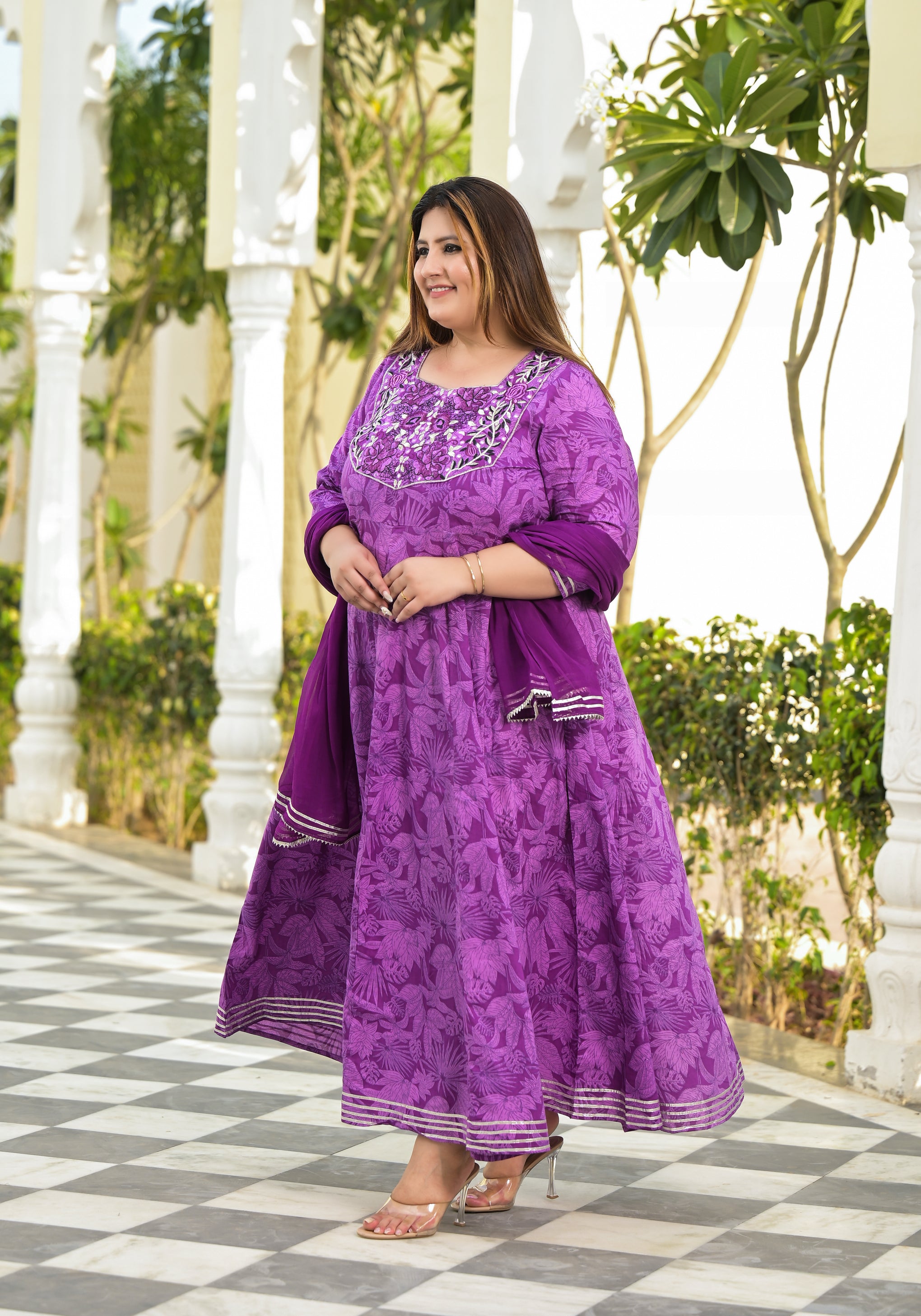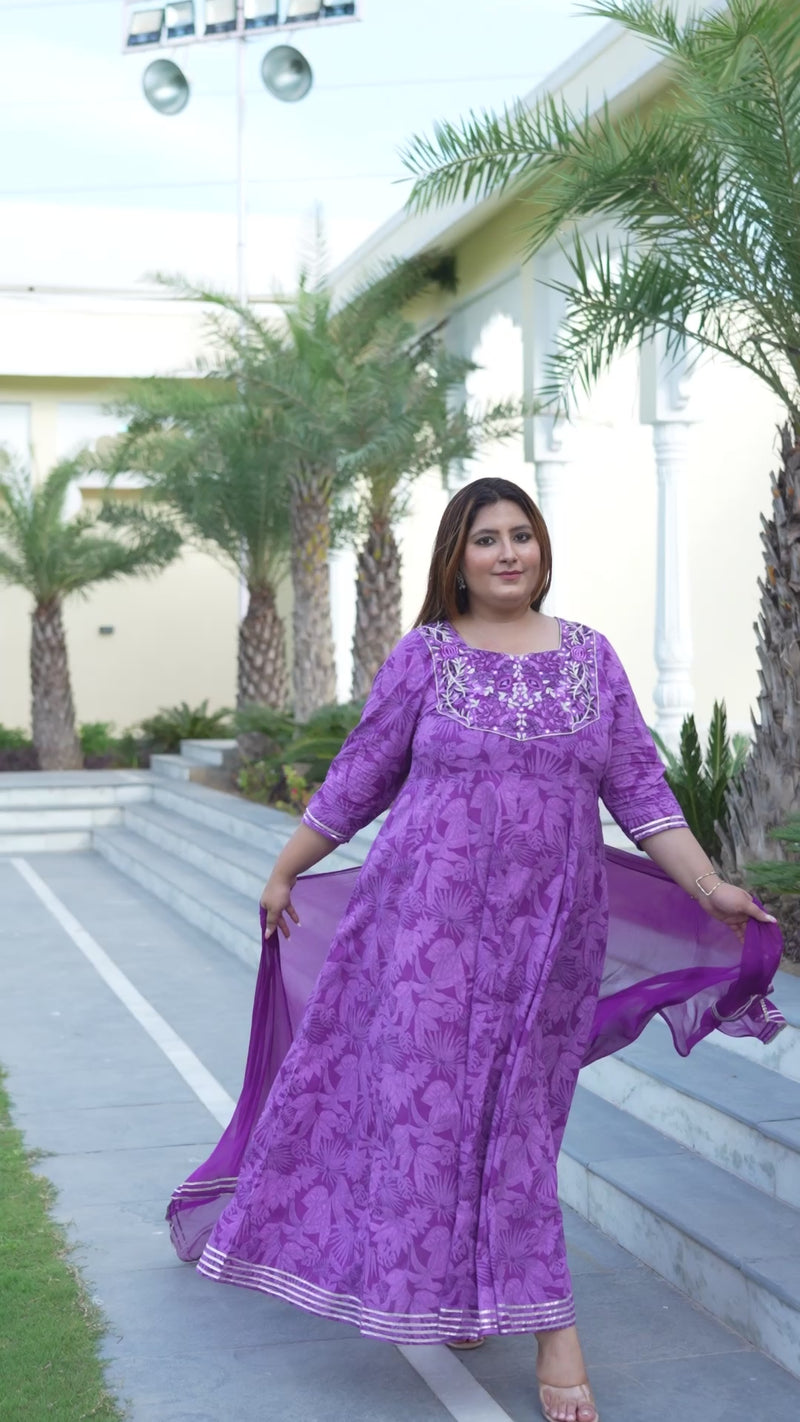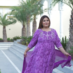 Enhance your festive wardrobe with this Violet Cotton Embroidered Anarkali With Dupatta Set. Made using soft and breathable cotton, it promises comfort along with a stylish ethnic look. The delicate embroidery adds richness to the design, making it ideal for special occasions and celebrations. Designed with a trendy square neckline and three-quarter sleeves, this Anarkali offers a graceful silhouette. The matching dupatta completes the look with traditional elegance.