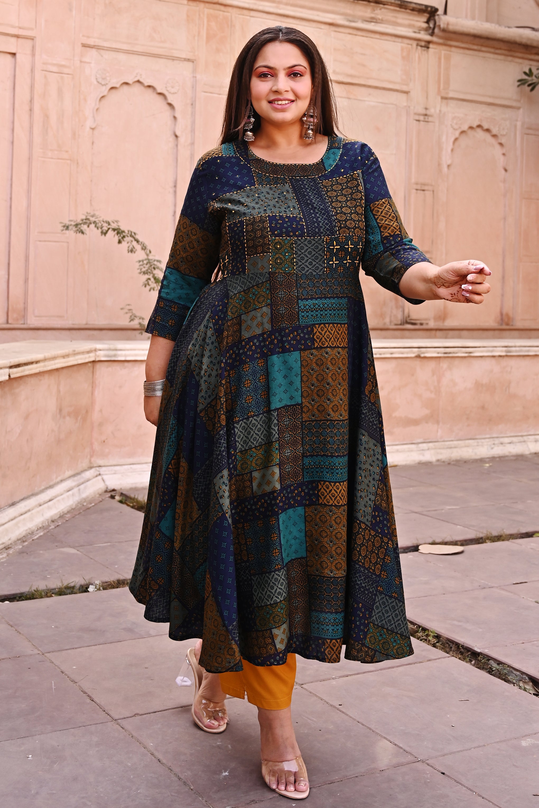 Rayon Printed Multicolor Calf-Length Anarkali Kurti with Three Quarter Sleeves (Plus Size)