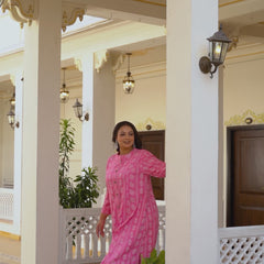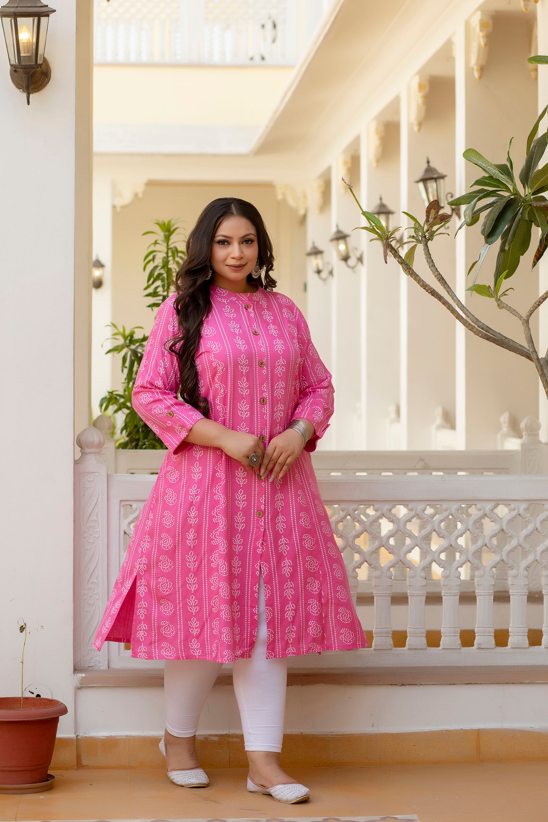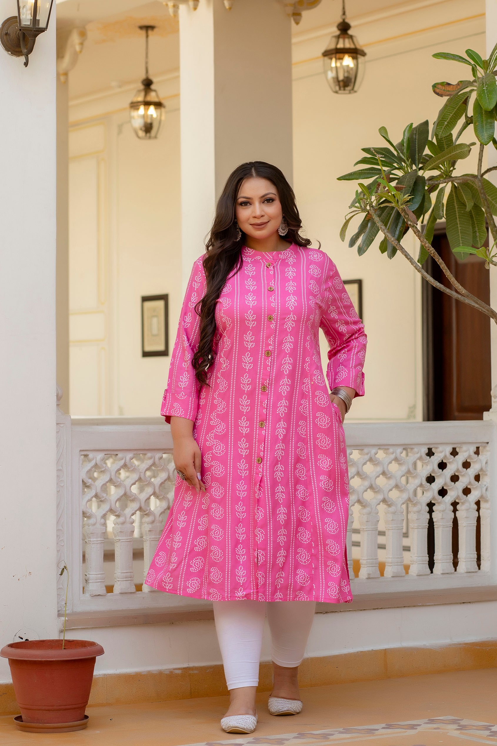 Rayon Printed Pink  Calf-Length Kurti with Three Quarter Sleeves (Plus Size)
