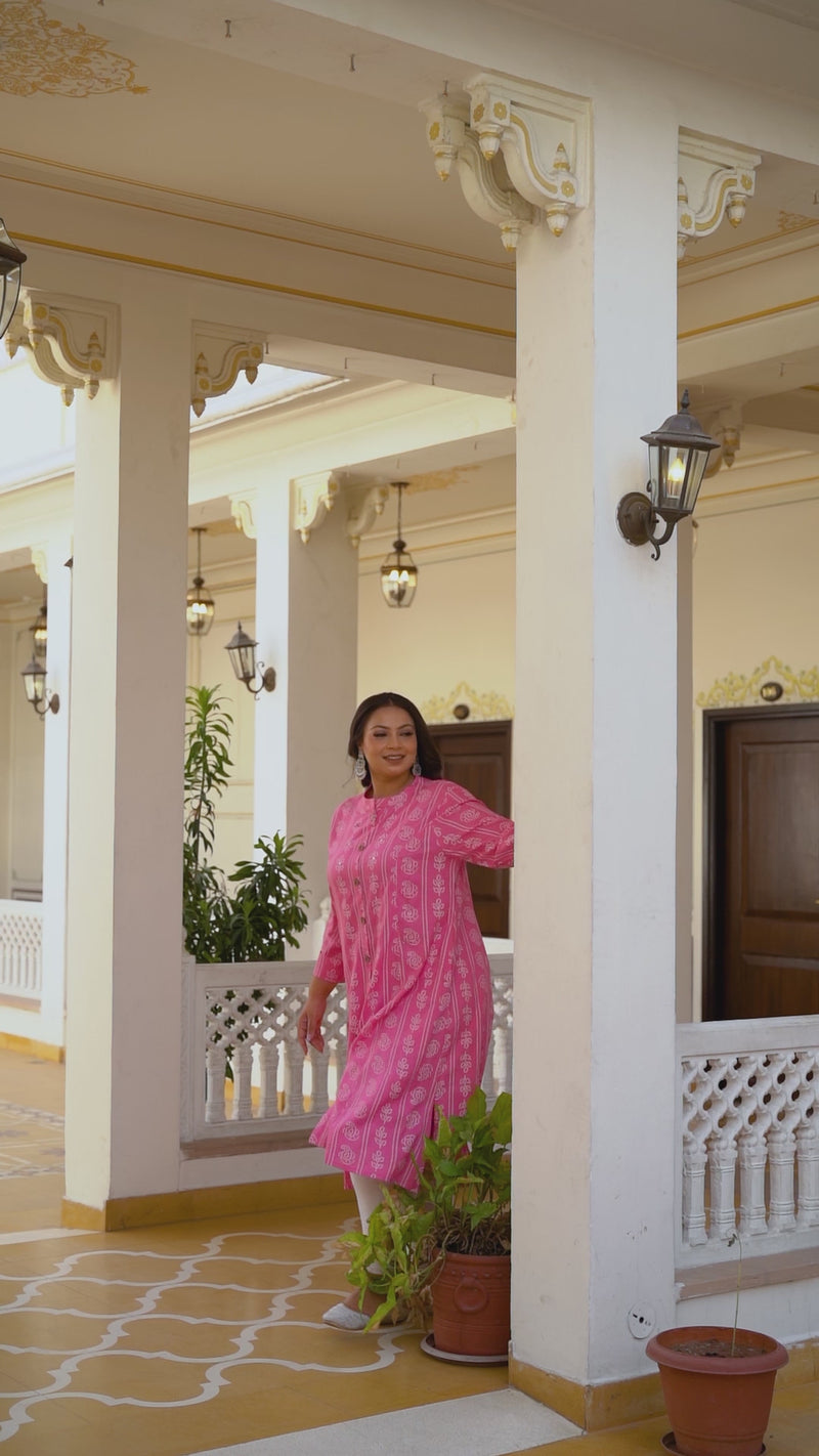 Rayon Printed Pink Calf-Length Kurti with Three Quarter Sleeves (Plus Size)