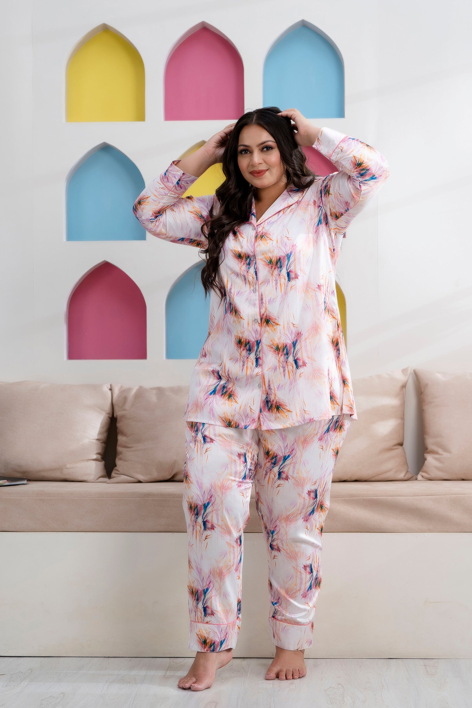 d in pure comfort with this Light Pink Satin Printed Long Shirt & Pyjama Night Suit. Designed from smooth and luxurious satin fabric, it offers a soft and silky touch against the skin, ensuring a peaceful and relaxed night’s sleep. The stylish printed pattern adds a charming appeal while the classic collar design and full sleeves give it a refined look. The matching pajama ensures a perfectly coordinated bedtime style, making it an ideal pick for nightwear or cozy lounging at home.