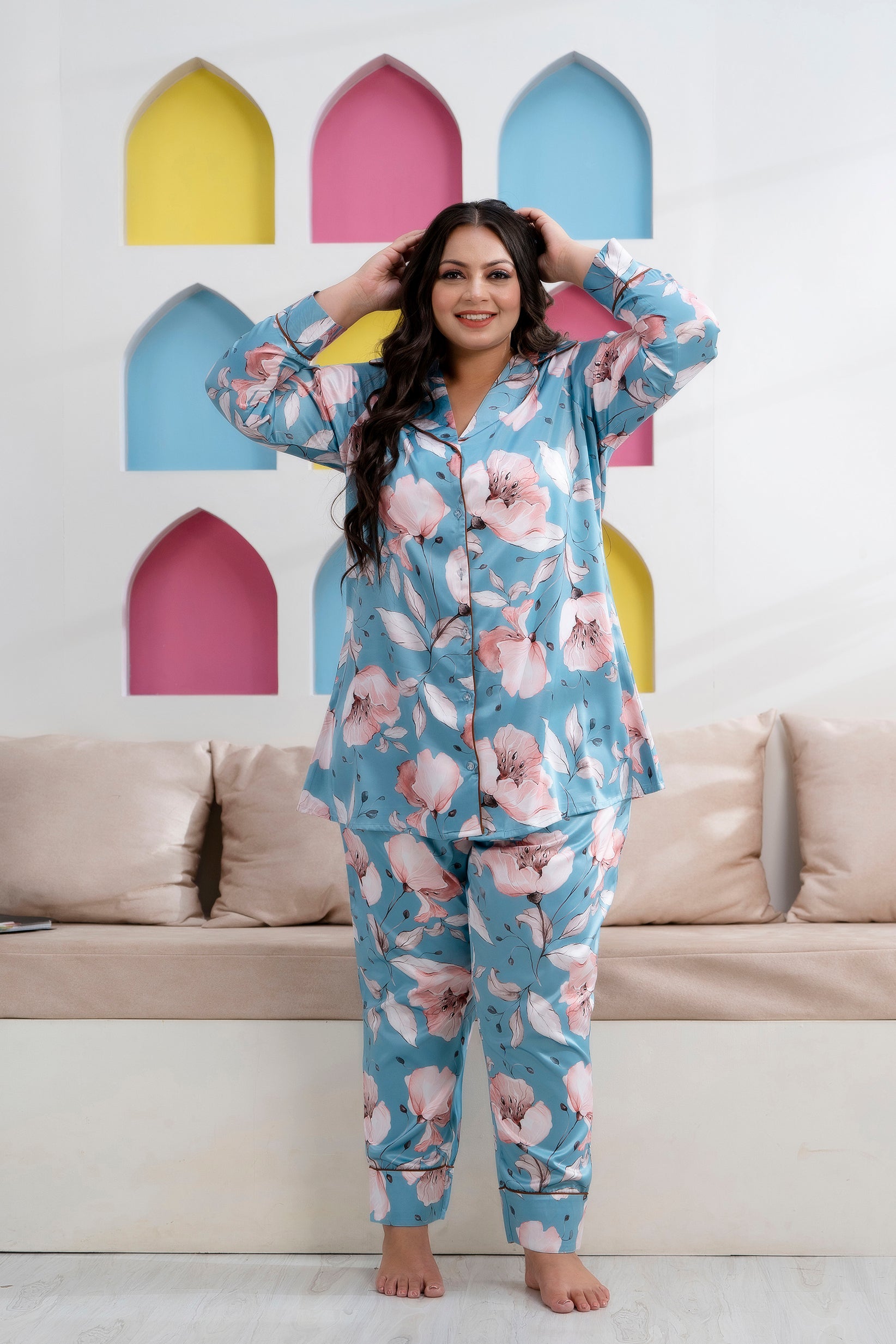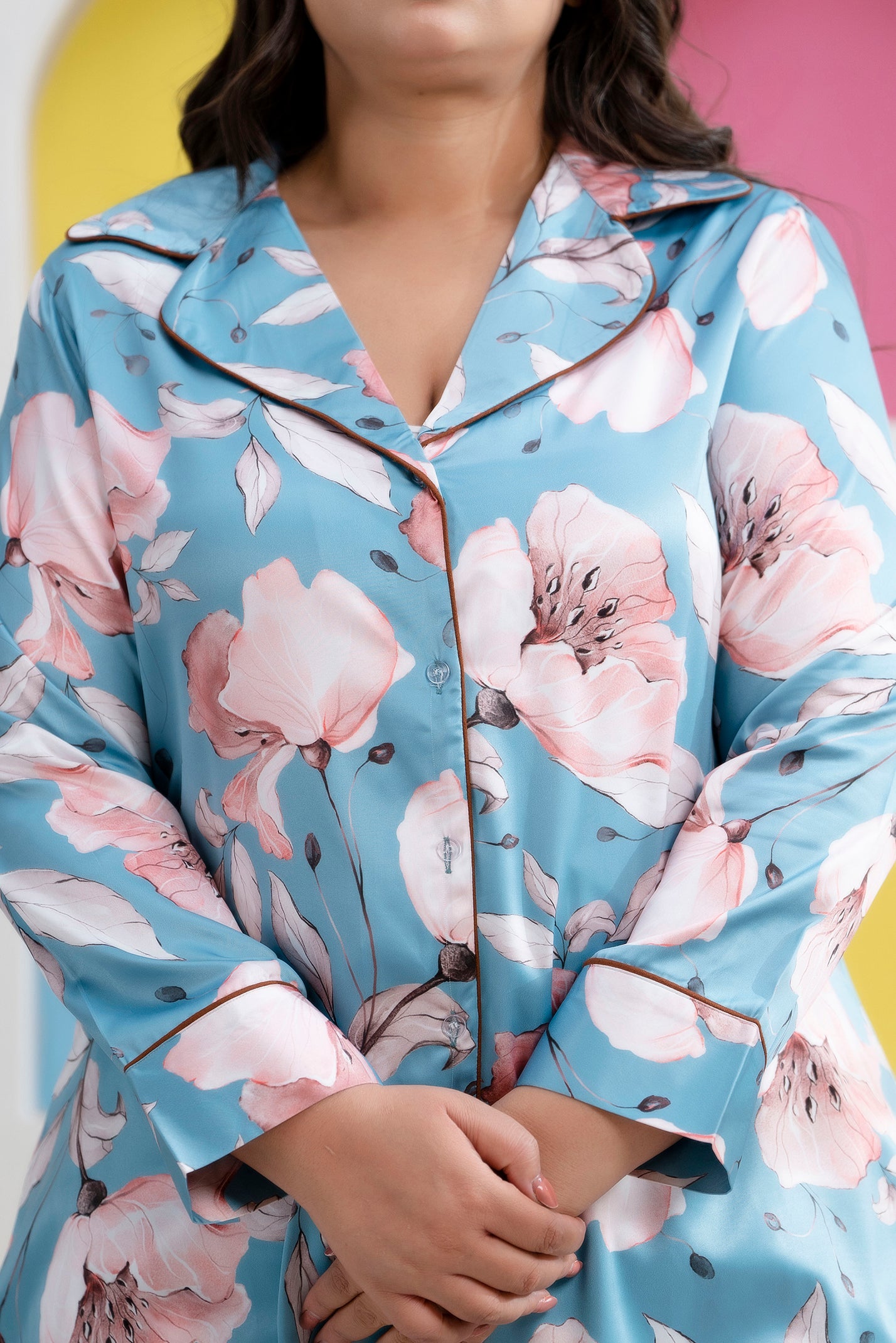 Indulge in effortless comfort with this Sea Green Satin Printed Long Shirt & Pyjama Night Suit. Crafted from premium satin, it feels luxuriously smooth and gentle on the skin, ensuring a relaxing night’s sleep. The stylish printed pattern paired with a smart collar neckline and full sleeves gives it an elegant appearance. With a perfectly matching pyjama, this night suit is a blend of comfort, charm, and style — ideal for cozy evenings and peaceful nights.