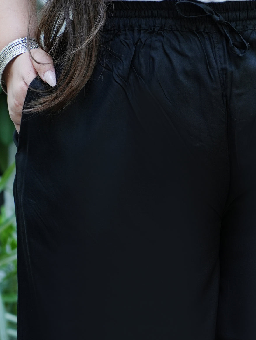 Add effortless elegance to your wardrobe with this Black Rayon Solid Palazzo. Crafted from soft and flowy rayon fabric, it ensures superior comfort and a flattering drape throughout the day. The versatile solid black color makes it easy to pair with kurtas, tunics, tops, or shirts — perfect for creating both casual and festive looks. Designed with a relaxed and stylish fit, this palazzo is ideal for daily wear as well as special occasions.