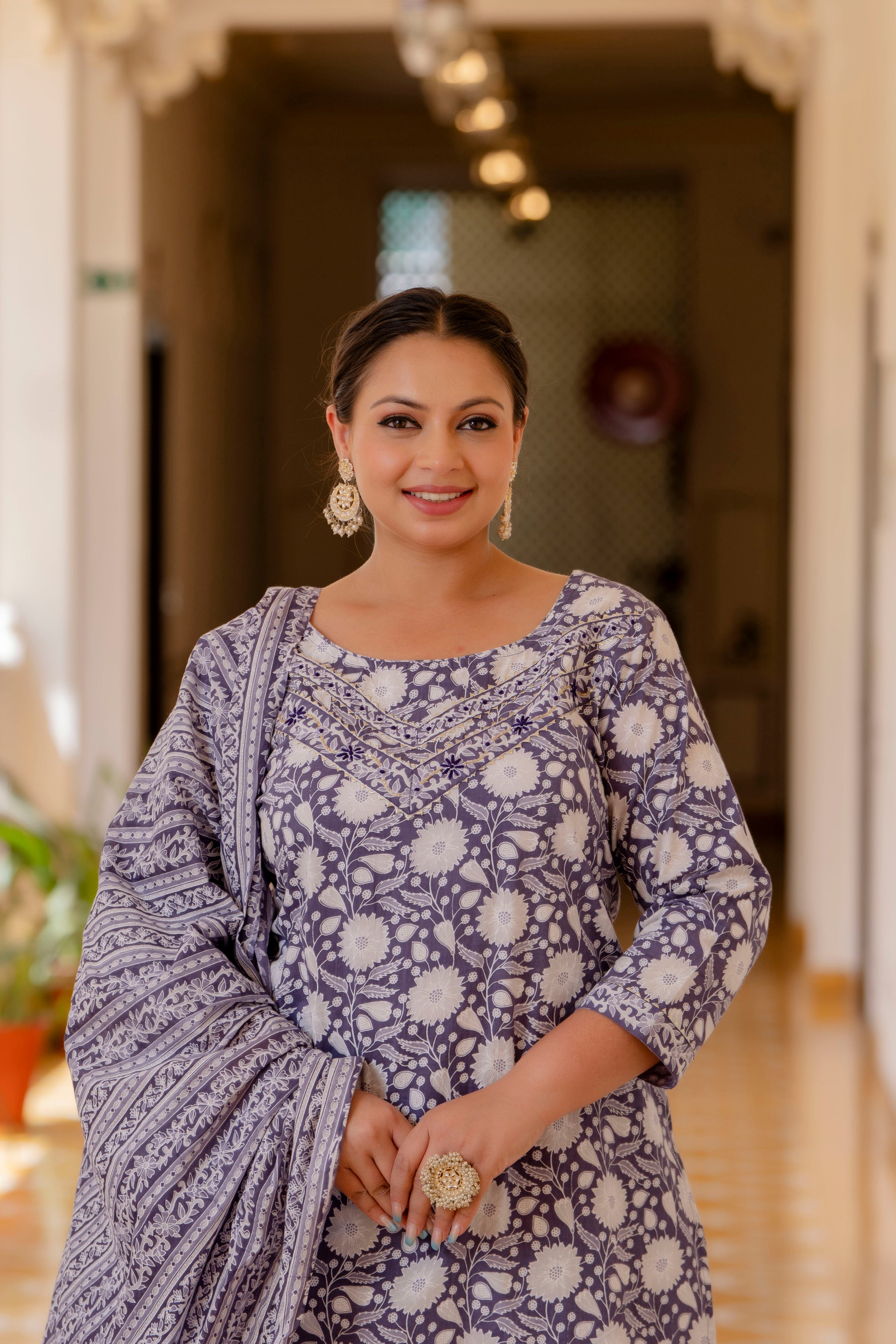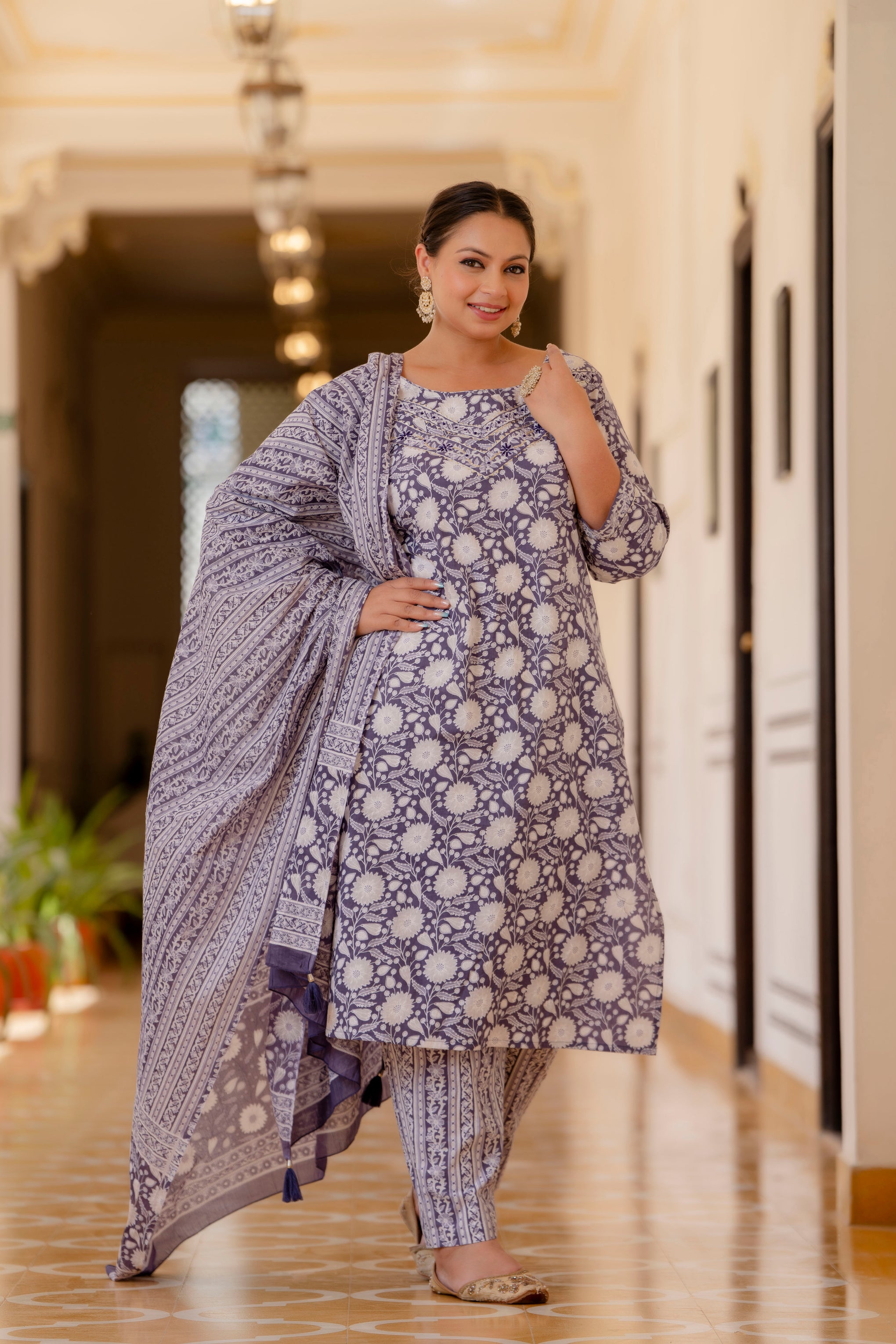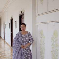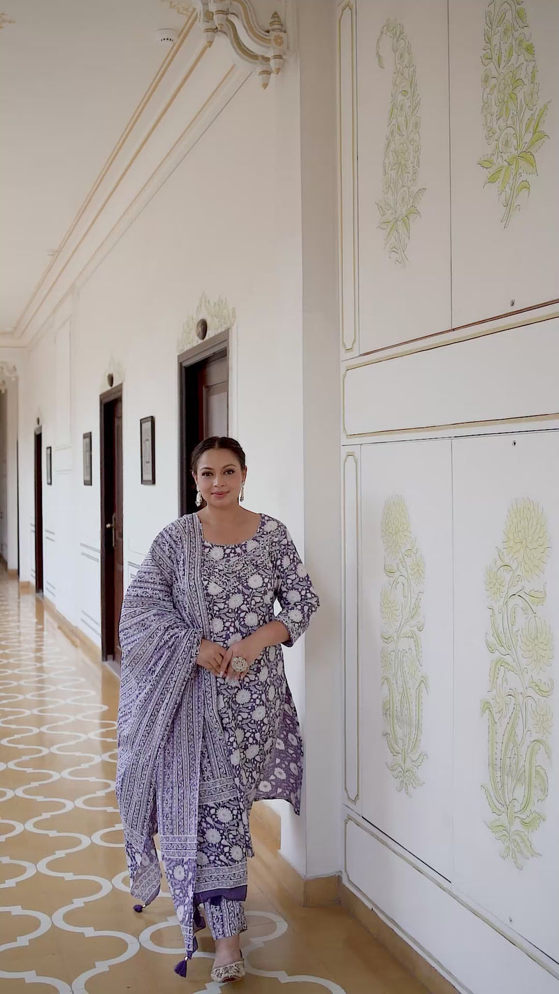 Add a stylish touch to your everyday ethnic wardrobe with this Purple Cotton Printed Kurta Pant Dupatta Set. Designed using soft and breathable cotton fabric, it keeps you comfortable throughout the day while maintaining a refined look. The kurta features a round neckline, three-quarter sleeves, and a flattering calf-length silhouette. With matching pants and a coordinated dupatta, this set offers a complete and effortlessly elegant outfit for multiple occasions.
