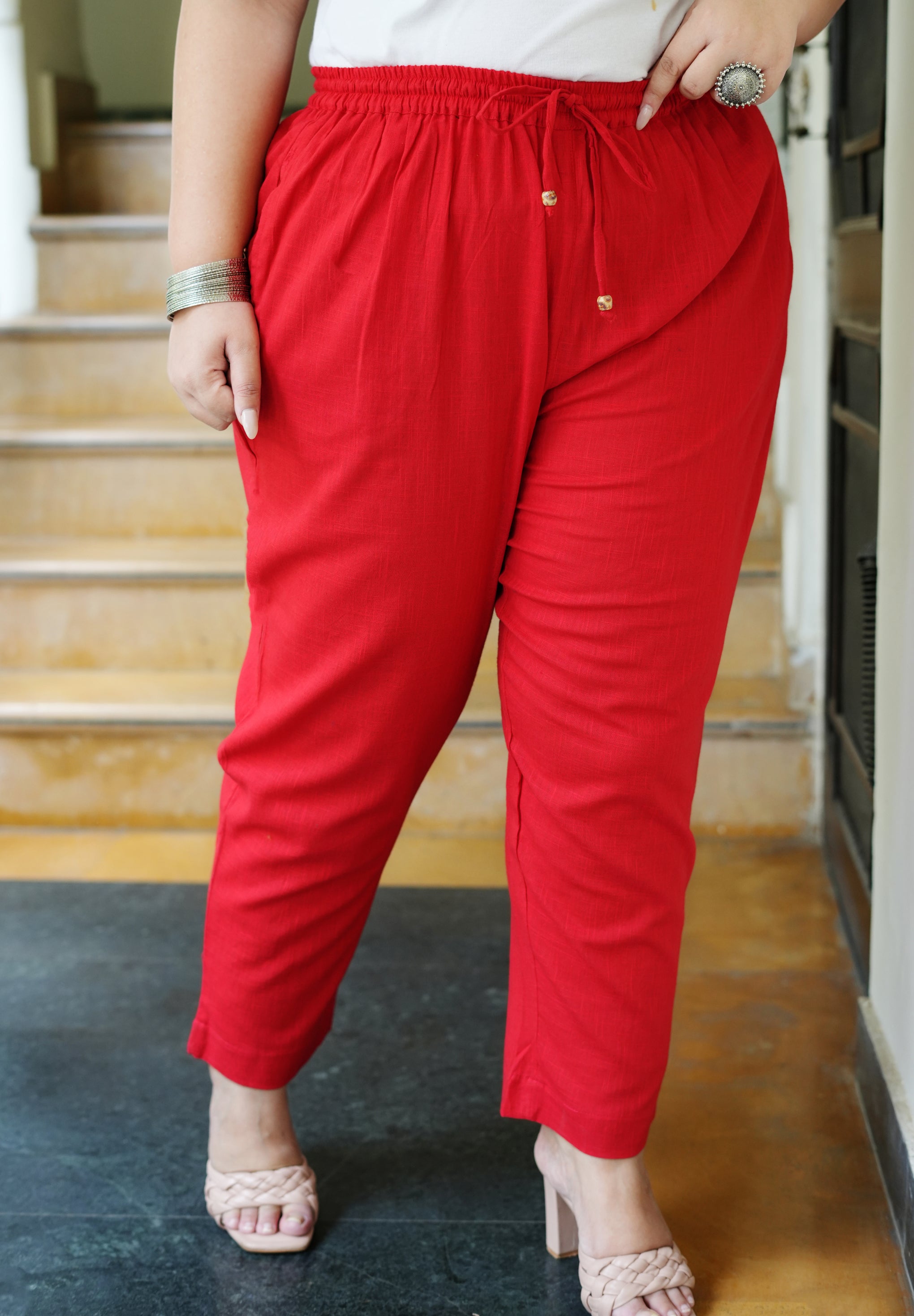 Bring a vibrant touch to your everyday style with this Red Cotton Solid Trouser. Crafted from soft and breathable cotton fabric, it delivers comfort and ease throughout the day. The bold red shade adds a statement look while still pairing well with a variety of casual tops, kurtas, and tunics. Designed for daily use, this trouser ensures a relaxed fit perfect for outings, work-from-home comfort, or leisure moments.