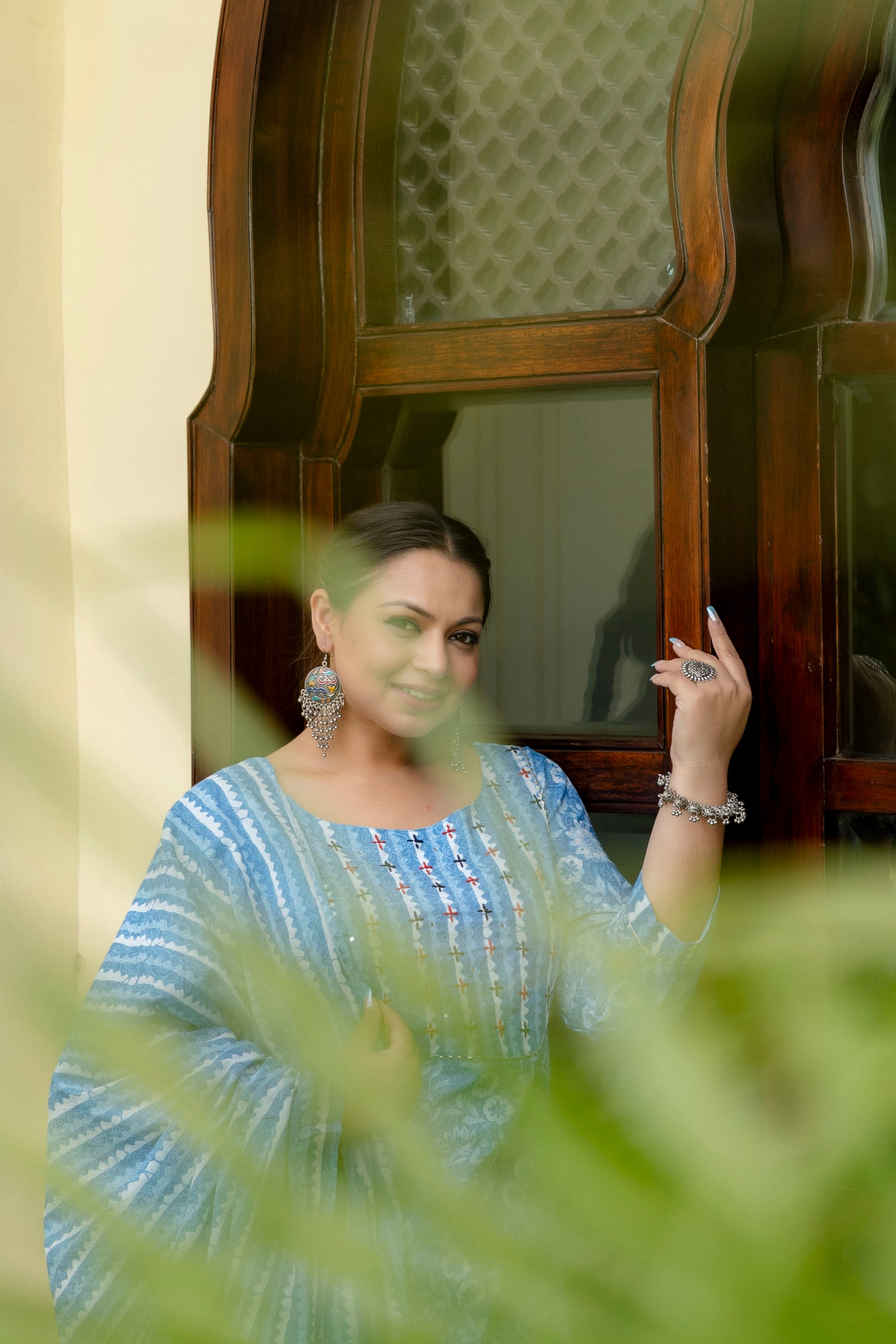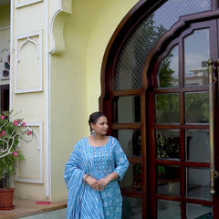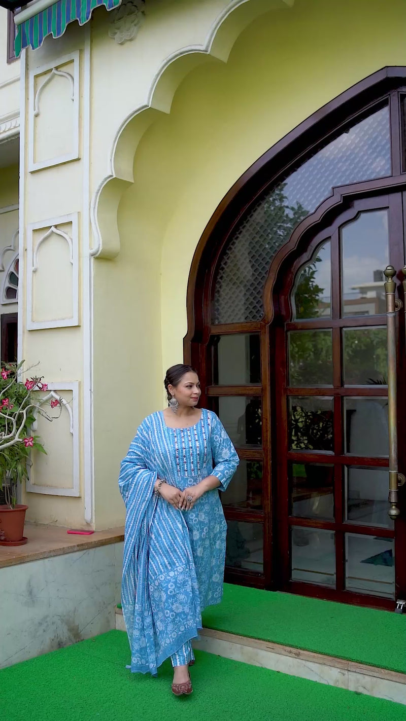 Refresh your everyday ethnic style with this Sky Blue Cotton Printed Kurta Pant Dupatta Set. Made from lightweight and breathable cotton fabric, this set ensures maximum comfort while adding an elegant touch to your look. The kurta features a classic round neckline, three-quarter sleeves, and a modest calf-length silhouette — perfect for daily wear as well as casual occasions. Paired with matching pants and a coordinated dupatta, this set offers a complete and stylish ensemble with minimal effort.