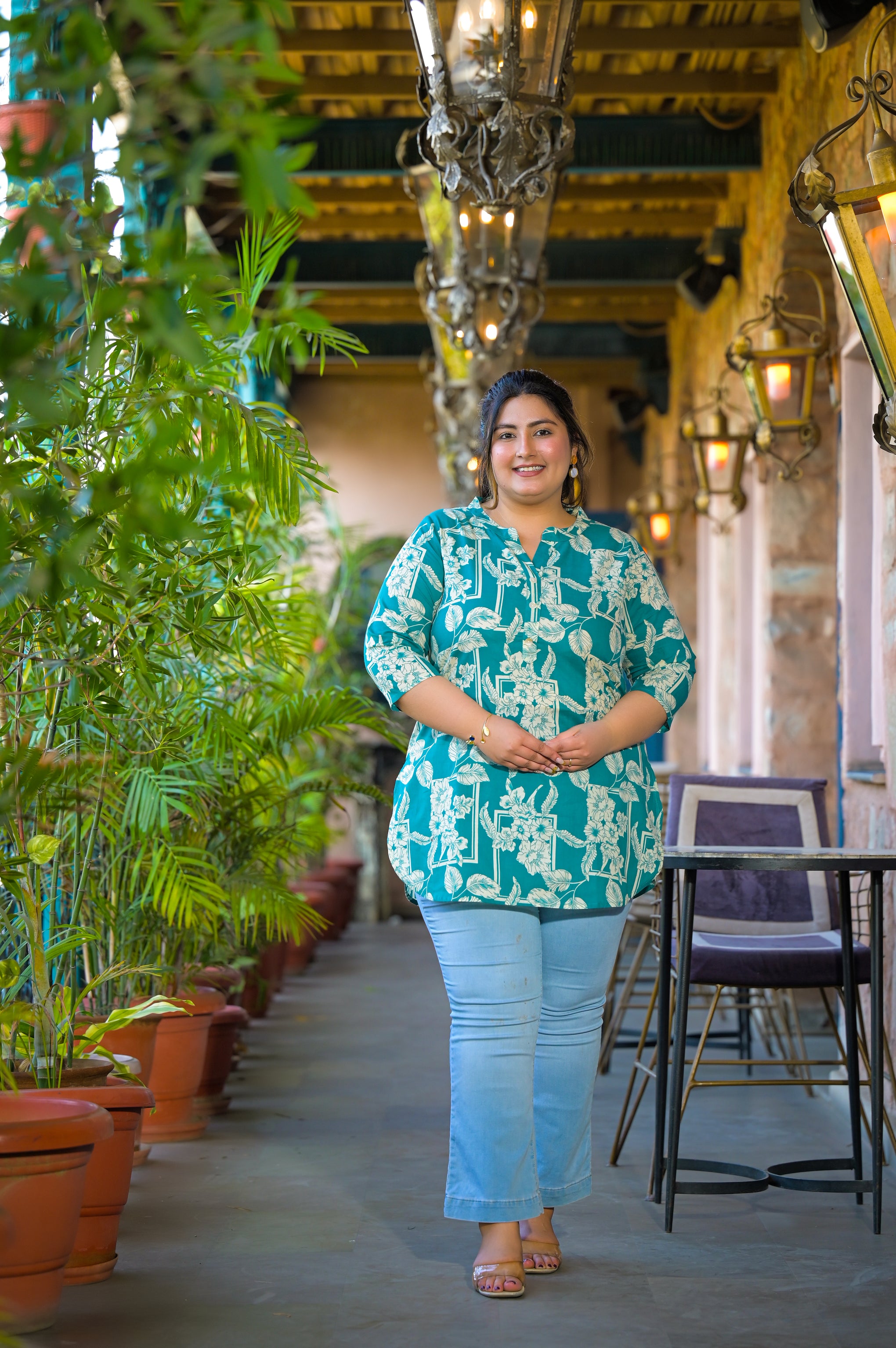 The printed pattern adds a trendy touch, while the short-length silhouette creates a flattering look. Easy to pair with jeans, trousers, or palazzos, this teal cotton top is ideal for daily wear, office wear, and casual outings.