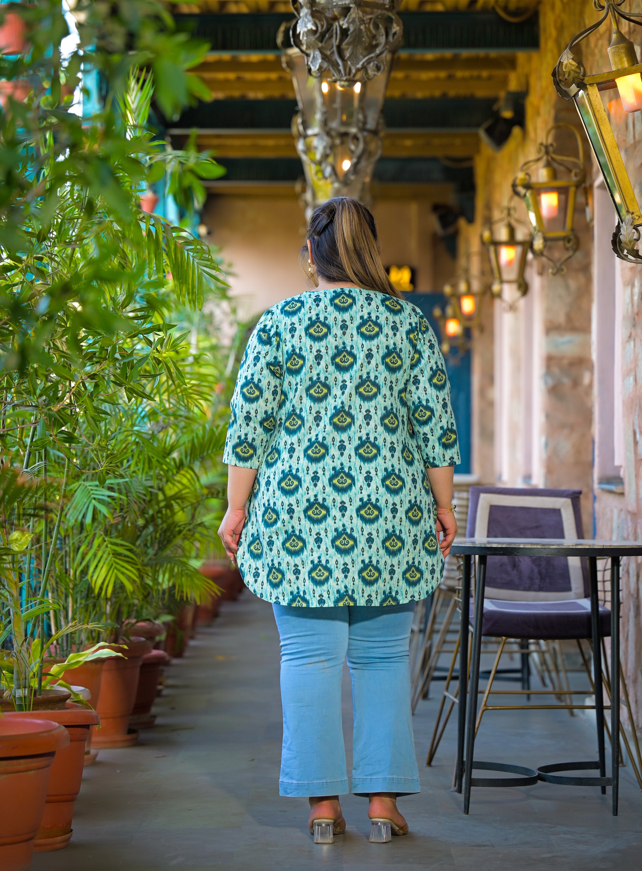 The printed pattern adds a trendy touch, while the short-length silhouette creates a flattering look. Easy to pair with jeans, trousers, or palazzos, this teal cotton top is ideal for daily wear, office wear, and casual outings.