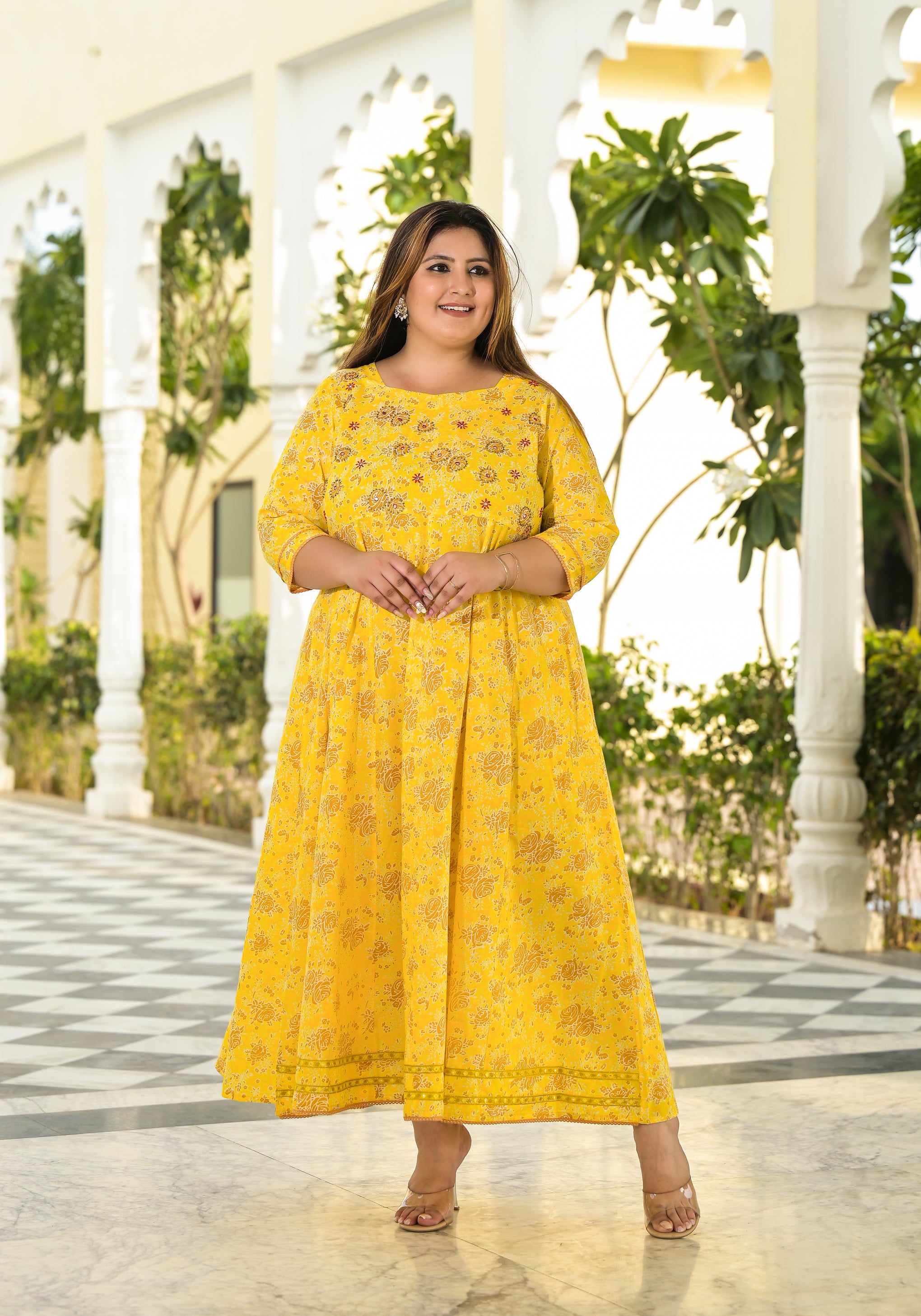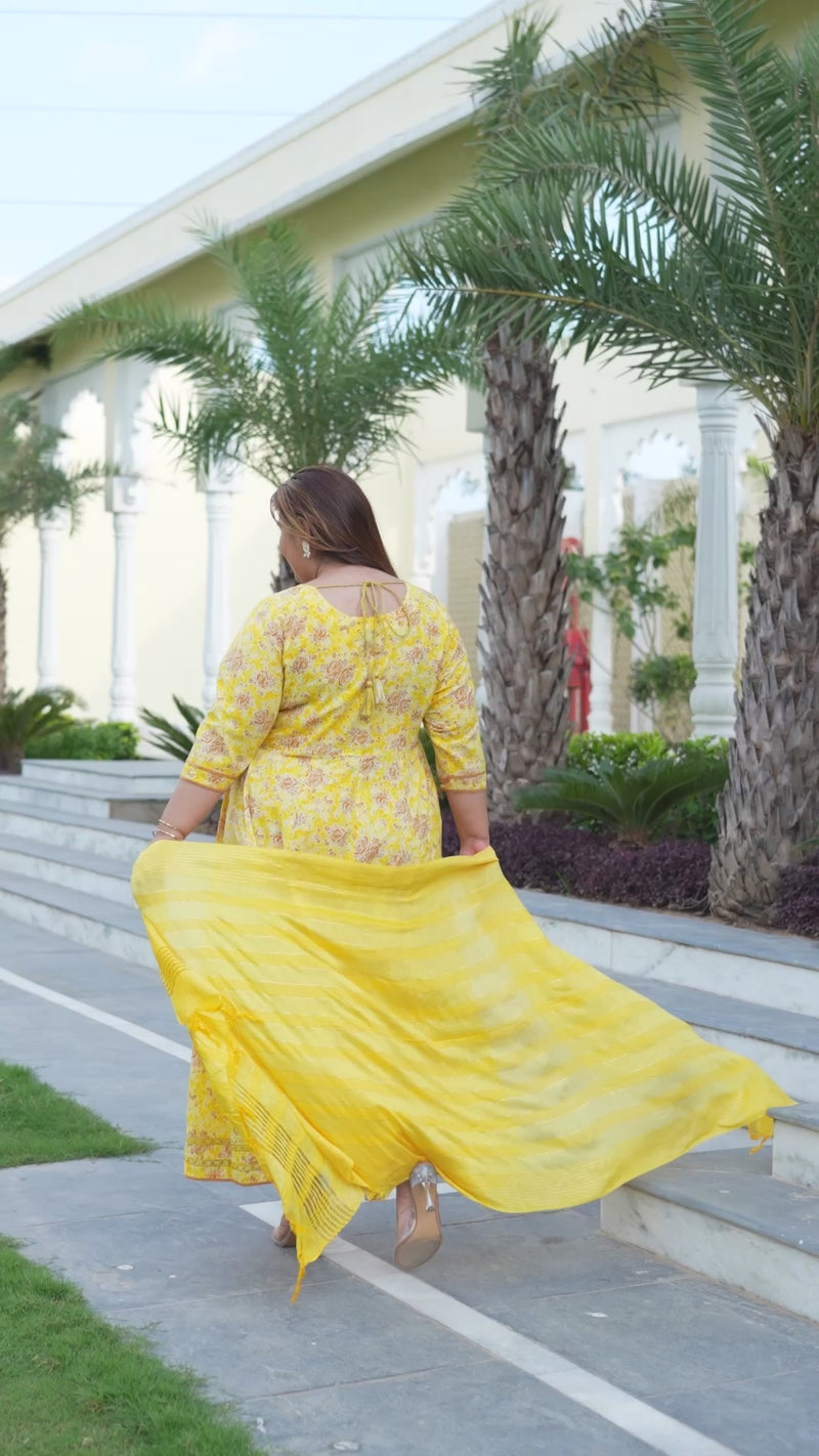 Add a touch of traditional elegance to your wardrobe with this Yellow Cotton Embroidered Anarkali With Dupatta Set. Made from soft and breathable cotton, this outfit features beautiful embroidery that enhances its ethnic charm. The three-quarter sleeves and round neckline offer a graceful silhouette, making it suitable for festive occasions, family gatherings, or special events.The set comes with a matching dupatta that completes the look with sophistication. Comfortable yet stylish, this Anarkali set is a perfect blend of classic design and modern comfort.
