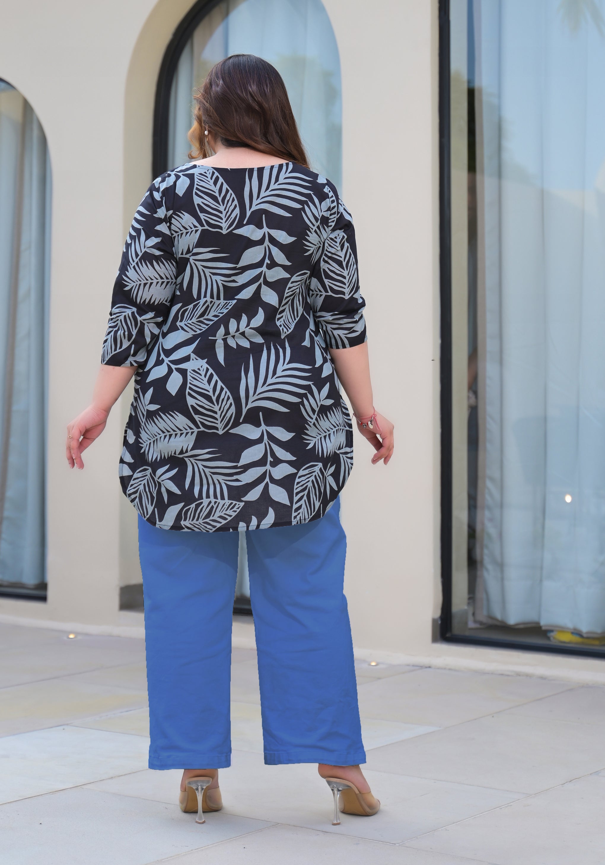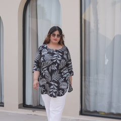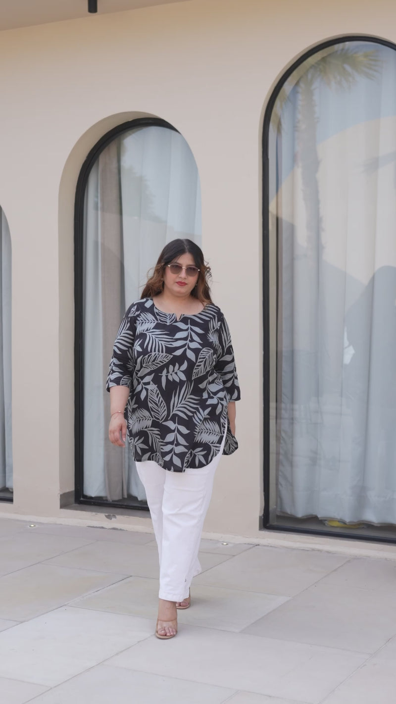 Elevate your everyday style with this elegant Cotton Black Leaf Print Top. Crafted from soft, breathable cotton, it features a bold monochrome leaf pattern that adds a modern and stylish touch. The relaxed fit, side slits, and 3/4 sleeves ensure maximum comfort, making it perfect for daily wear, office looks, or casual outings.