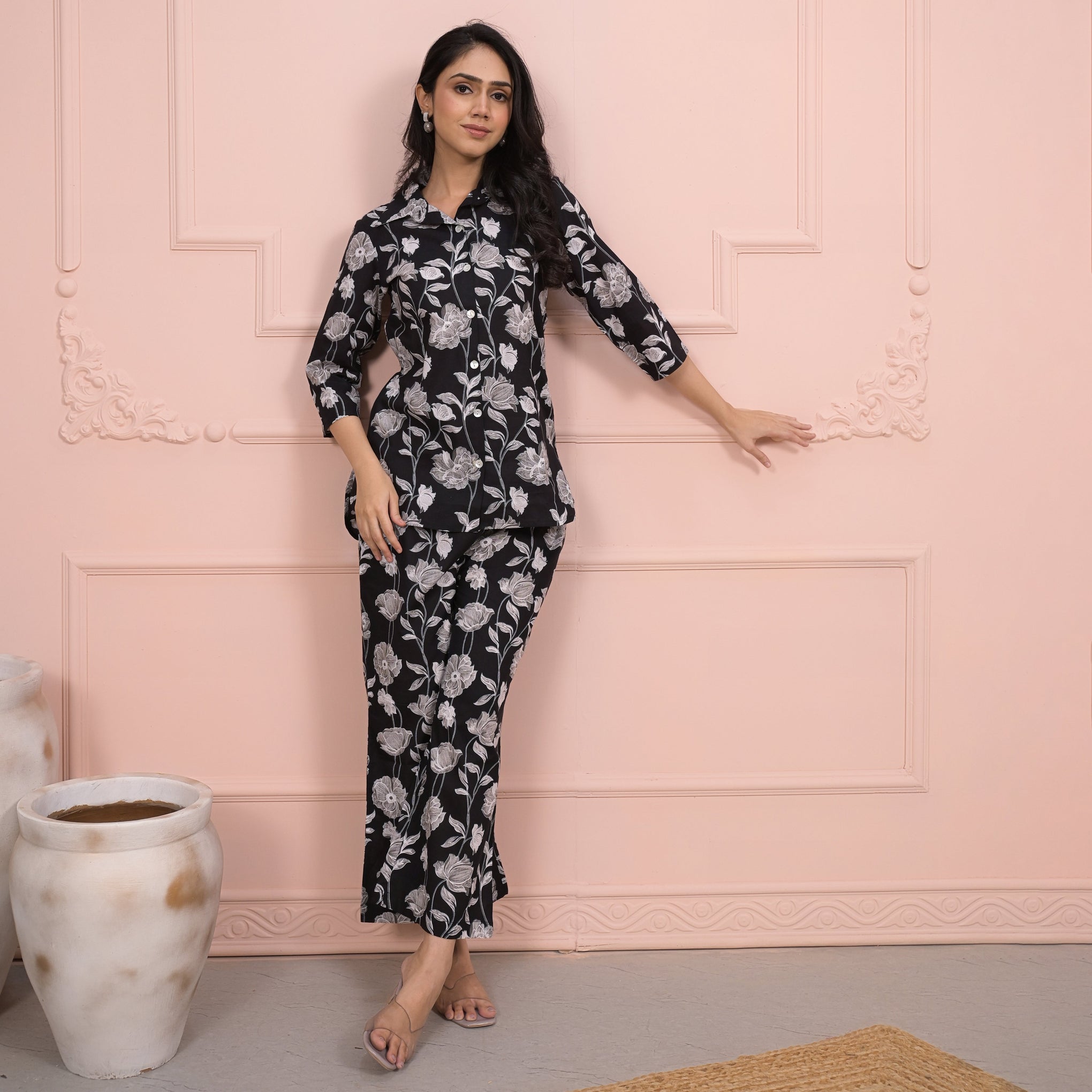 This black abstract print co-ord set in 100% cotton features a collar neck top with 3/4 sleeves and button closure, paired with wide-leg palazzo pants with pockets.