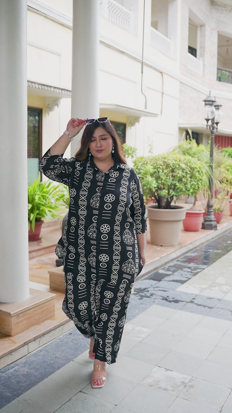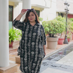 Add a touch of elegance to your wardrobe with this Black Rayon Printed Co-Ord Set, designed for comfort and style. Made from soft, smooth rayon fabric, it features a printed hip-length top with a smart collar neckline and three-quarter sleeves. The matching pant completes the look, offering a relaxed yet polished outfit perfect for casual outings, office wear, or daily use.