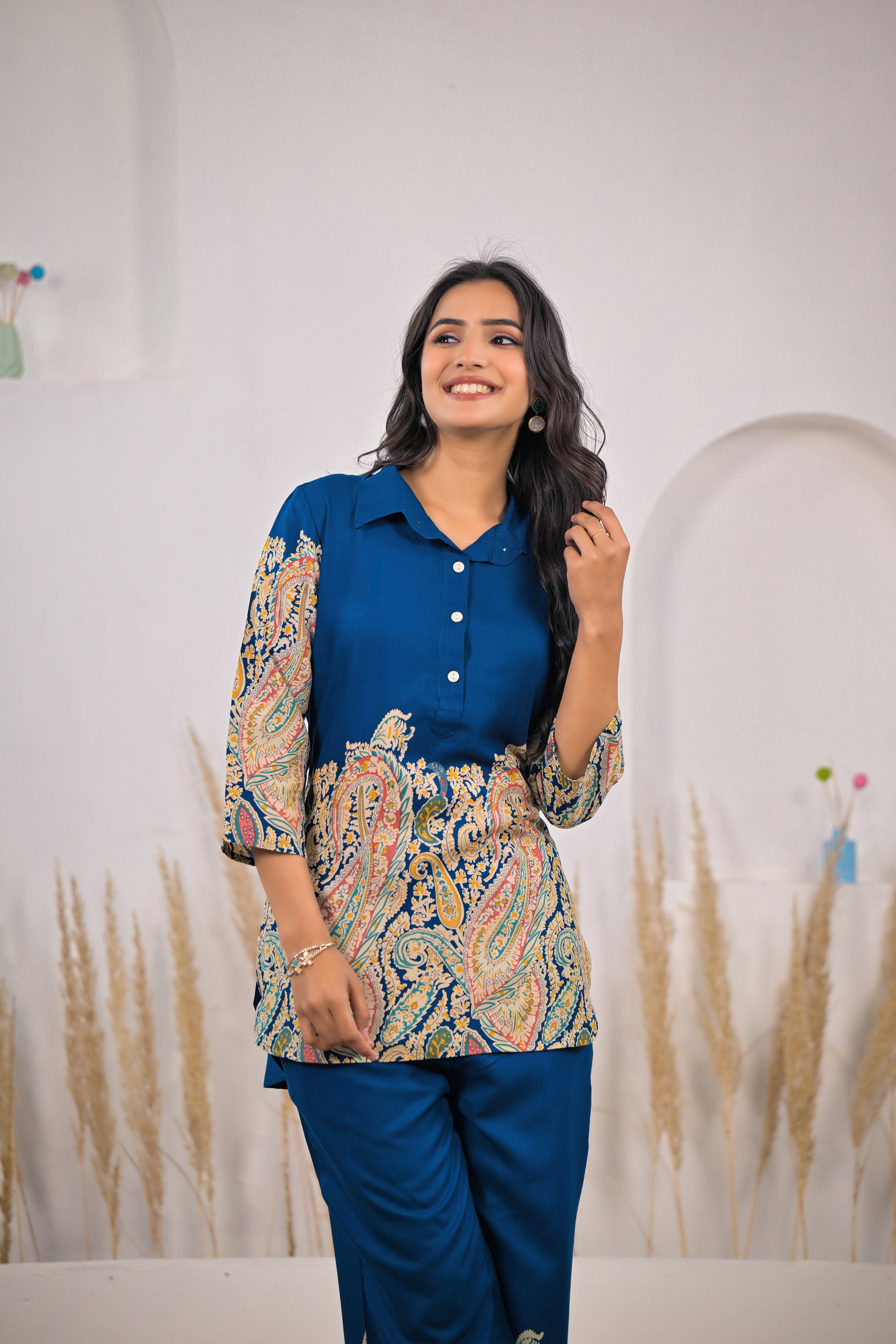 Elevate your everyday style with this elegant blue co-ord set crafted in soft rayon. Featuring a solid collared kurti with paisley-printed accents and matching straight pants, this set blends comfort with refined ethnic charm perfect for daily wear or relaxed outings.