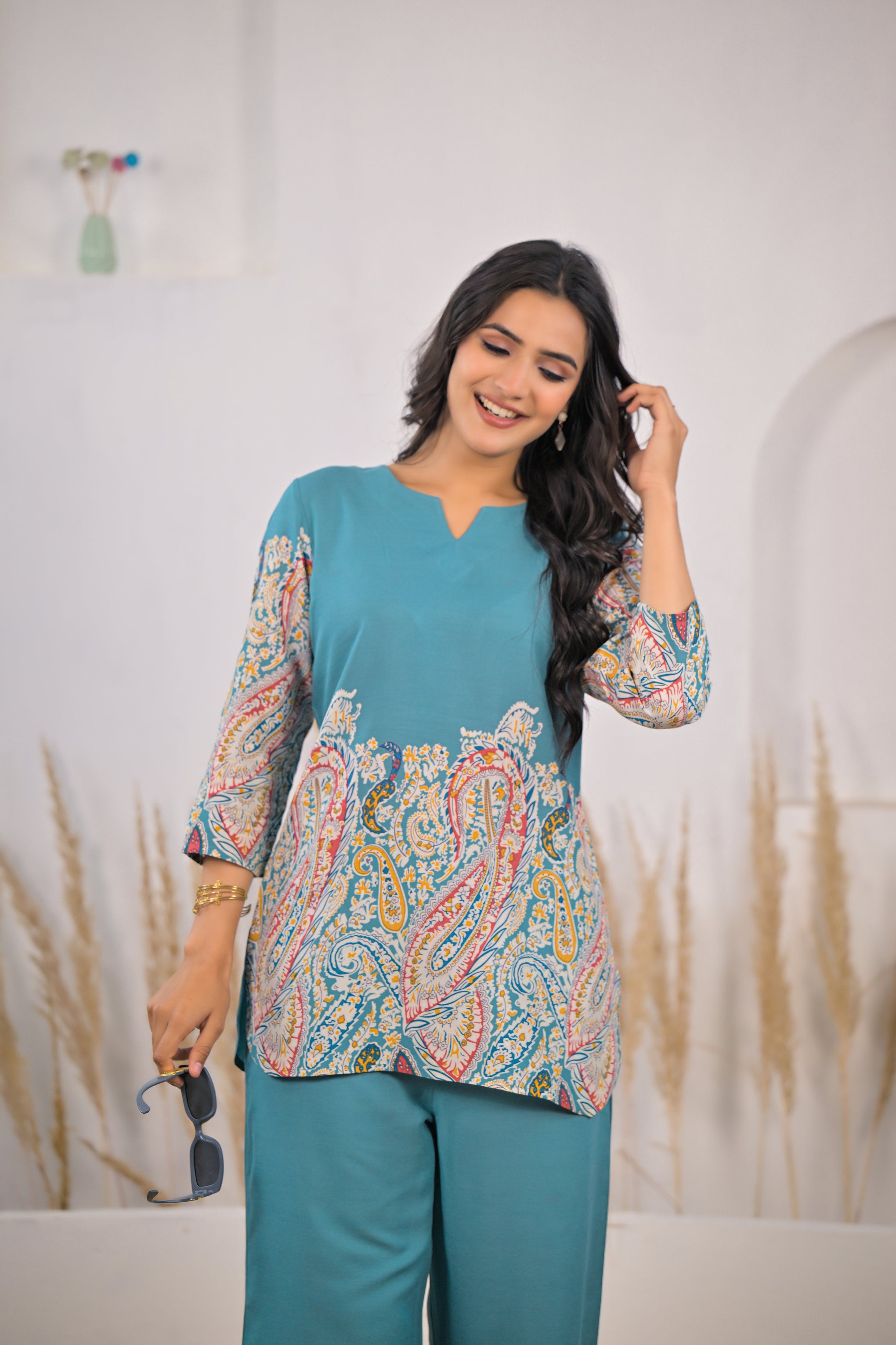 Step into effortless style with this turquoise co-ord set made from soft rayon fabric. The solid kurti features elegant paisley-printed sleeves and hem, paired with matching straight-fit pants for a comfortable yet refined everyday look.