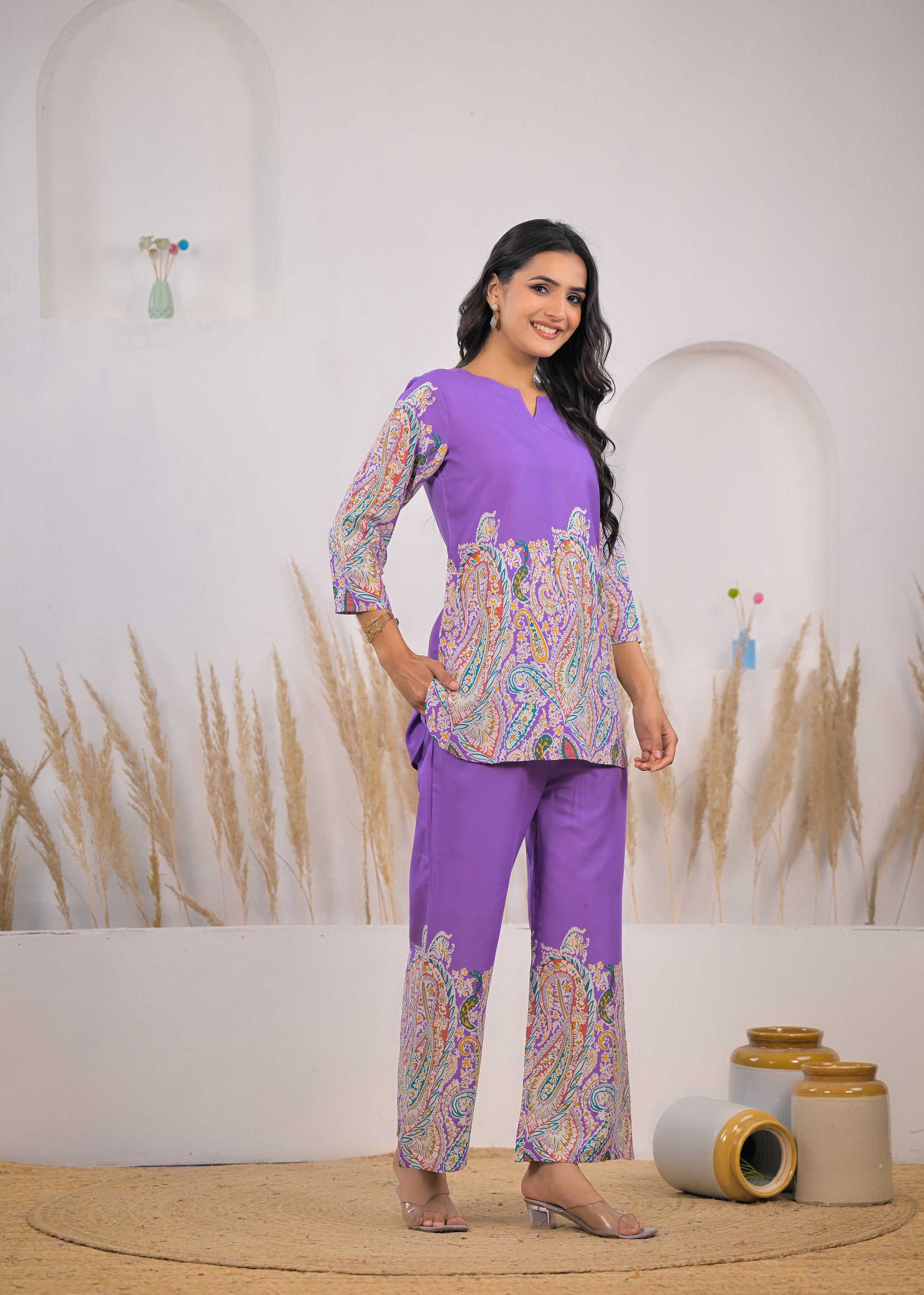 Add a vibrant touch to your everyday wardrobe with this violet co-ord set crafted from soft rayon fabric. The solid kurti is enhanced with elegant paisley-printed sleeves and hem, paired with matching straight-fit pants for a stylish yet comfortable look.
